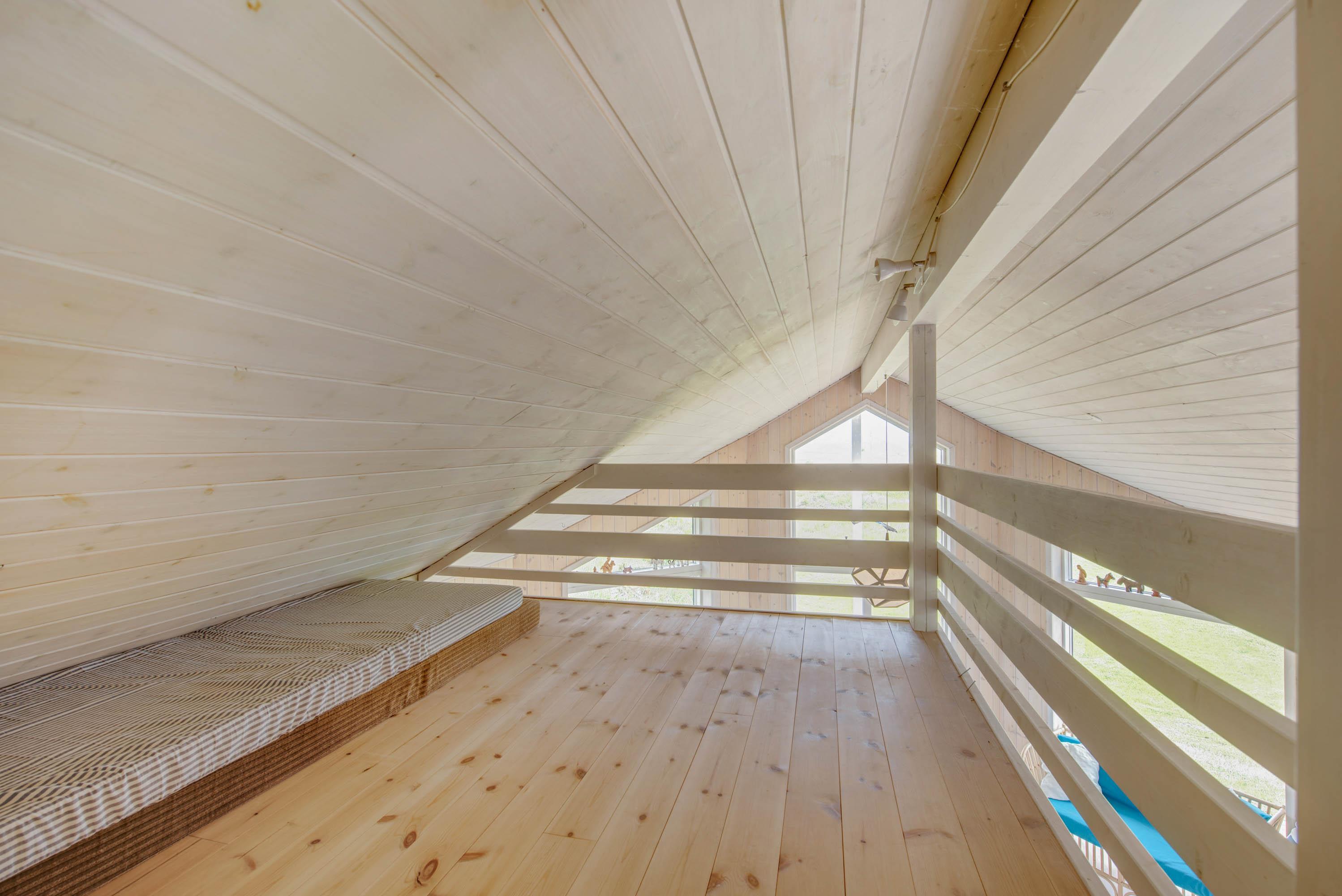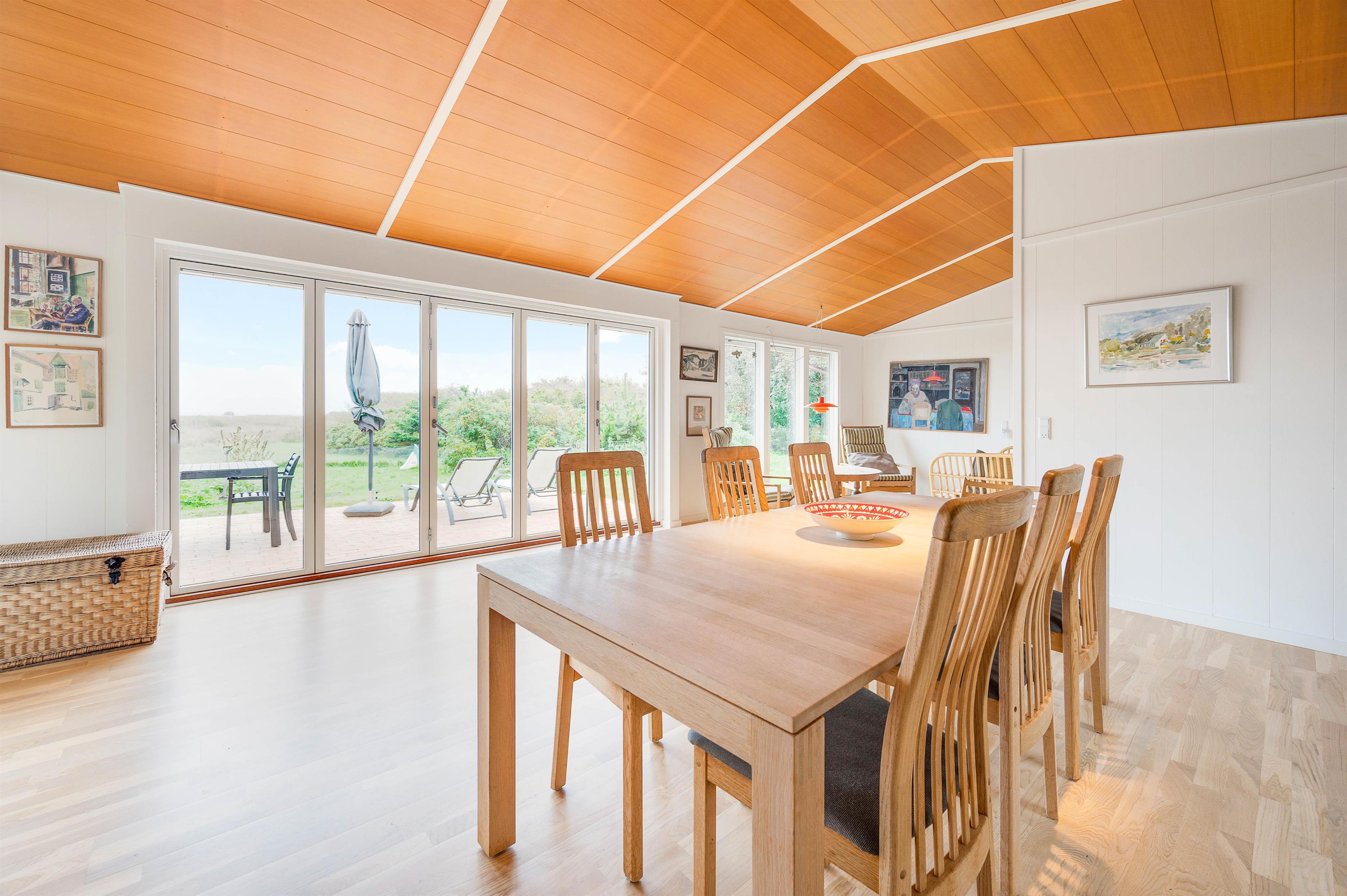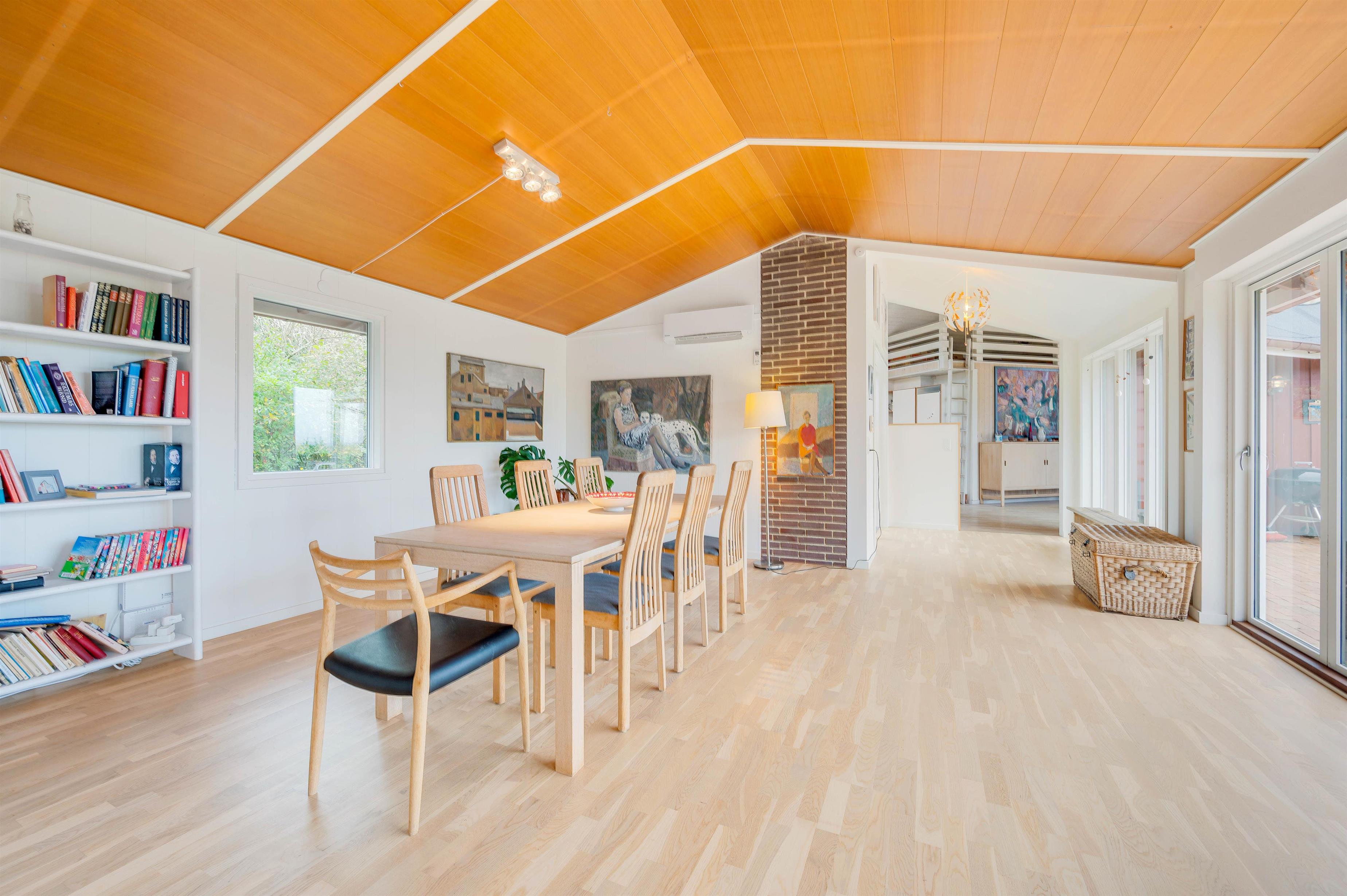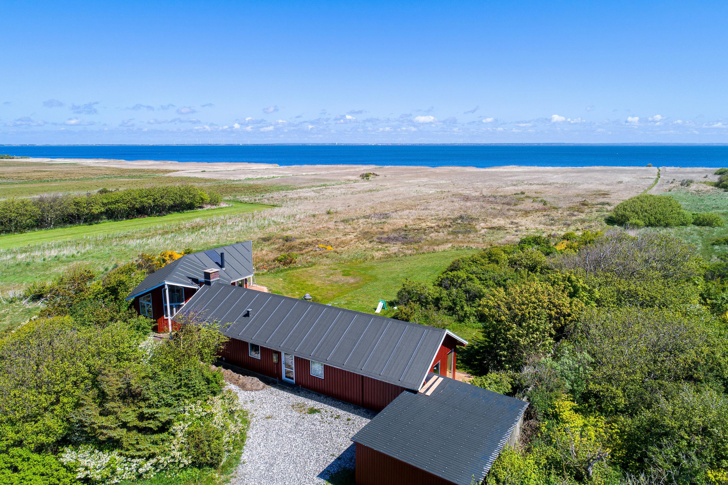 Det røde sommerhus overrasker med den gennemtænkte ruminddeling og åbne konstruktion. Dette gør, at der fra både stue, køkken og spisestue er en fantastisk udsigt over det åbne landskab og fjorden. Den tidlige morgensol strømmer ind ad den store vinduesfront og uanset hvor du befinder dig ånder det af fred og ro mod øst.