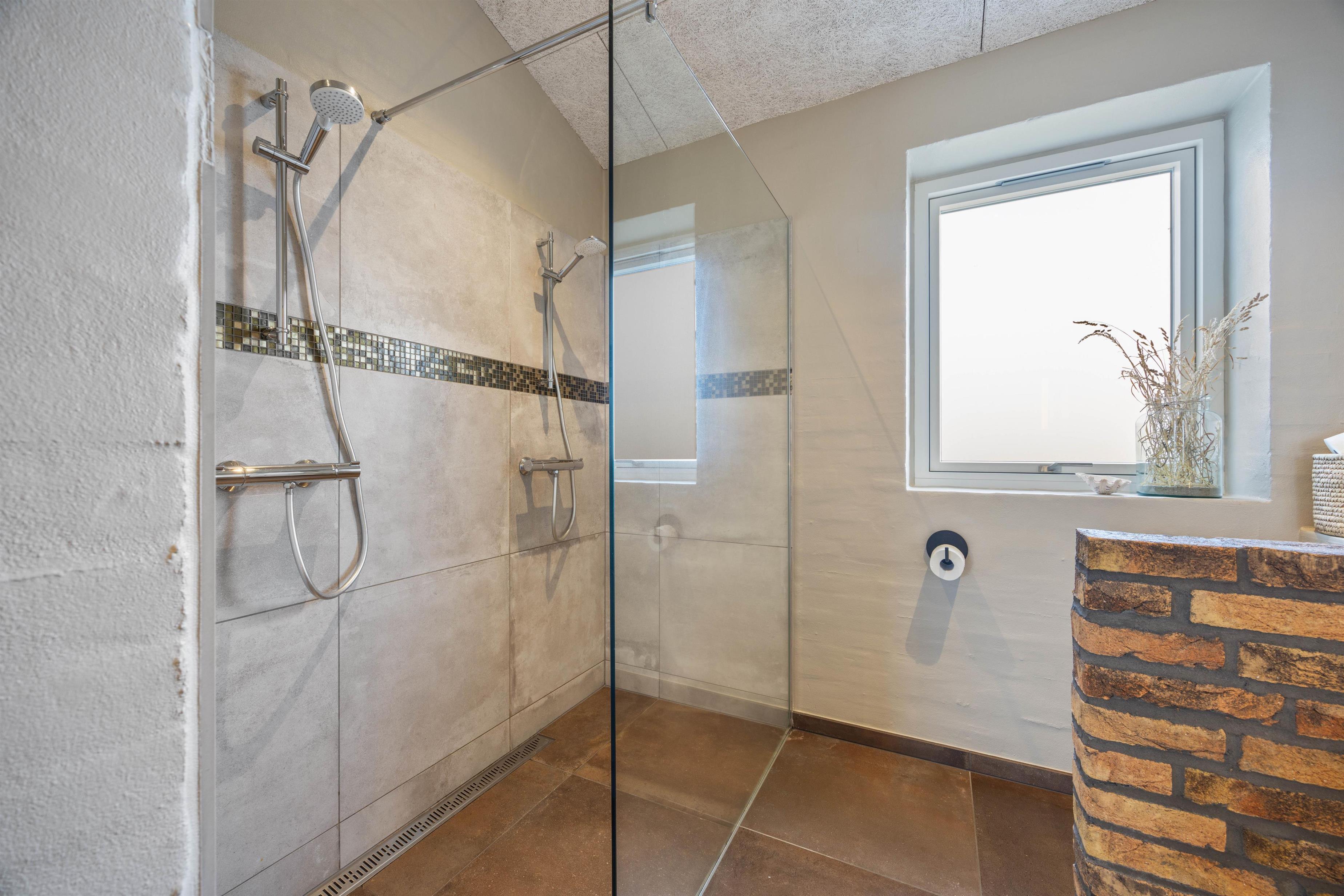 Sovepladserne er fordelt i to afdelinger – en mod vest og en mod øst, begge med et badeværelse med gulvvarme tilknyttet. Det ene af badeværelserne gemmer også på en af feriehusets wellness-highlights: Jeres helt eget dampbad!