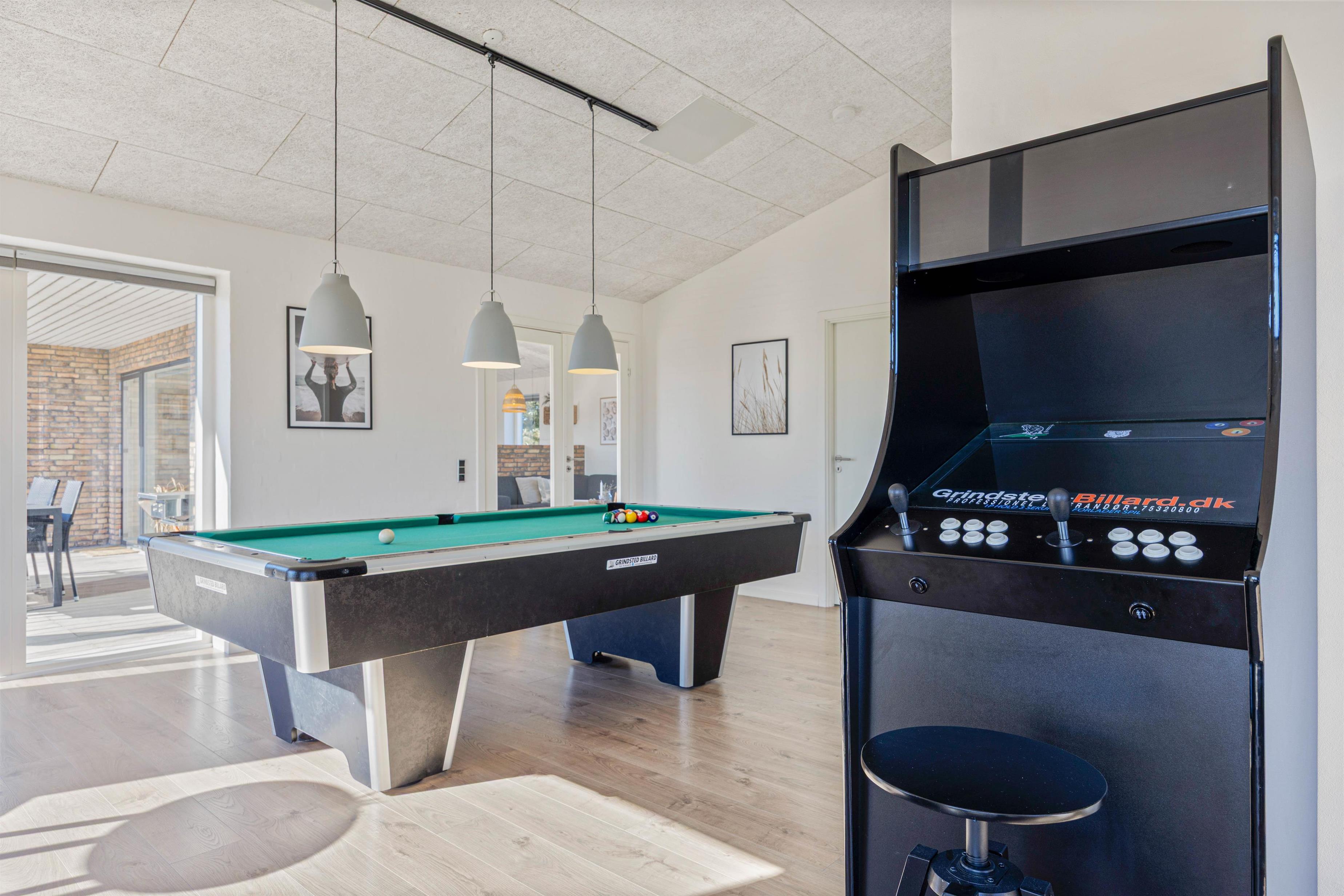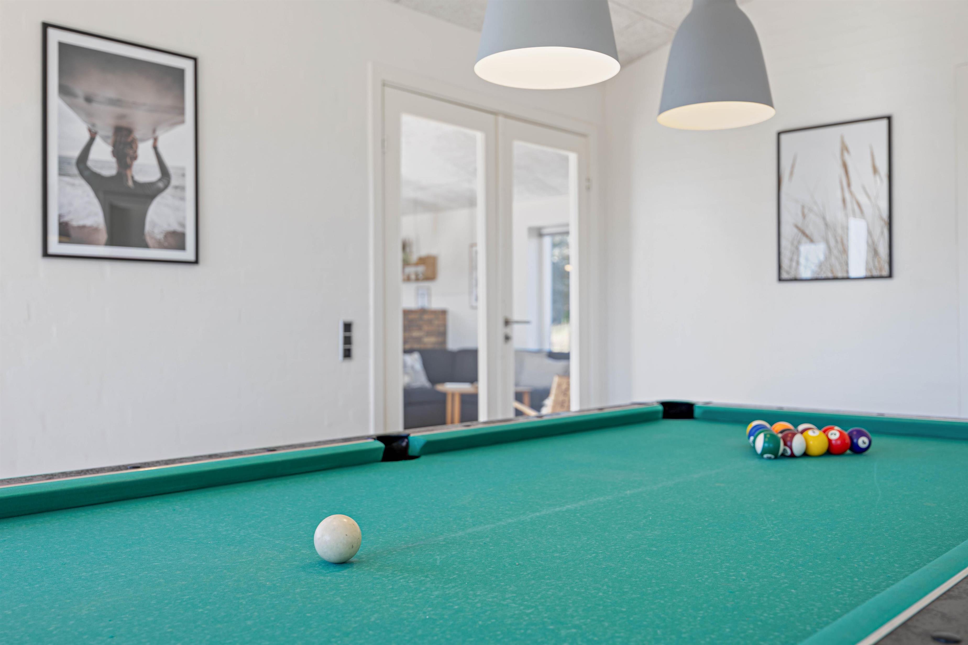 Feriehusets centrum og hjerte er det stilfulde opholdsrum, der kombinerer både køkken, spiseafdeling og stue i ét. Og ved siden af det, finder I aktivitetsrummet med billardbord, der med sikkerhed bliver omdrejningspunktet for mange hyggelige feriestunder med billardturneringer - og den knitrende ild i brændeovn i baggrunden.