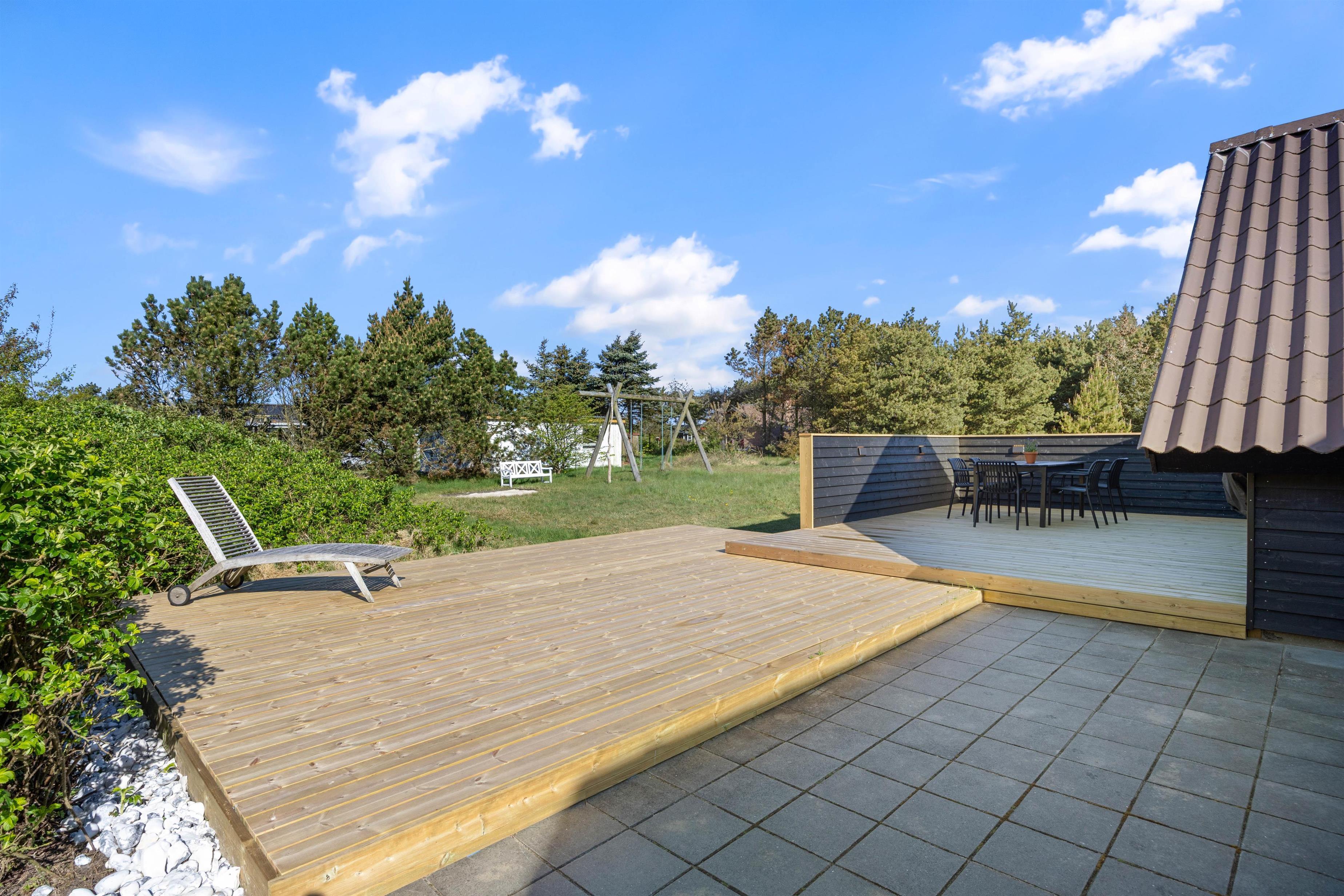 Udendørs venter en dejlig naturgrund, hvor både børn og voksne kan nyde ferien. De yngste vil elske at lege i sandkassen eller tage en gyngetur, mens de voksne kan slappe af i havemøblerne på terrassen. Terrassen er delvist overdækket og afskærmet – perfekt til grillmiddage og aftenhygge, uanset vejret.