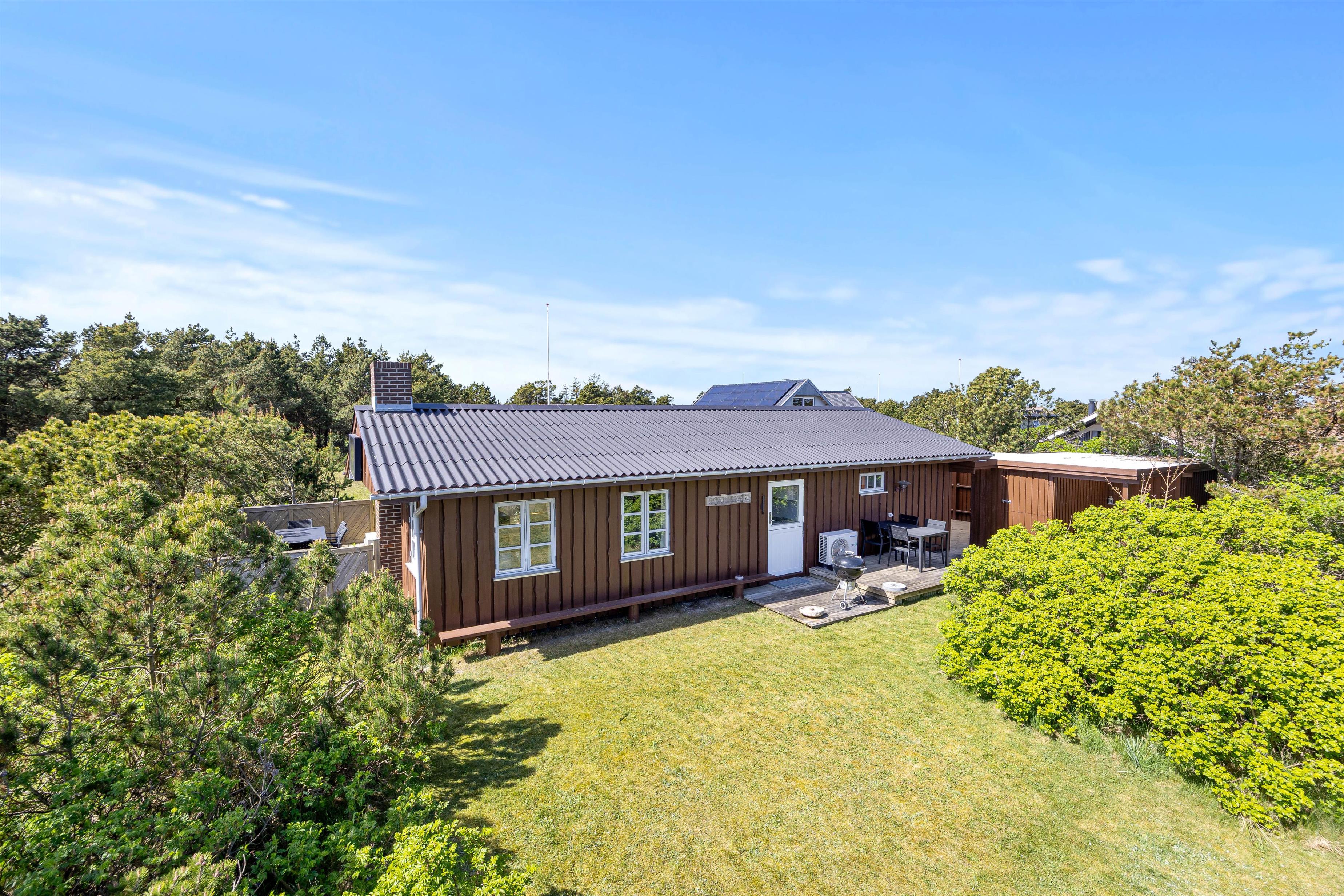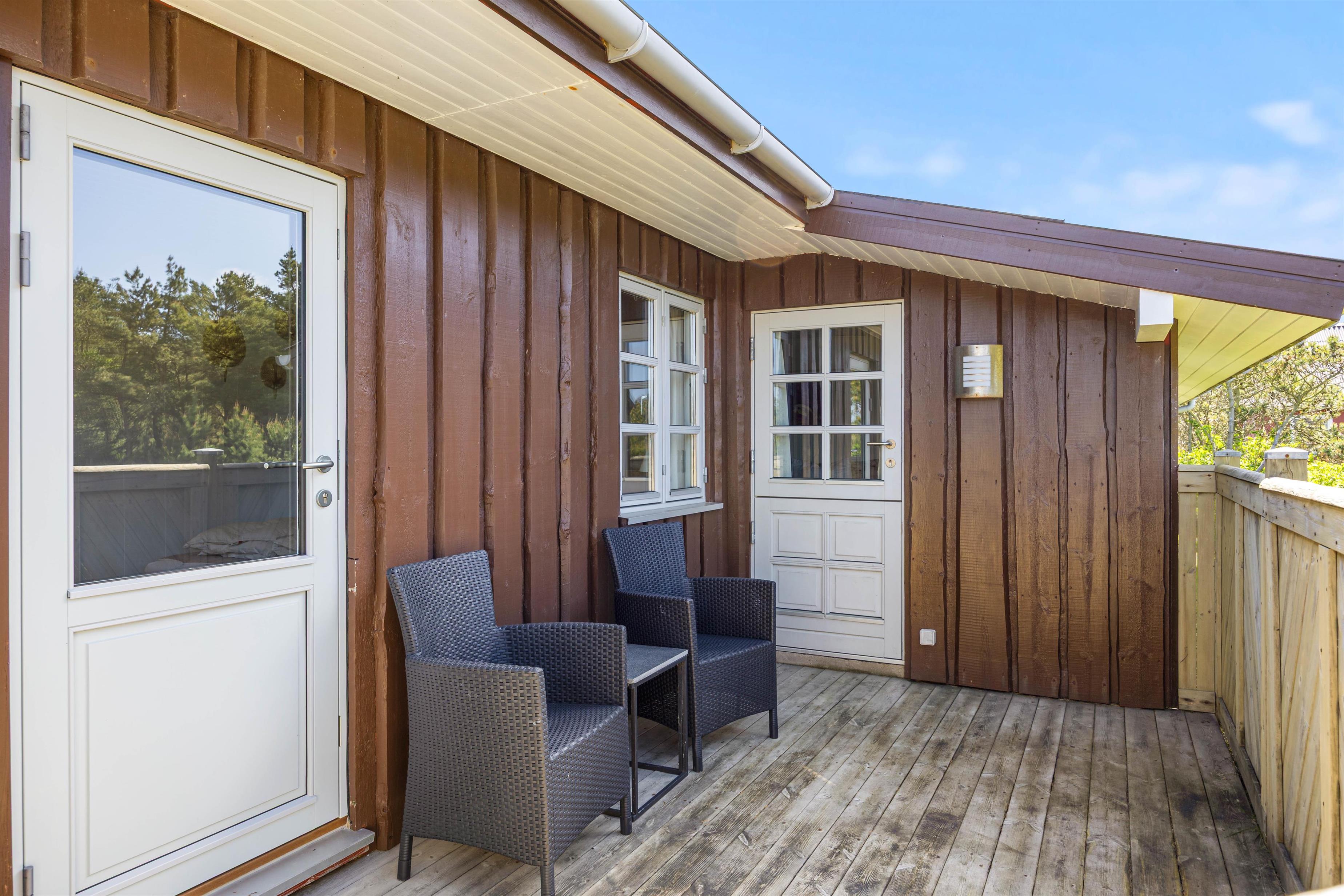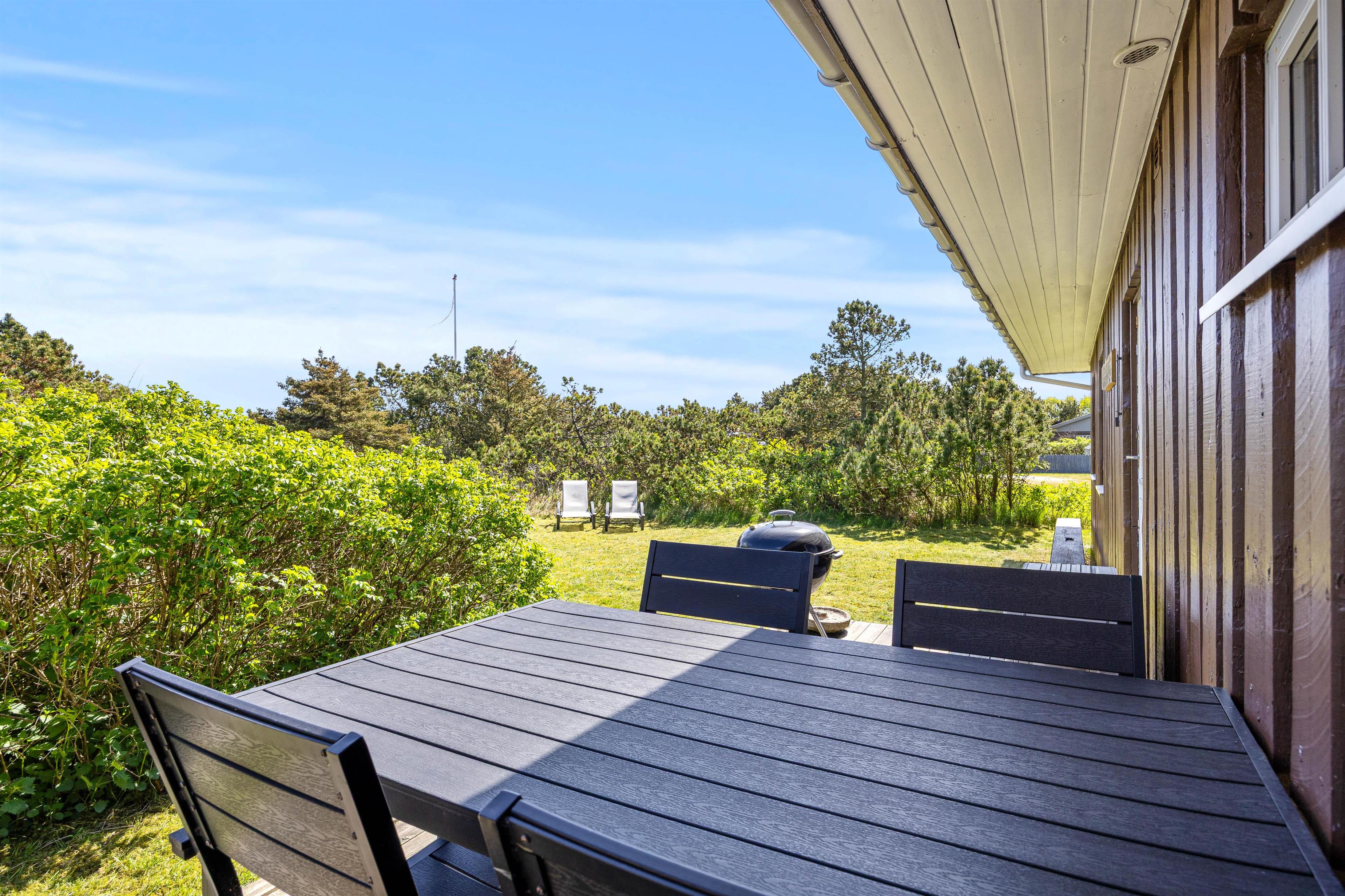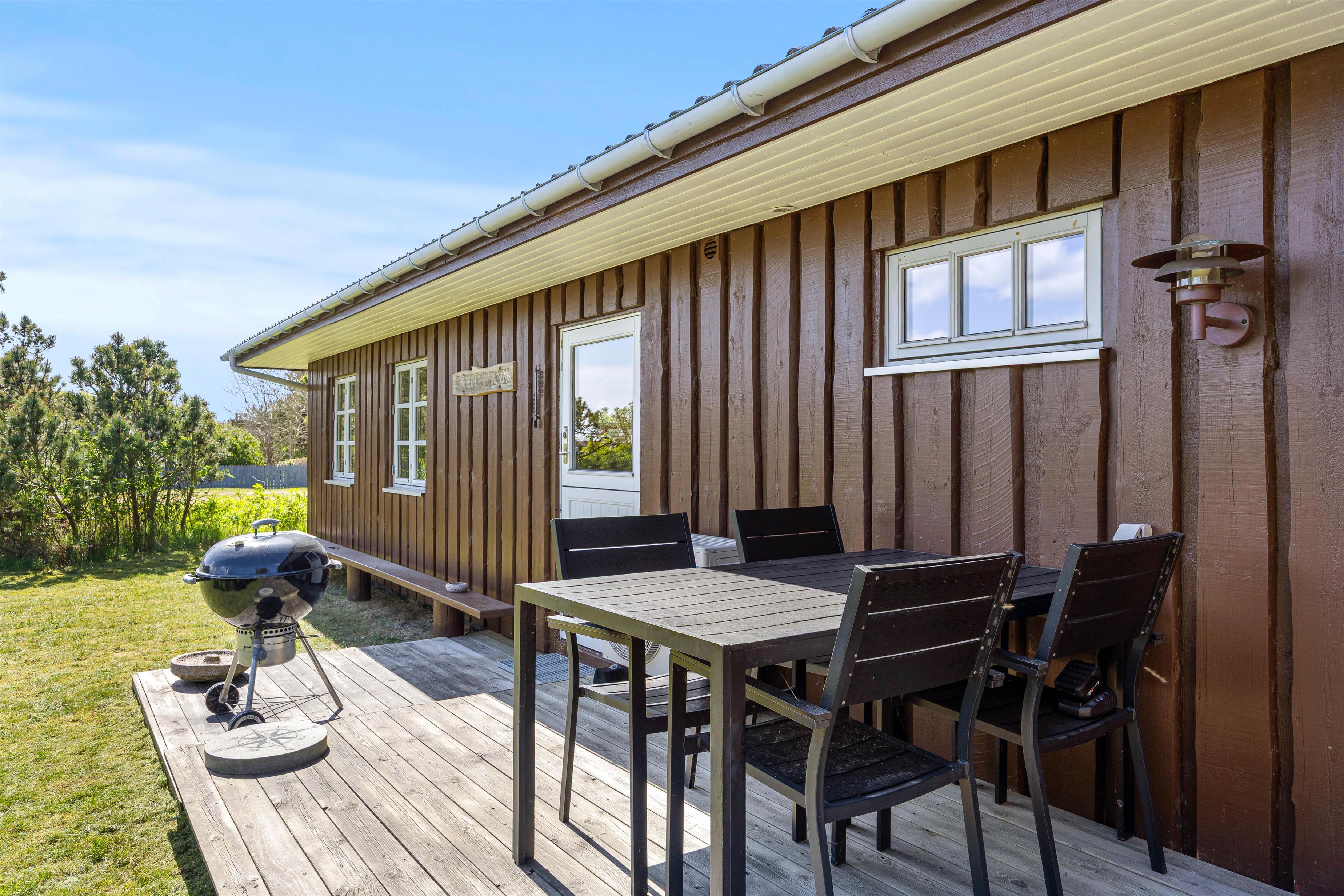 Udendørs byder sommerhuset på en dejlig lukket terrasse med havemøbler og grill – ideel til både morgenkaffen og lange sommeraftener med aftensmad under åben himmel. Her kan I læne jer tilbage i ro og mag, mens børnene leger på den grønne plænegrund. Den lukkede terrasse er også et trygt sted for hunden at opholde sig.