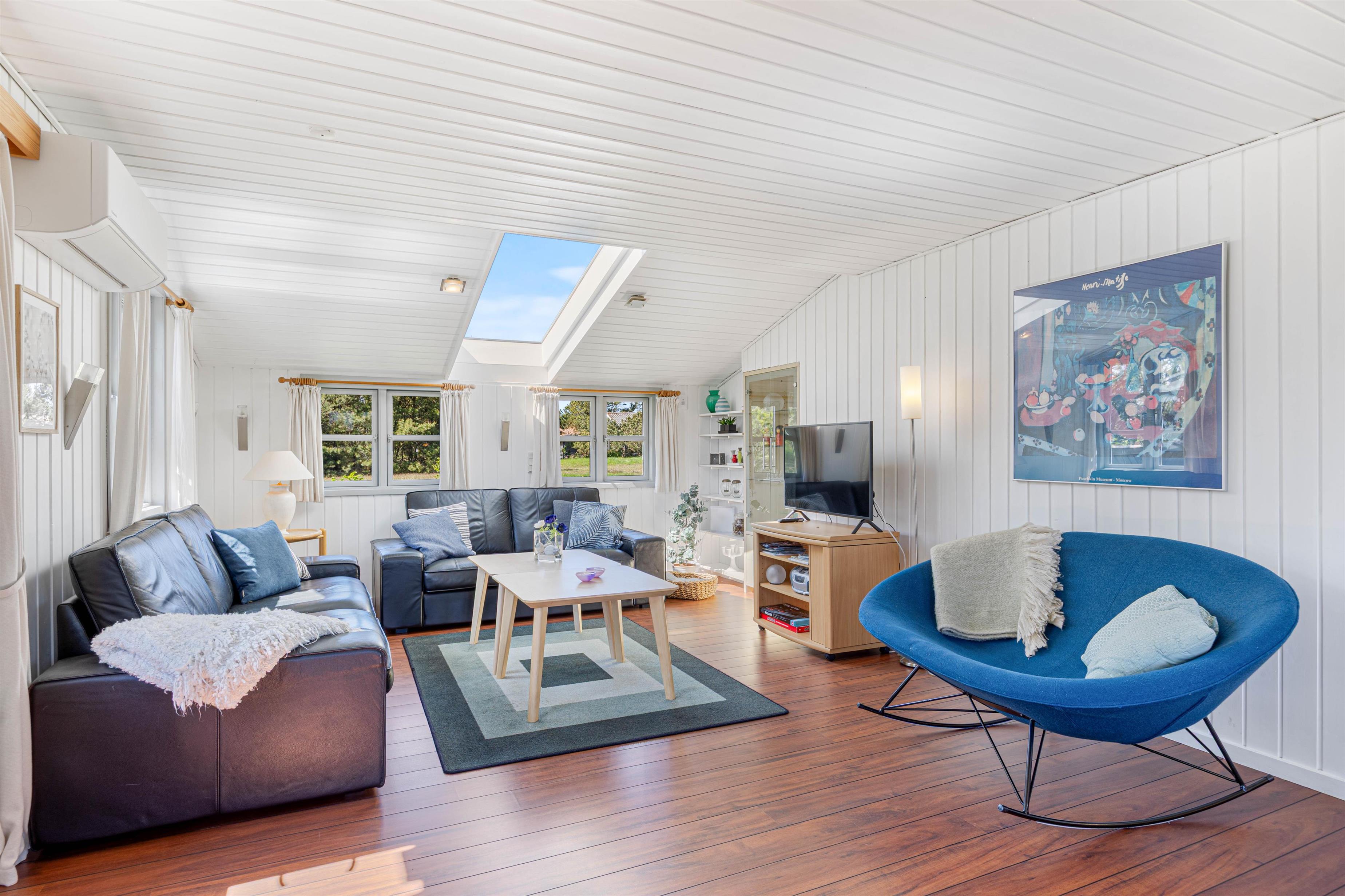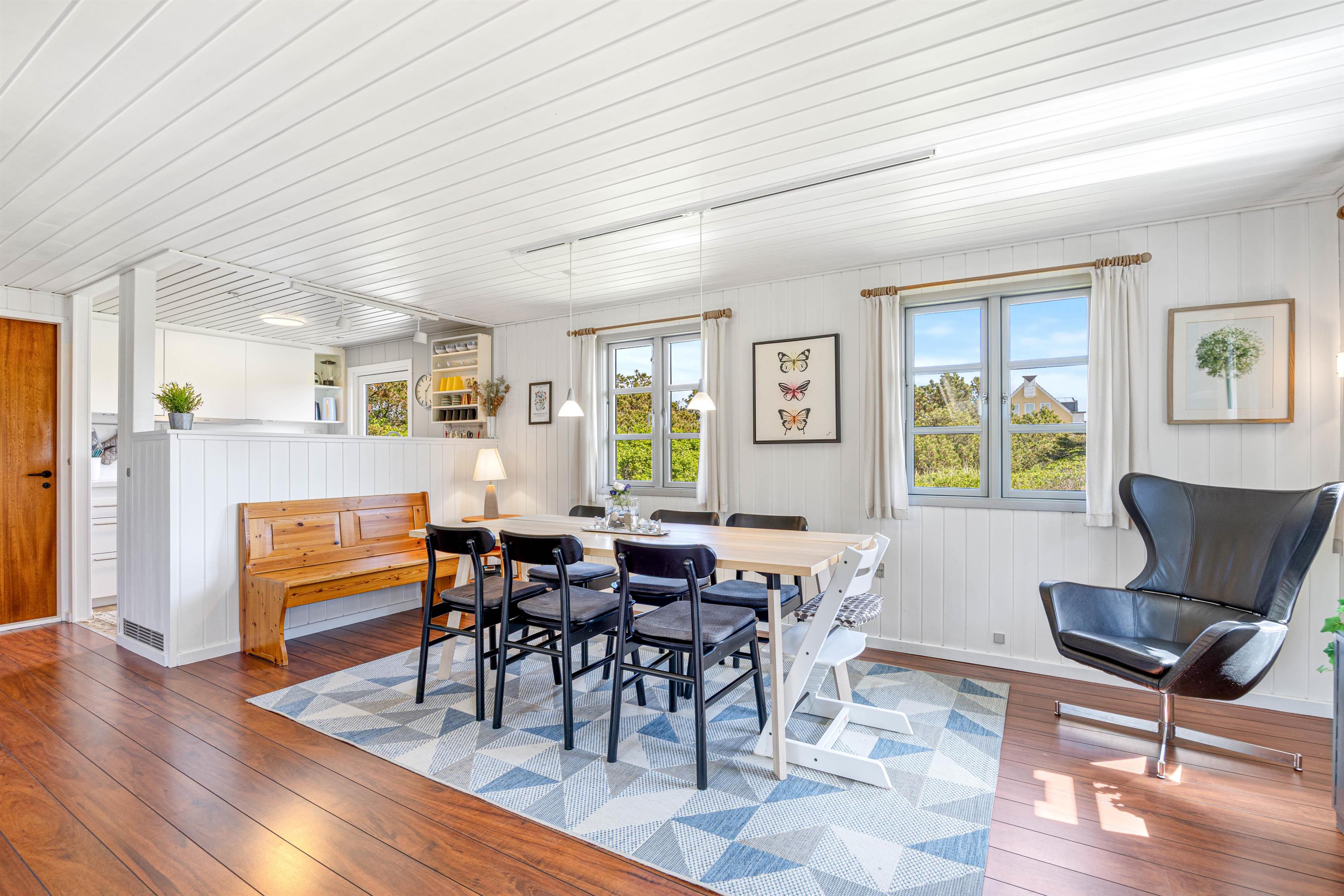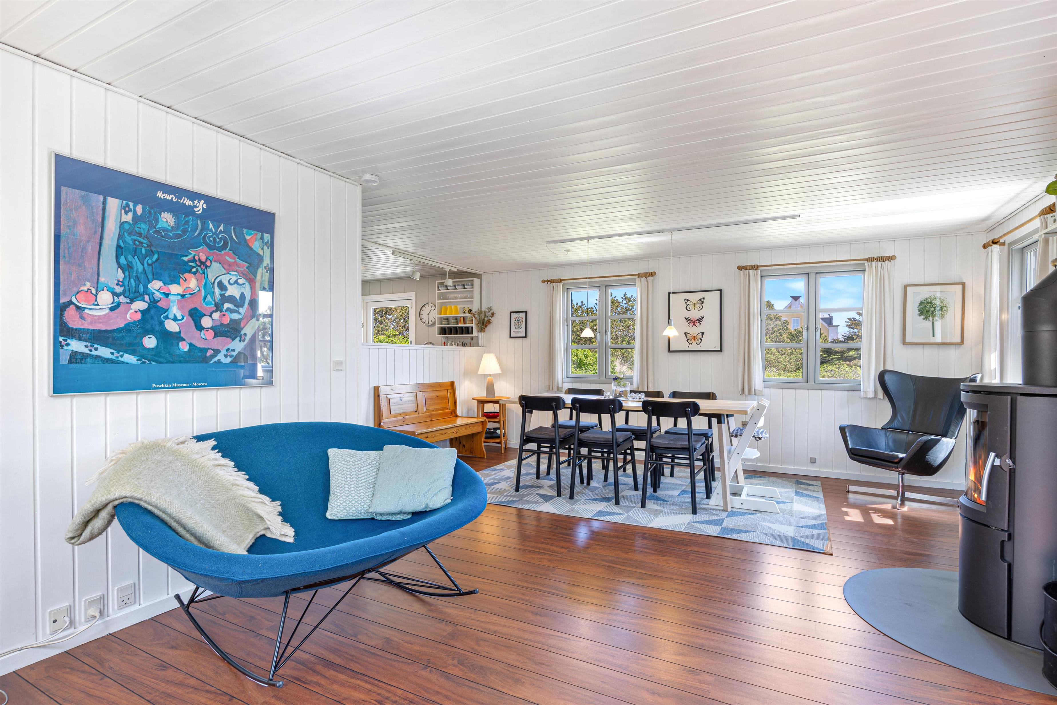 Stuen er det naturlige samlingspunkt i sommerhuset, hvor I kan tænde op i brændeovnen og slappe af i de bløde møbler eller læse en god bog. Herfra er der åben forbindelse til spisepladsen og det veludstyrede køkken med opvaskemaskine og direkte udgang til terrassen.