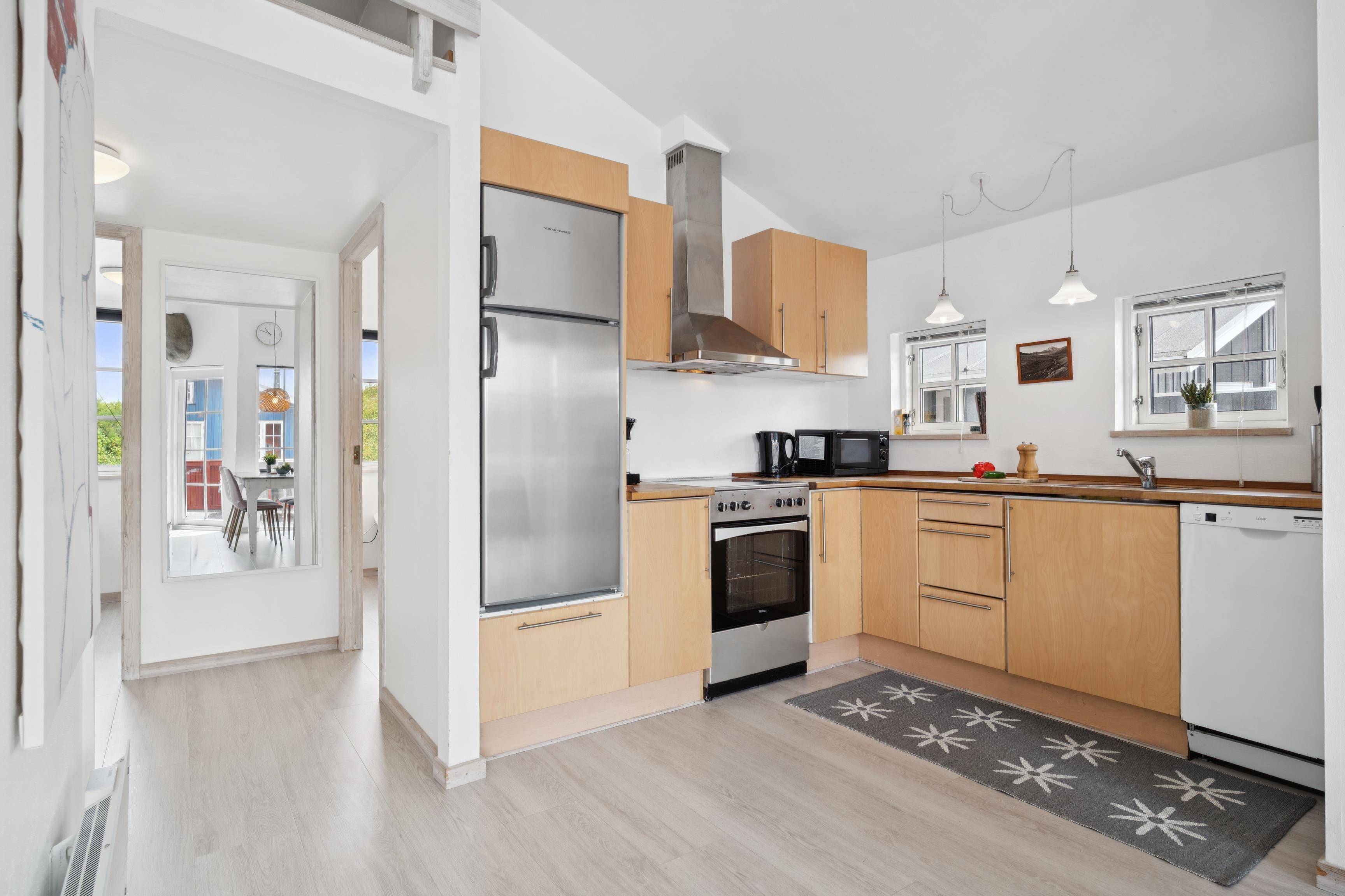 Huset har tre soveværelser, to med dobbeltsenge og et med køjeseng, plus et loft med ekstra soveplads. Det åbne køkken-alrum skaber en hyggelig atmosfære – perfekt til at tilbringe tid med familie, venner eller bare jer to. Nyd varmen fra brændeovnen på kølige aftener og lyt til knitren af ??brænde, når flammerne blusser op. Badeværelset har bruser, gulvvarme og et dejligt spabad til to personer, hvor I kan slappe af og koble fra. Fra stuen har I direkte adgang til en 50 m² stor terrasse mod både øst og syd. I kan nyde solen på liggestolene næsten hele dagen lang. Et stort bord og en komfortabel sofagruppe er til rådighed til aftener udendørs med familie eller venner.