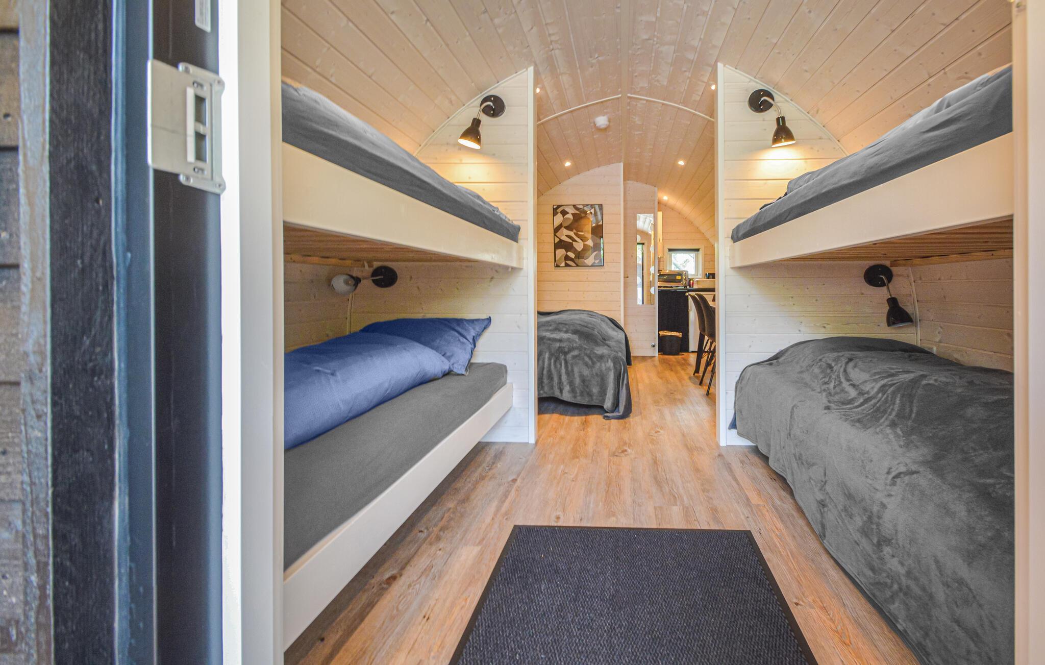 Tøndehytterne er godt indrettet med 2 køjesenge, 1 dobbeltseng, spisebord med 6 stole samt køleskab med fryser, miniovn og elkeddel. Og et badeværelse med bruser. Lejeprisen er inkl. Forbrug.