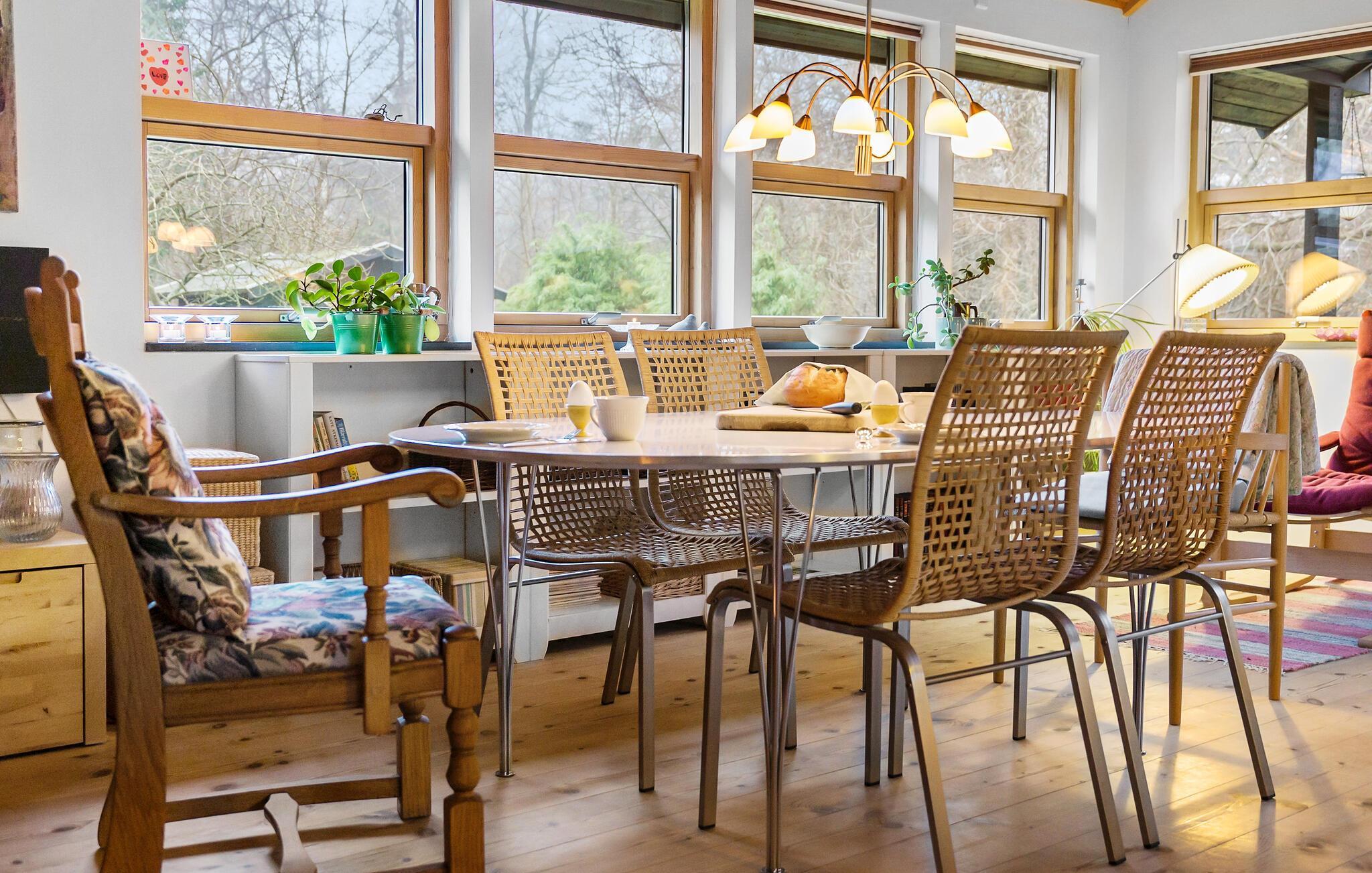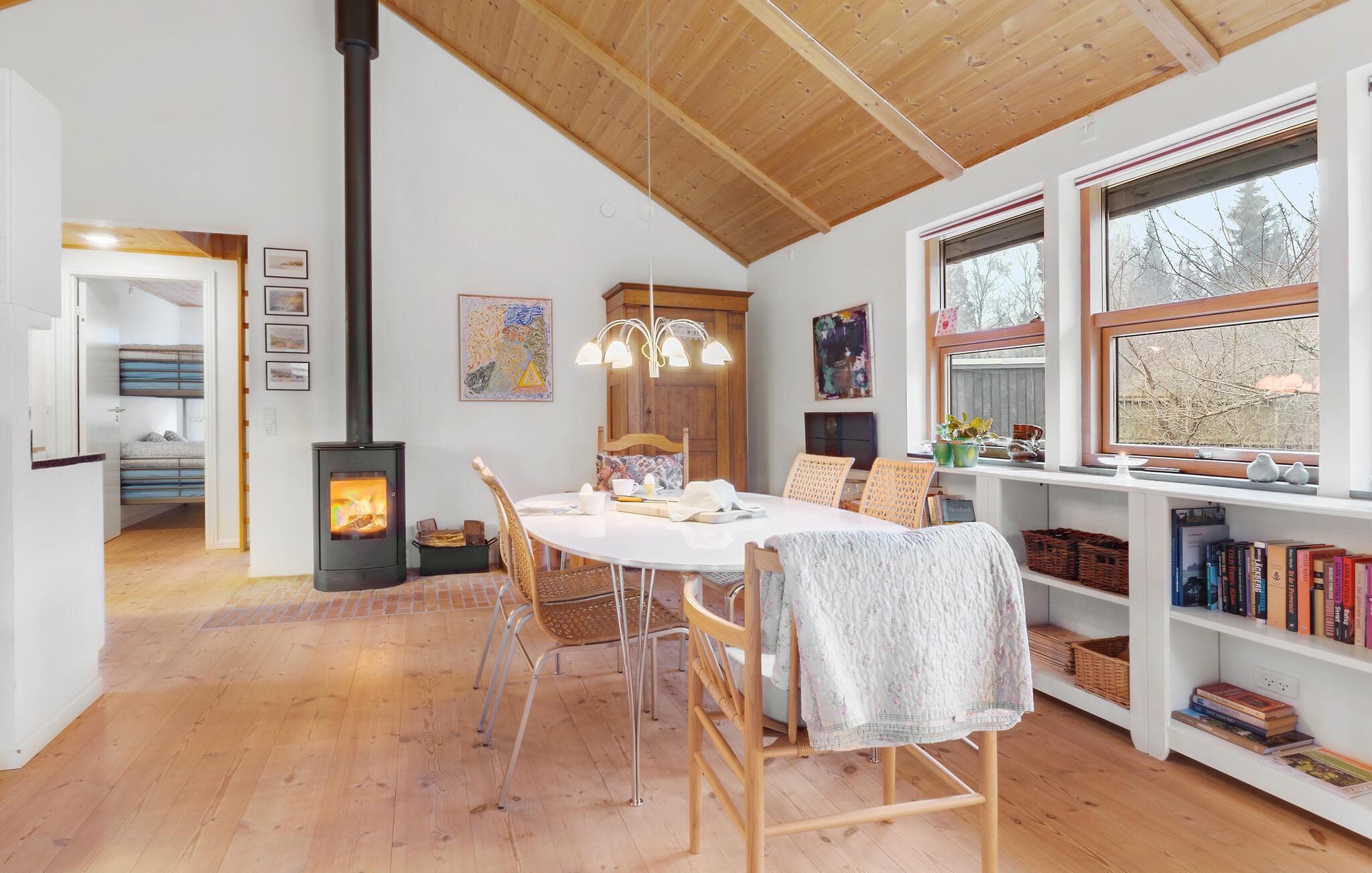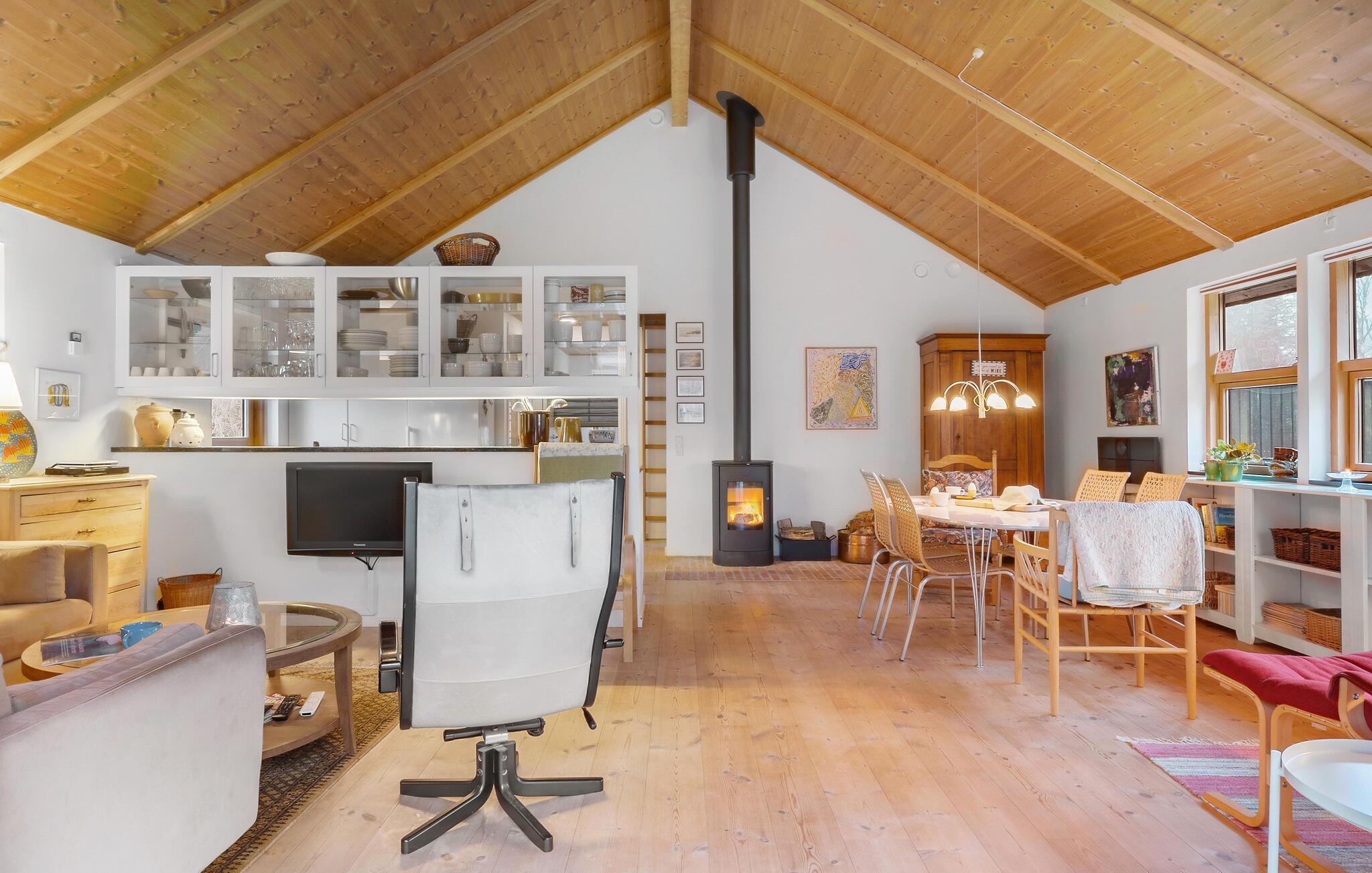 Forkæl jer selv med en pause fra hverdagen og glæd jer til et allelunde vidunderligt ophold i dette attraktive feriehus. Indretningen er både rummelig, flot og hyggelig; i det store opholdsrum er der loft til kip med tydelige træpaneler, der sammen med den kærlige udsmykning danner en virkelig rar atmosfære, hvor I kan hvile stængerne og bruge meget god tid sammen. Fyr op i brændeovnen, kræs om madlavningen i det veludstyrede køkken, nyd måltiderne ved spisebordet og lad en skøn feriedag gå på hæld med en hyggelig filmaften i de komfortable sofaer.