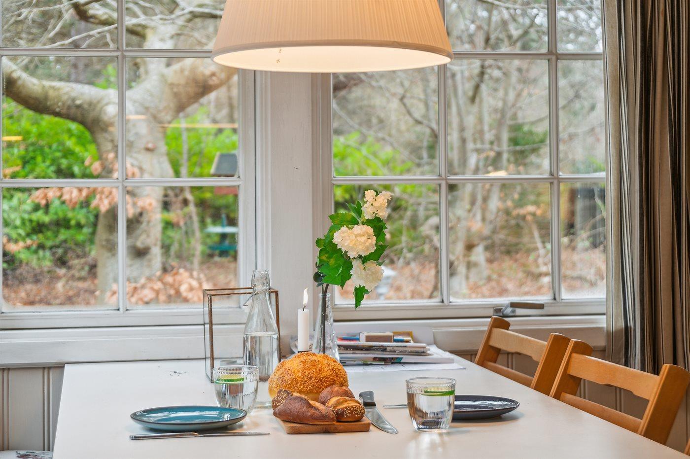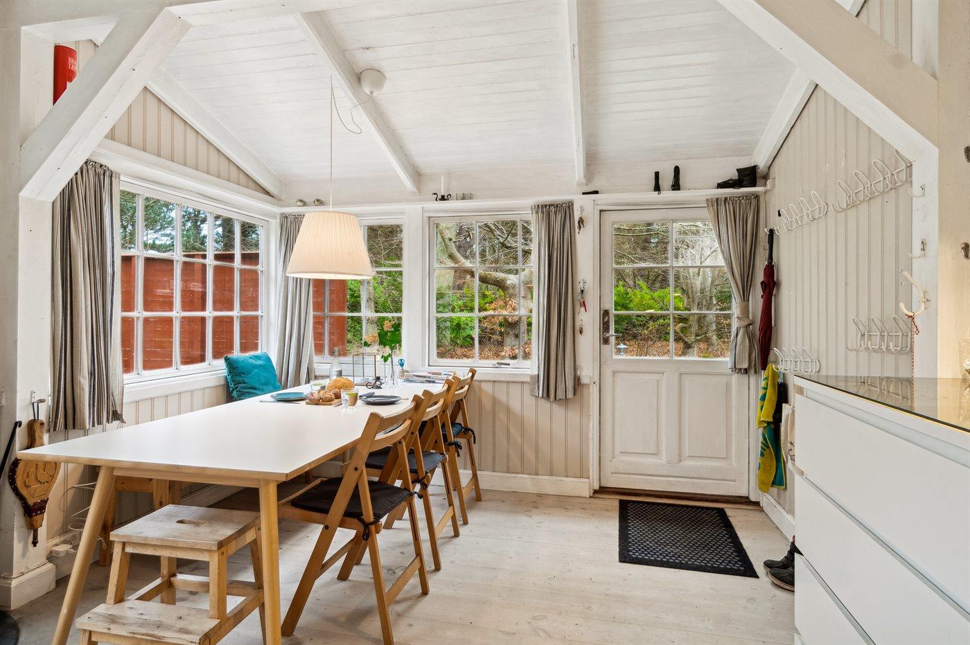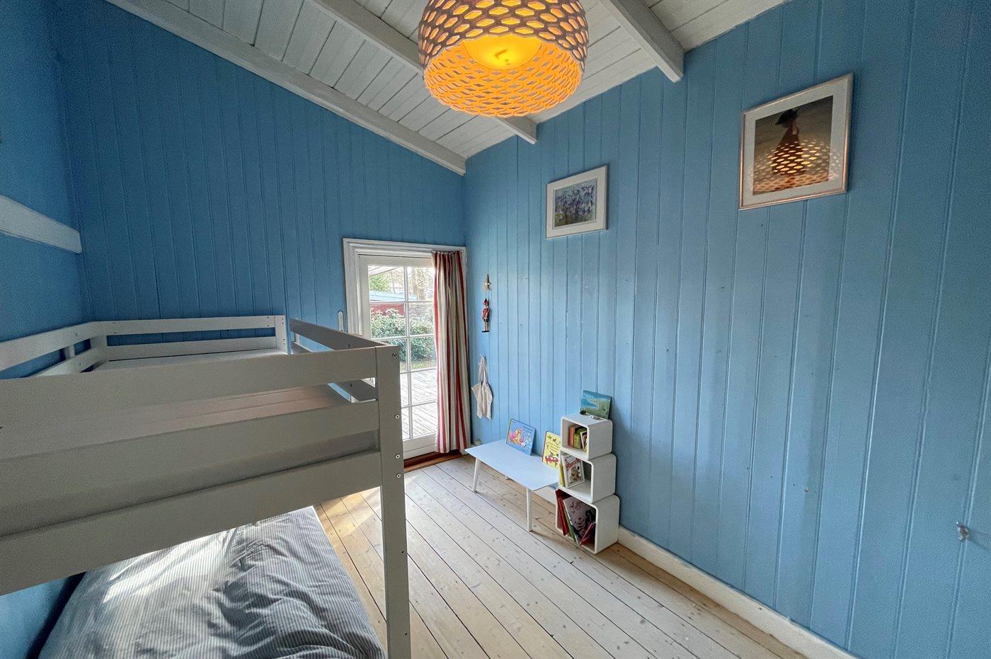 Det store alrum med køkken, stue og spiseplads og med udgang til den nordvendte terrasse er sammen med den sydvendte terrasse med elektrisk markise de naturlige samlingssteder for hygge og samvær. Huset er lyst og luftigt takket være de store, sprossede vinduespartier og den store loftshøjde. Der er 3 soveværelser med hver 2 sovepladser. Badeværelset er med bruseniche og der er vaskemaskine.