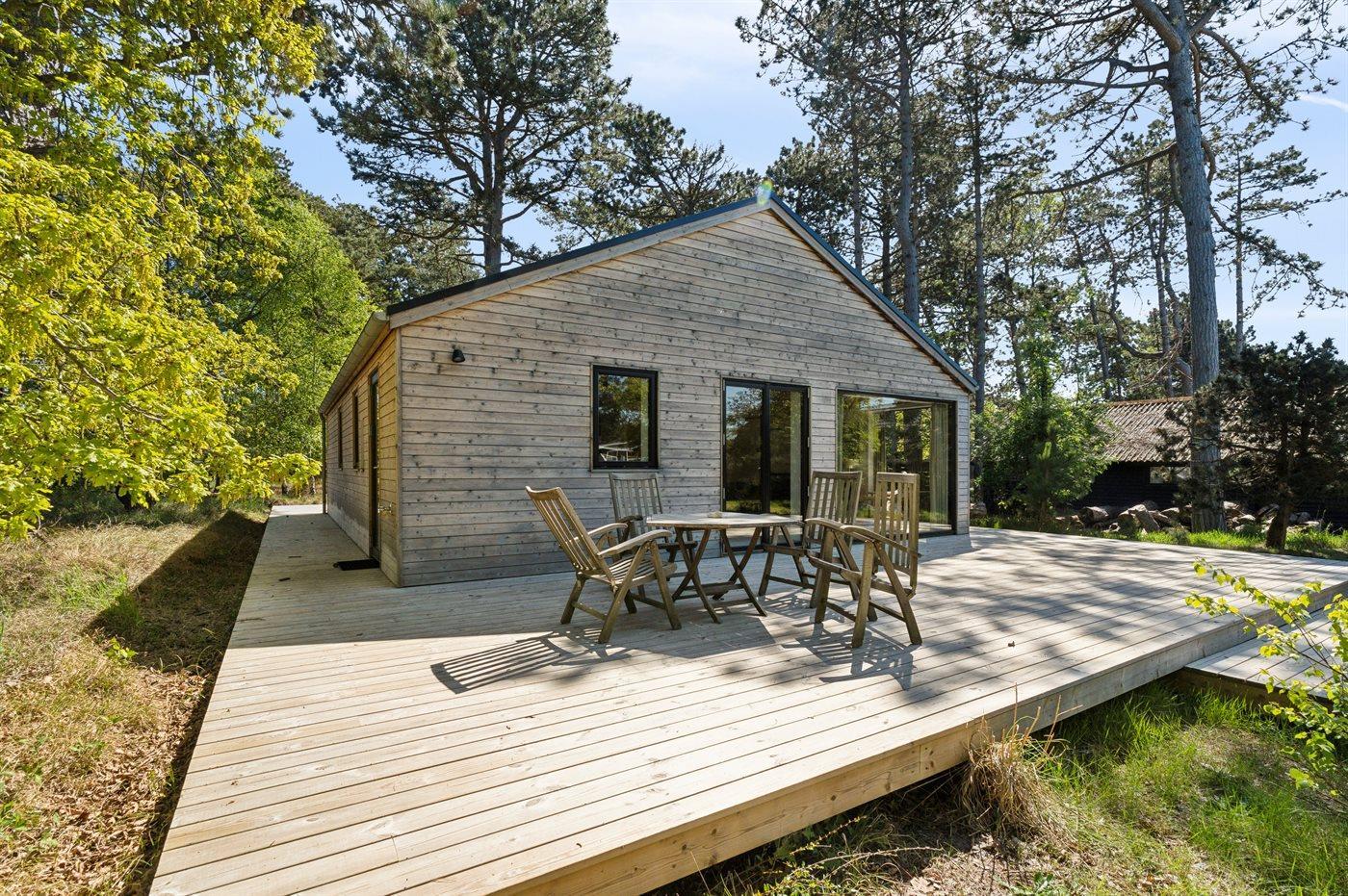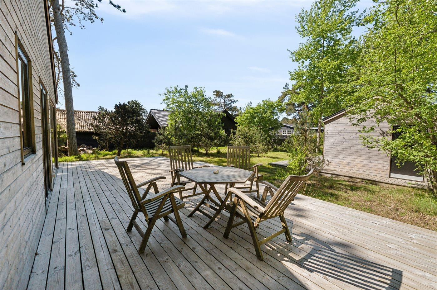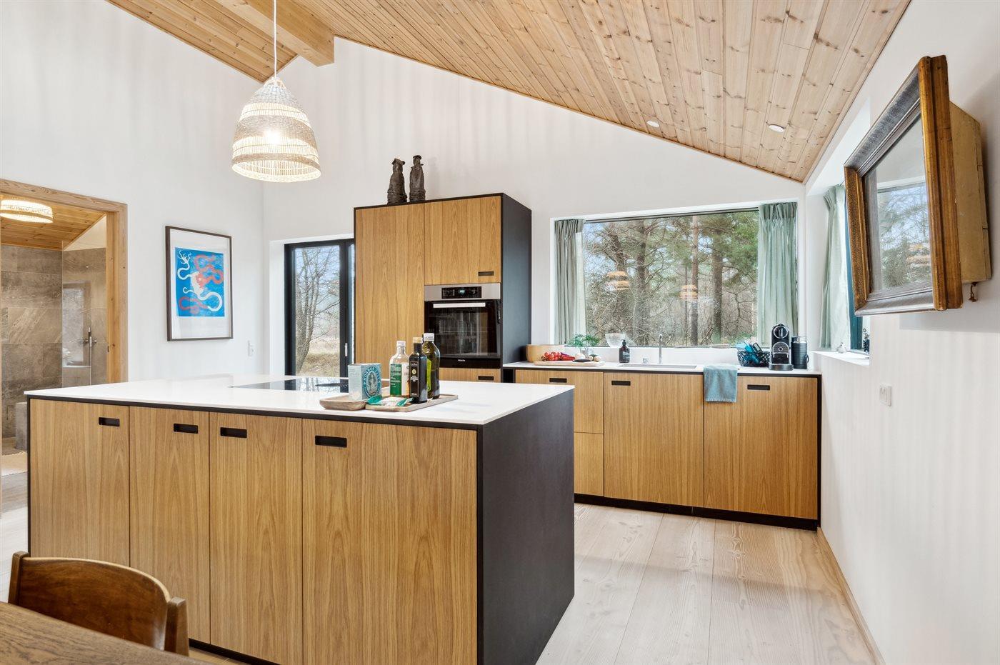 I hovedhuset er et stort flot køkkenalrum i åben forbindelse med stuen, og herfra er udgang til den store træterrasse, som løber rundt om huset. Her er også 2 soveværelser med hver 2 sovepladser samt et luksusbadeværelse med gulvvarme, bruseniche og badekar. I bryggerset er der vaskemaskine.
