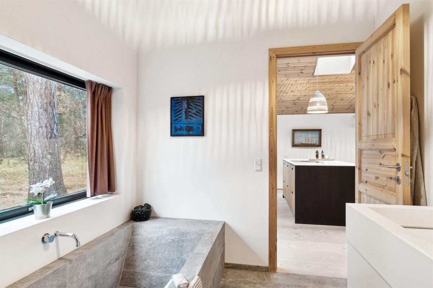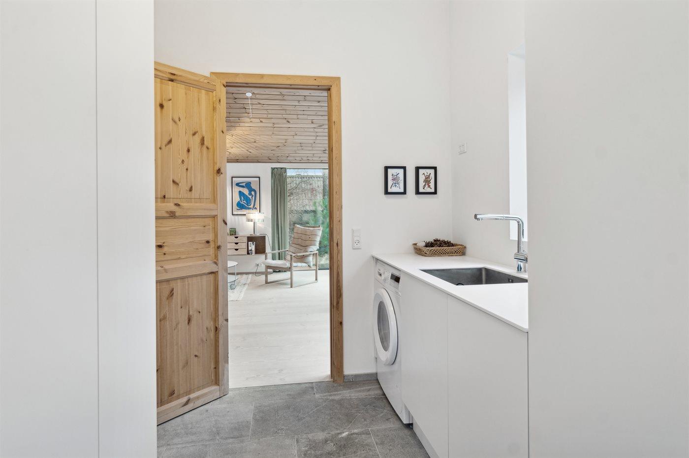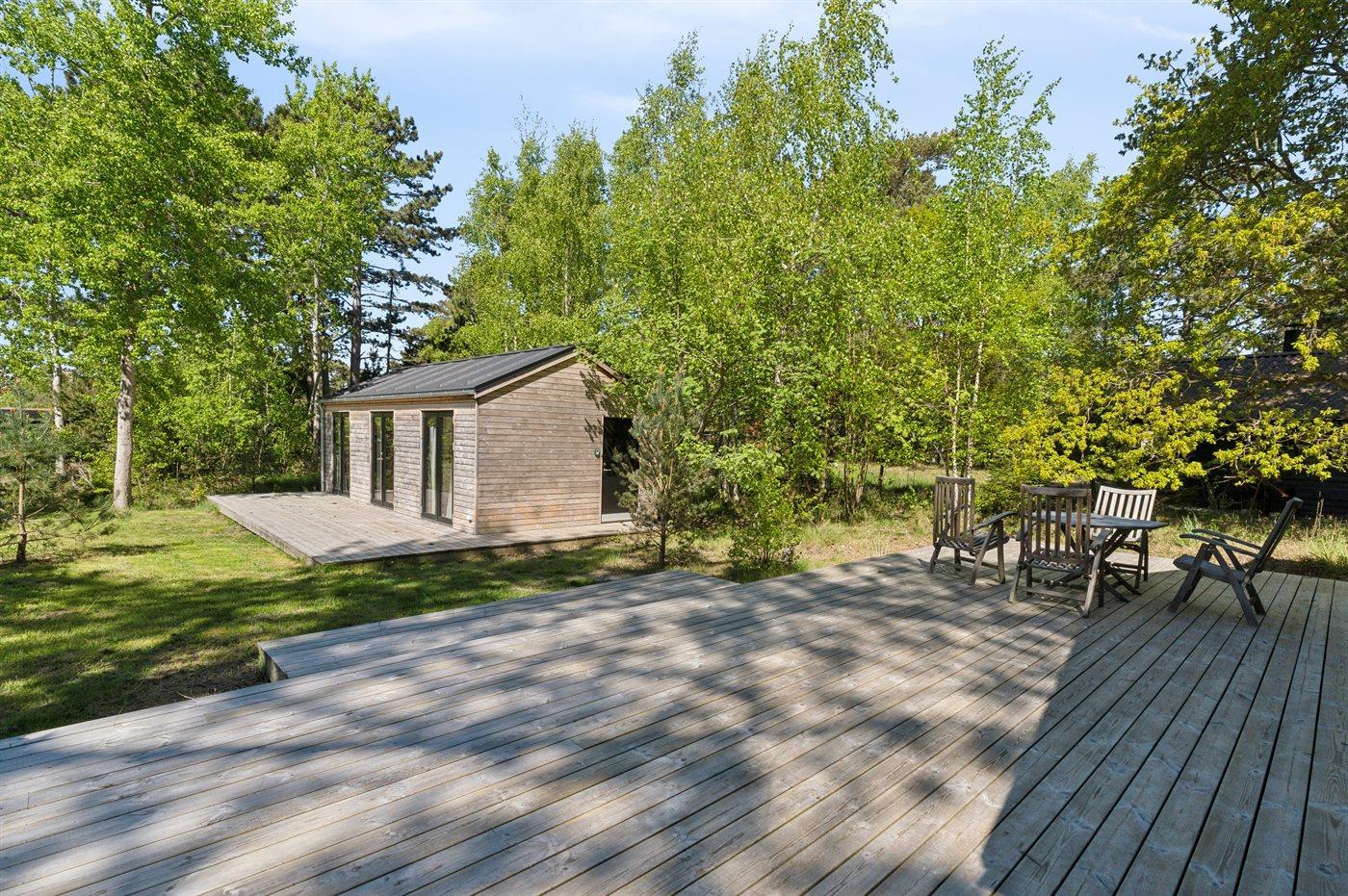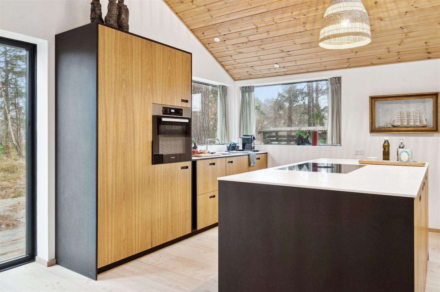 I hovedhuset er et stort flot køkkenalrum i åben forbindelse med stuen, og herfra er udgang til den store træterrasse, som løber rundt om huset. Her er også 2 soveværelser med hver 2 sovepladser samt et luksusbadeværelse med gulvvarme, bruseniche og badekar. I bryggerset er der vaskemaskine.