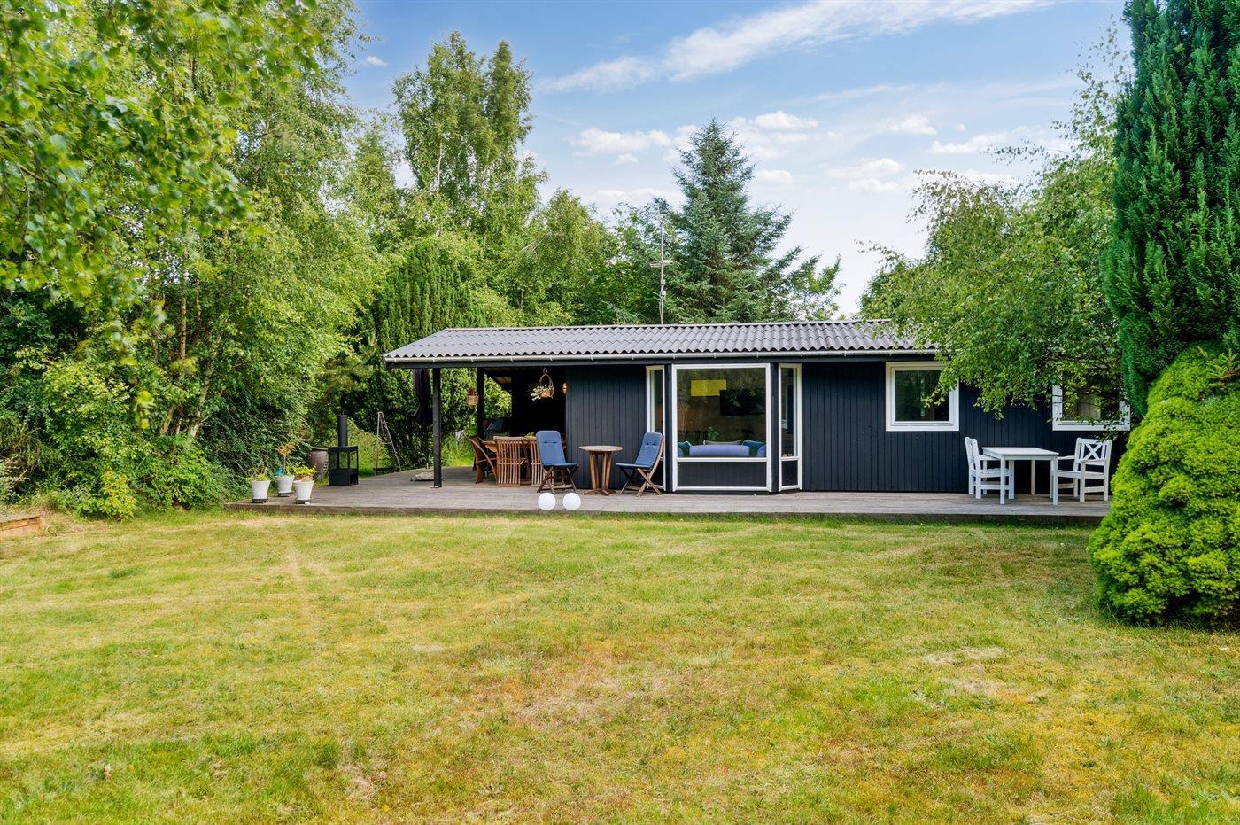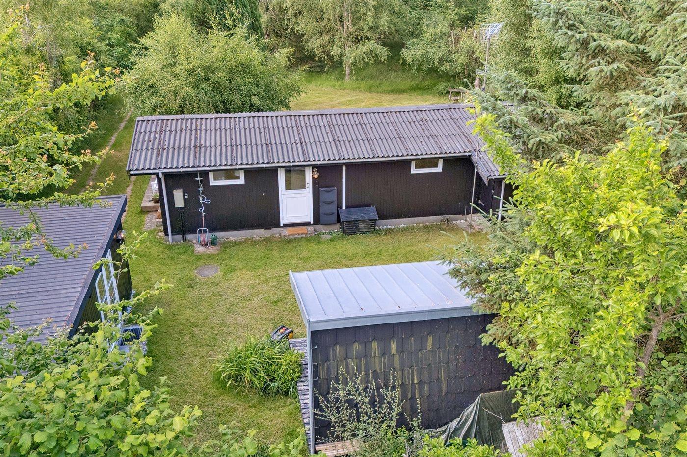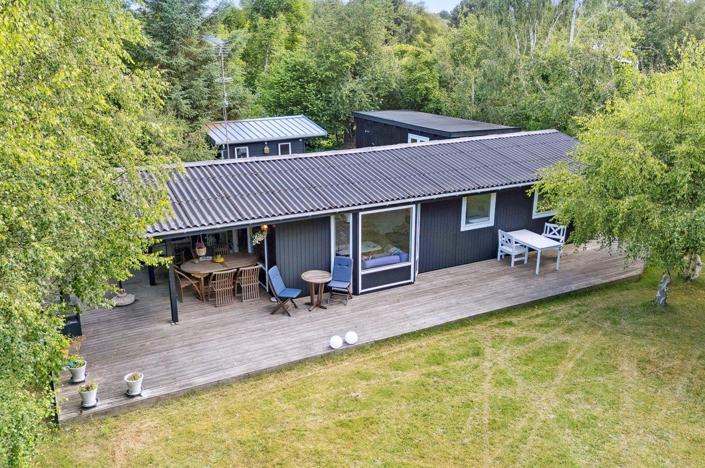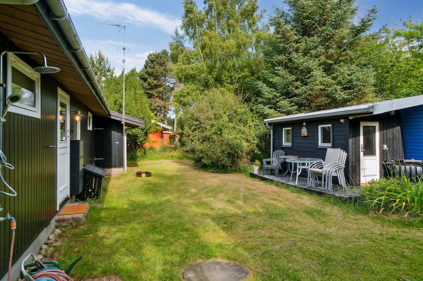 Ferieboligen er beliggende på en 1277 m² stor havegrund. Der er 350 m til havet. Der er en badebro i nærheden. Nærmeste forretning er beliggende i en afstand af 2850 m. Der er en golfbane i en afstand af 7750 m. Til ferieboligen hører 45 m² terrasseareal. Desuden er der 20 m² overdækket terrasse. Sandkasse. Bålsted. Grill til rådighed. Der er installeret stik til opladning af elbil. Type 2 stik. Med 11 kW ladeeffekt. Parkering ved ferieboligen.