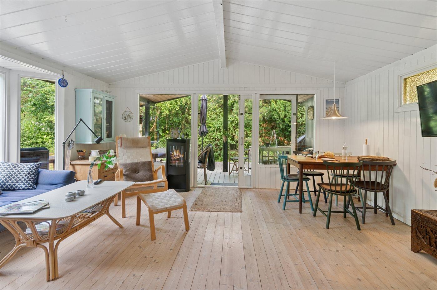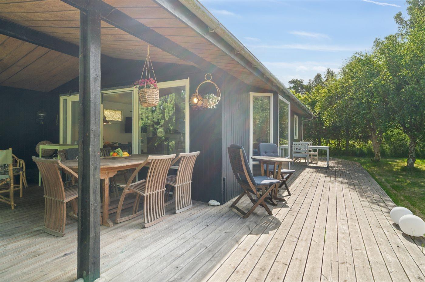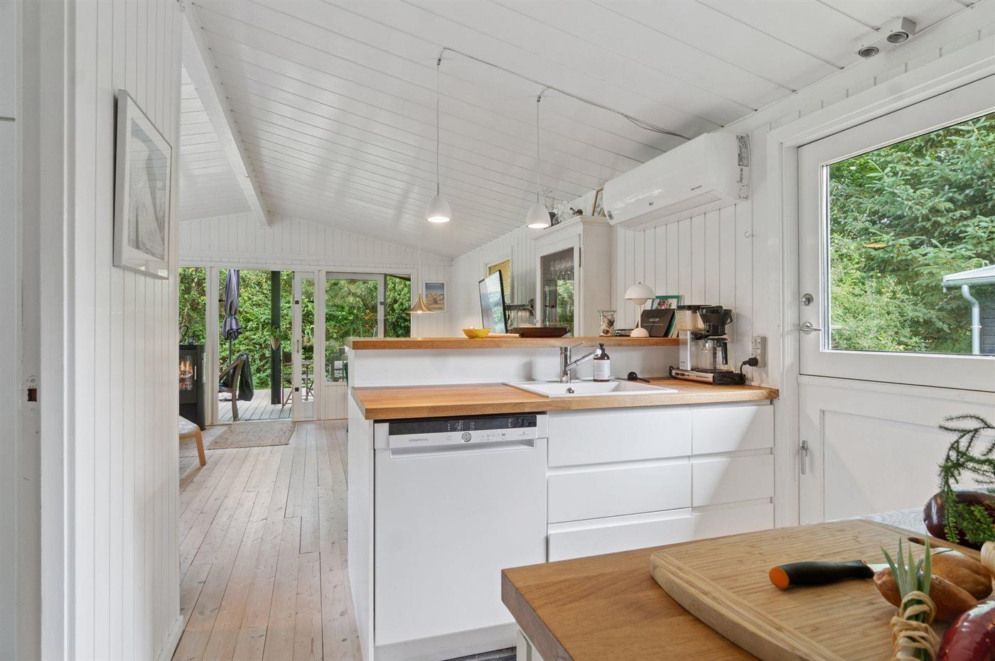 Huset indeholder et dejligt køkkenalrum i forbindelse med stuen. Herfra er der udgang til et stort terrasseareal, hvor en større del er overdækket. Her er rig mulighed for at nyde solen og finde skygge og læ og nyde de lange sommeraftener. Fra køkkenet er der desuden en terrassedør ud til de to annekser. Det største af de 2 annekser er opført i 2025. I begge annekser er der 2 sovepladser i dobbeltsenge.