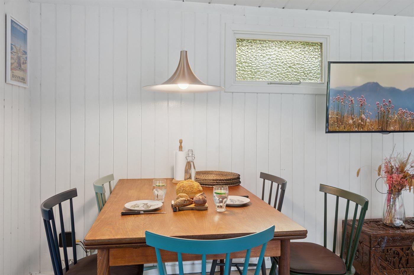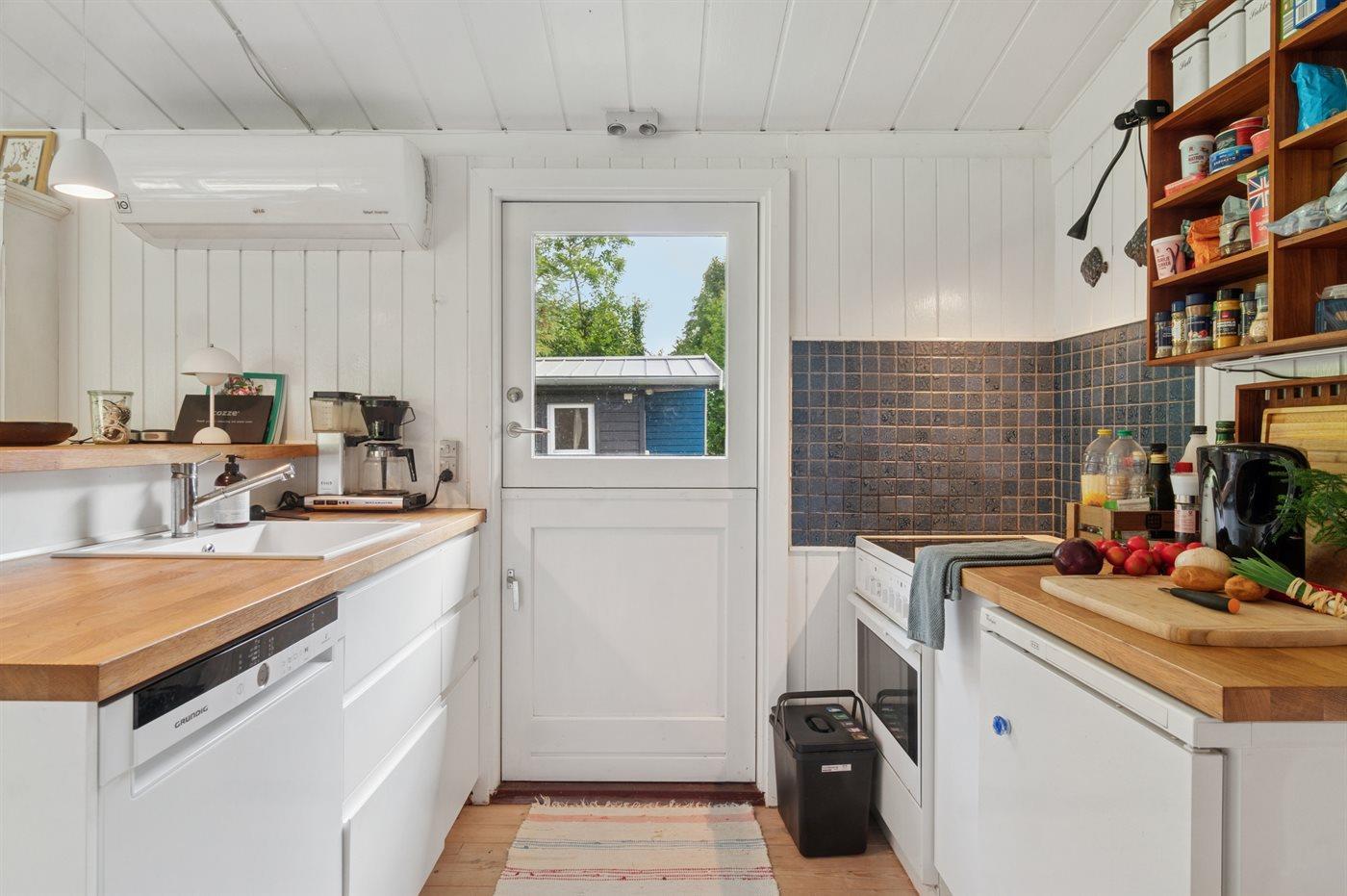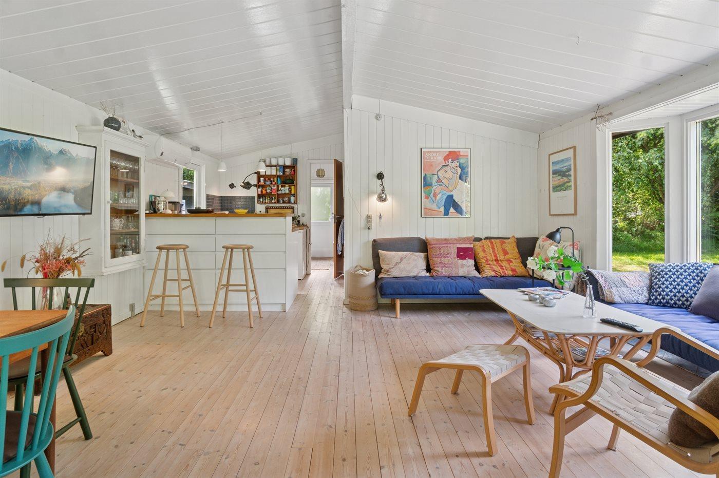 Huset indeholder et dejligt køkkenalrum i forbindelse med stuen. Herfra er der udgang til et stort terrasseareal, hvor en større del er overdækket. Her er rig mulighed for at nyde solen og finde skygge og læ og nyde de lange sommeraftener. Fra køkkenet er der desuden en terrassedør ud til de to annekser. Det største af de 2 annekser er opført i 2025. I begge annekser er der 2 sovepladser i dobbeltsenge.