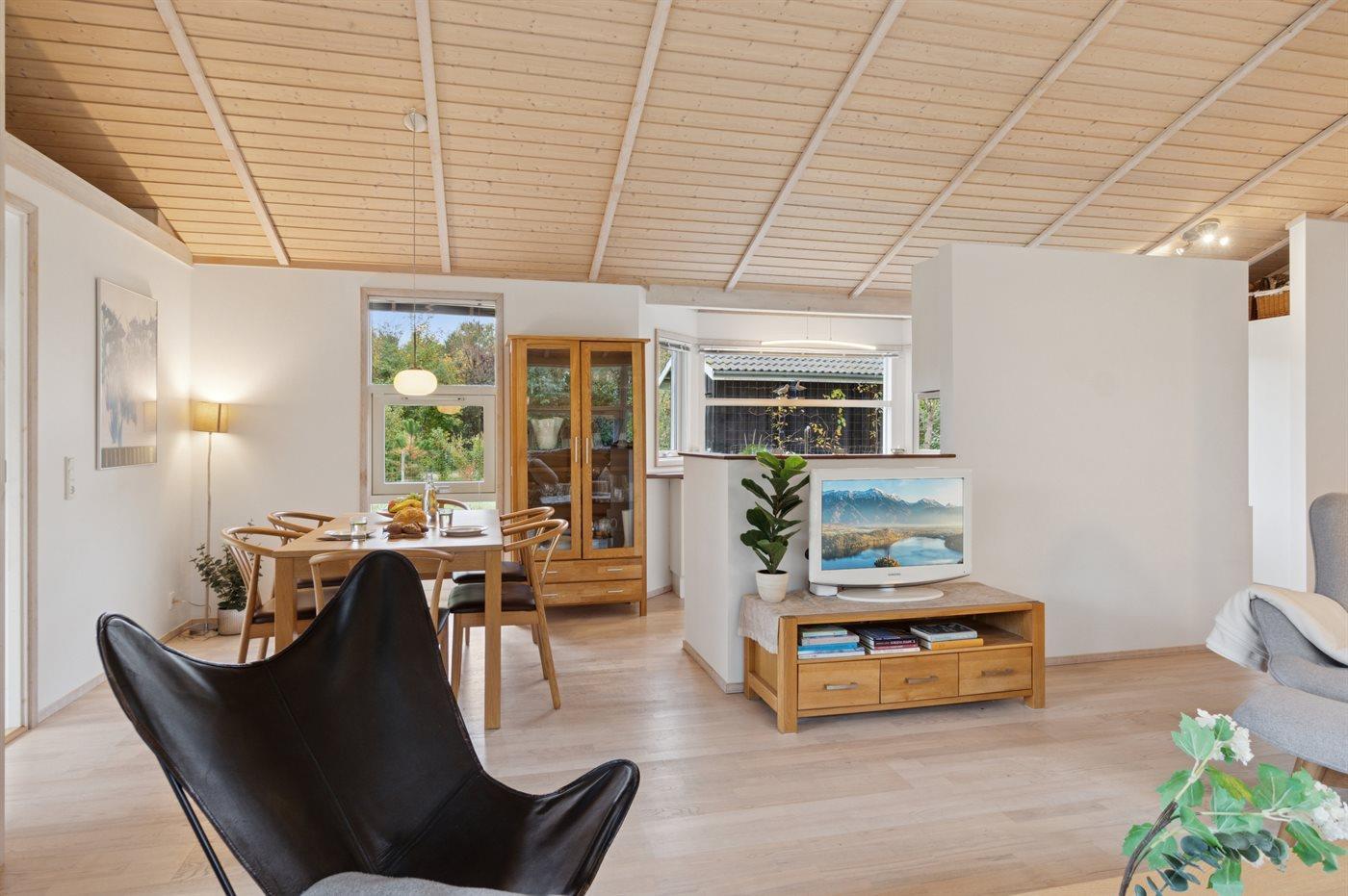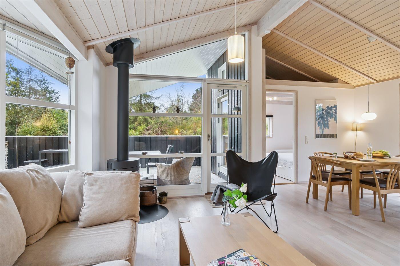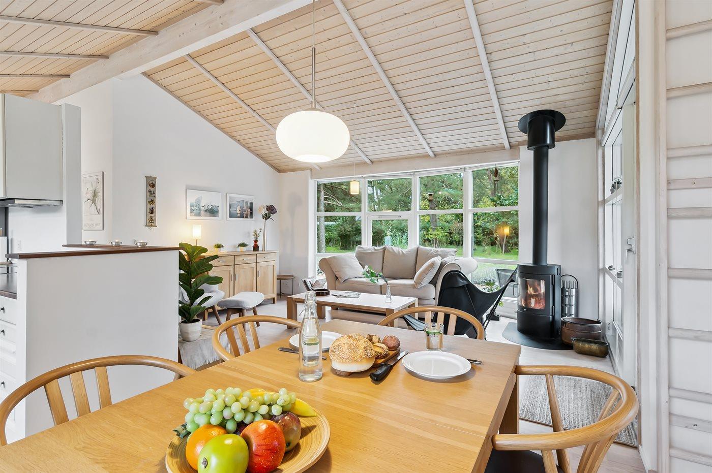 Køkken, spiseplads og stue er ud i ét og udgør sammen med det store sydvendte terrasseområde, de naturlige samlingssteder for hygge og afslapning med venner og familie. En del af terrassen er overdækket med mulighed for at finde skygge og nyde de lange lyse sommeraftener. Overalt i huset er der loft-til-kip og masser af lysindfald.
