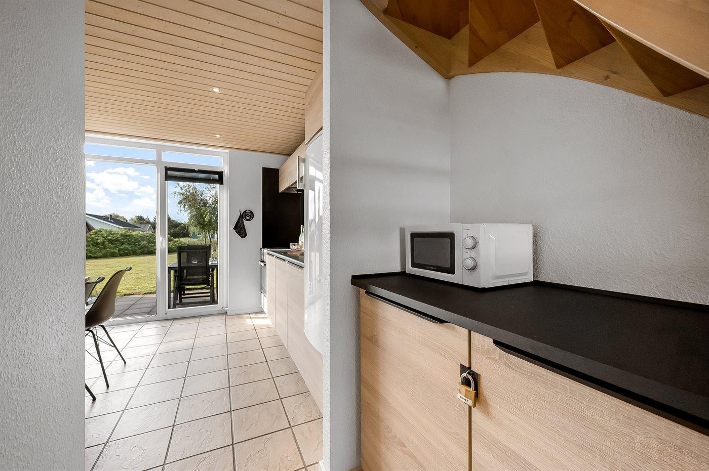 Køkkenet med gulvvarme er udstyret med 1 køleskab med lille frostboks (frysekapacitet på 15 liter). Der er 3 induktionskogeplader, varmluftovn, mikrobølgeovn samt opvaskemaskine. Desuden findes der brødrister og stavblender.