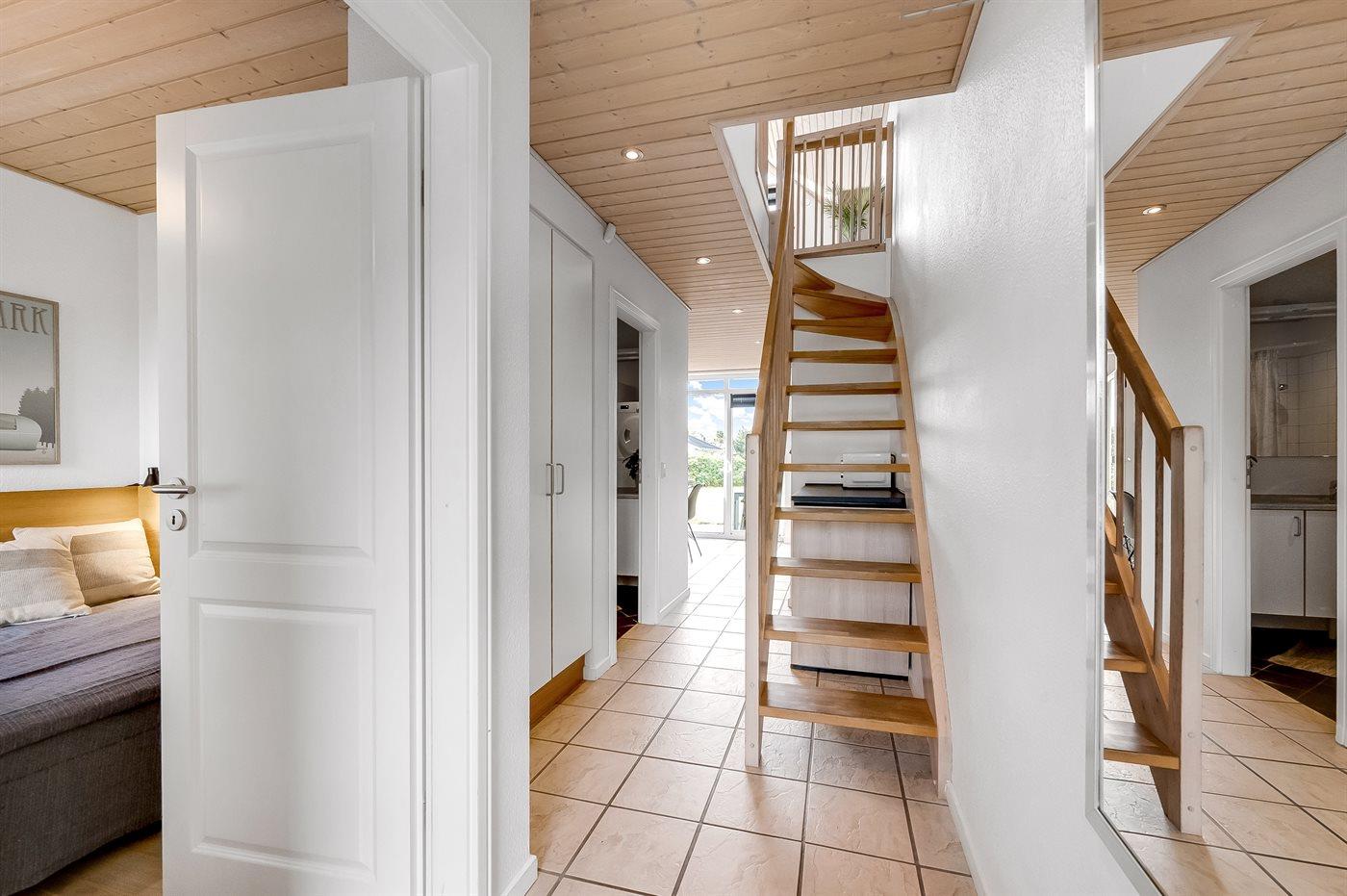 Sommerhuset er i to etager. I stueplan finder du et nyrenoveret køkken-alrum (2023), badeværelse samt soveværelse med 3/4-seng. Fra køkken-alrum er der adgang til terrassen med Weber-kuglegrill til kul, havebord og 6 stole samt til et stort grønt fællesområde, hvor der er rig mulighed og plads til leg og spil. På første sal finder du en smuk stue med loft til kip, sovesofa, 2 lænestole og smuk udsigt over det store, grønne område. På første sal finder du også et soveværelse med dobbeltseng samt udstræks-dobbeltseng.