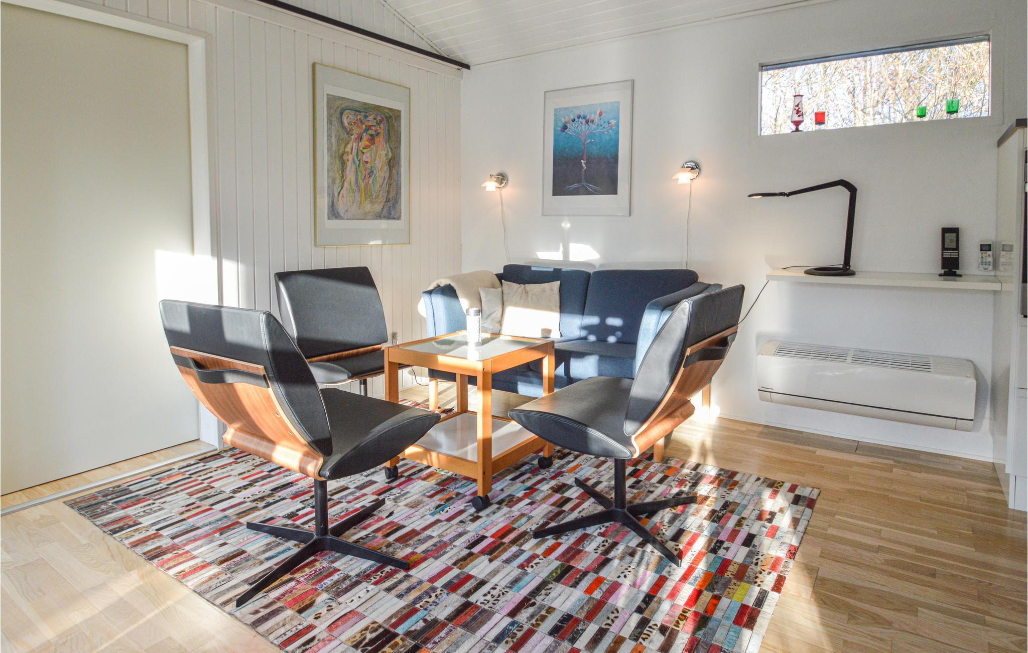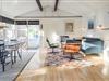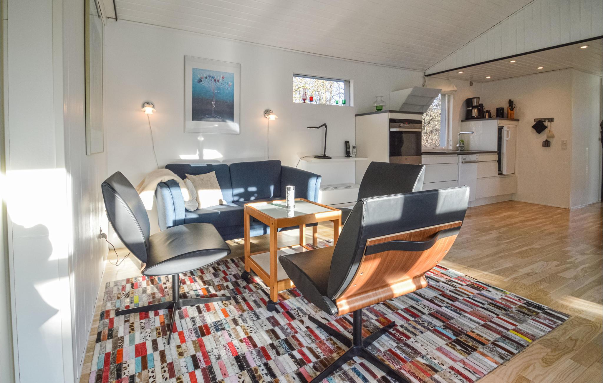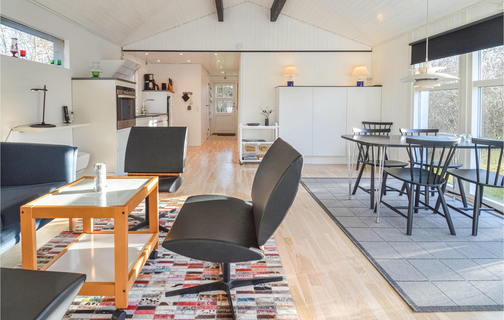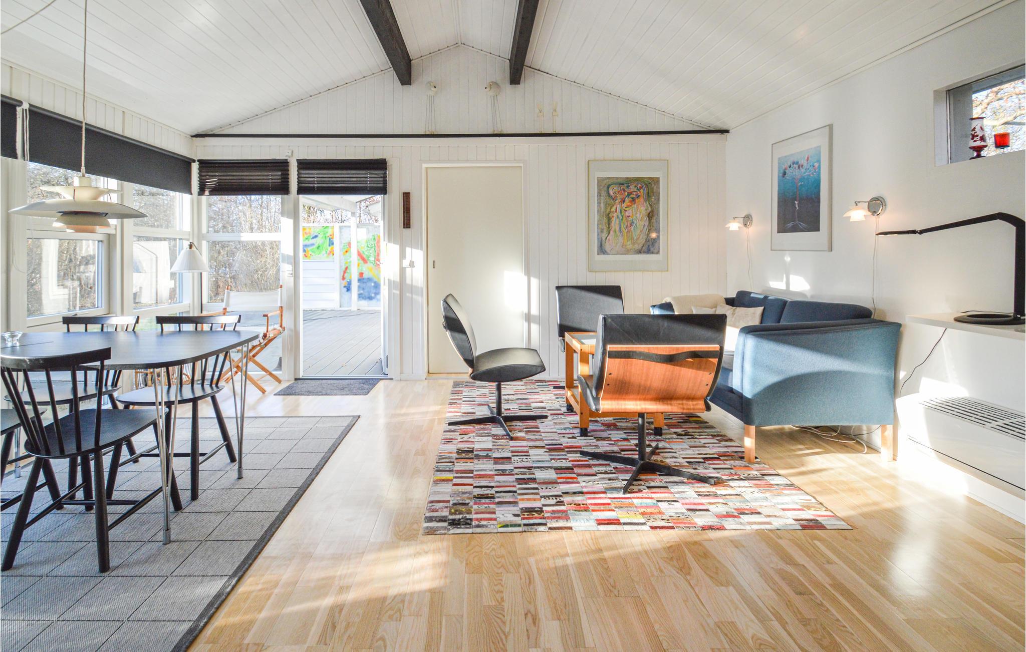 Hyggelig stue med åbent køkken og udgang til overdækket terrasse. Lækkert soveværelse med elevationssenge, samt værelse med stor køjeseng og et tredje værelse med en enkeltseng.