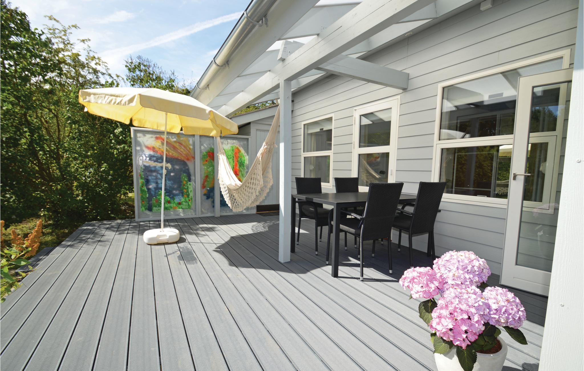 Lille morgenterrasse, hvor I kan nyde morgenkaffen. Huset ligger på en naturgrund i et roligt område, og tæt på badestrand med egen badebro.