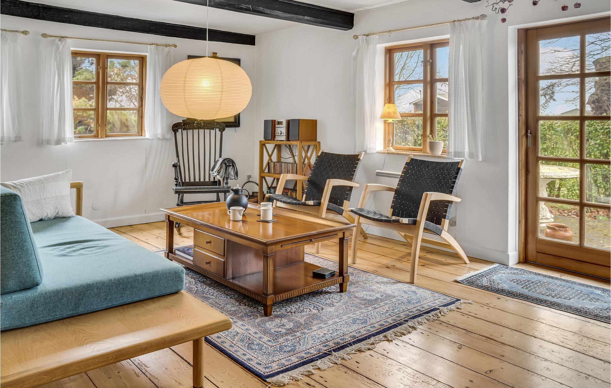 Hyggeligt feriehus med stor have, brændeovn og åben terrasse nær Nysted for en afslappende ferie.