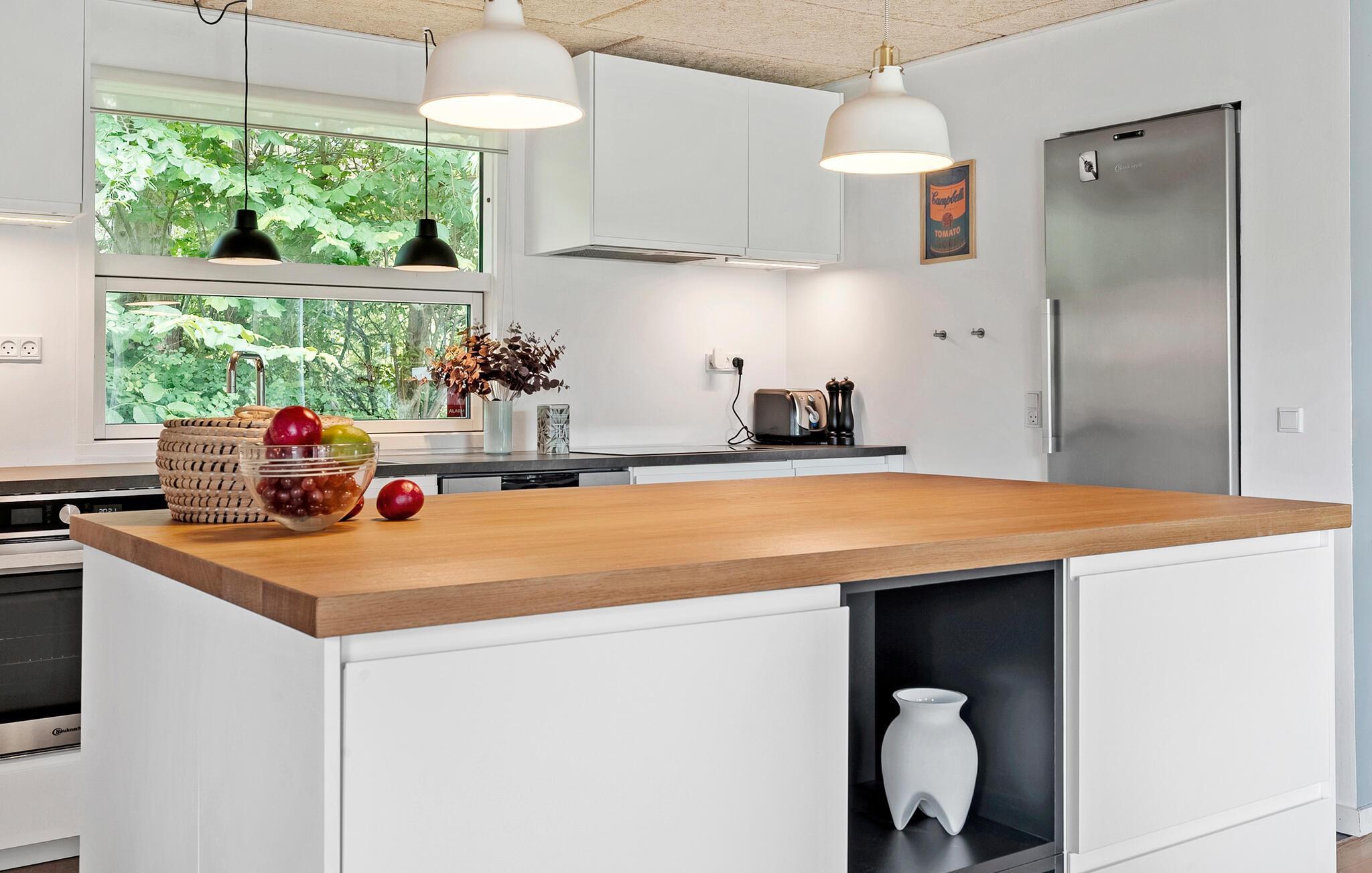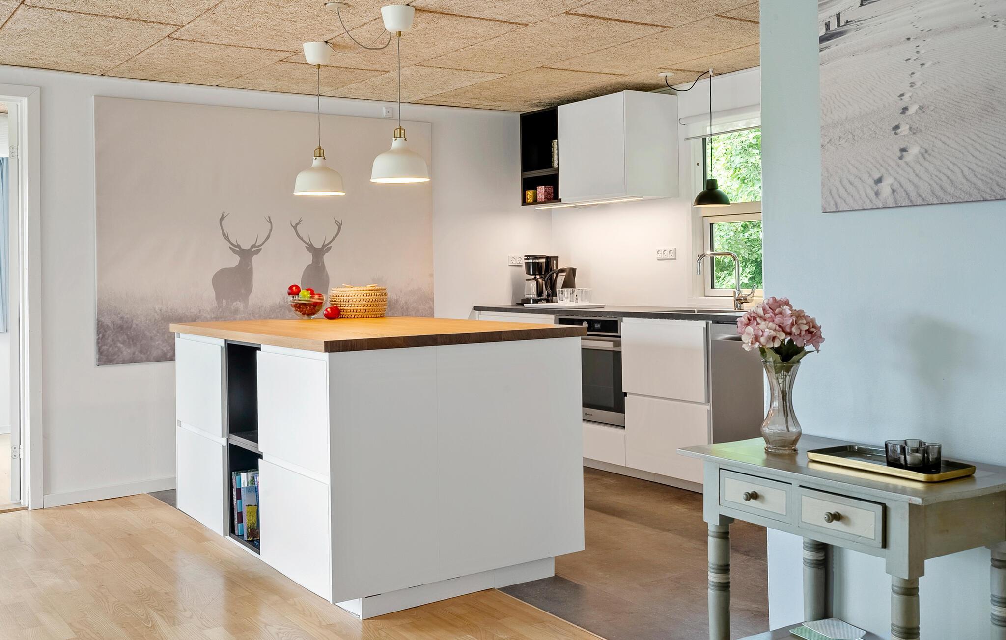 Tilbring afslappende feriestunder i dette klassiske feriehus, som er noget særligt med sin fredfyldte beliggenhed og udsigt over landskabet. Nærheden til stranden og de skønne faciliteter gør dette sted til en dejlig lille oase. Læn jer tilbage på sofaen i den hyggelige opholdsstue og nyd en afslappende stund med en film eller en bog, mens den varme ild knitrer i brændeovnen. Lav retterne i det åbne køkken og nyd måltiderne ved det rustikke spisebord.