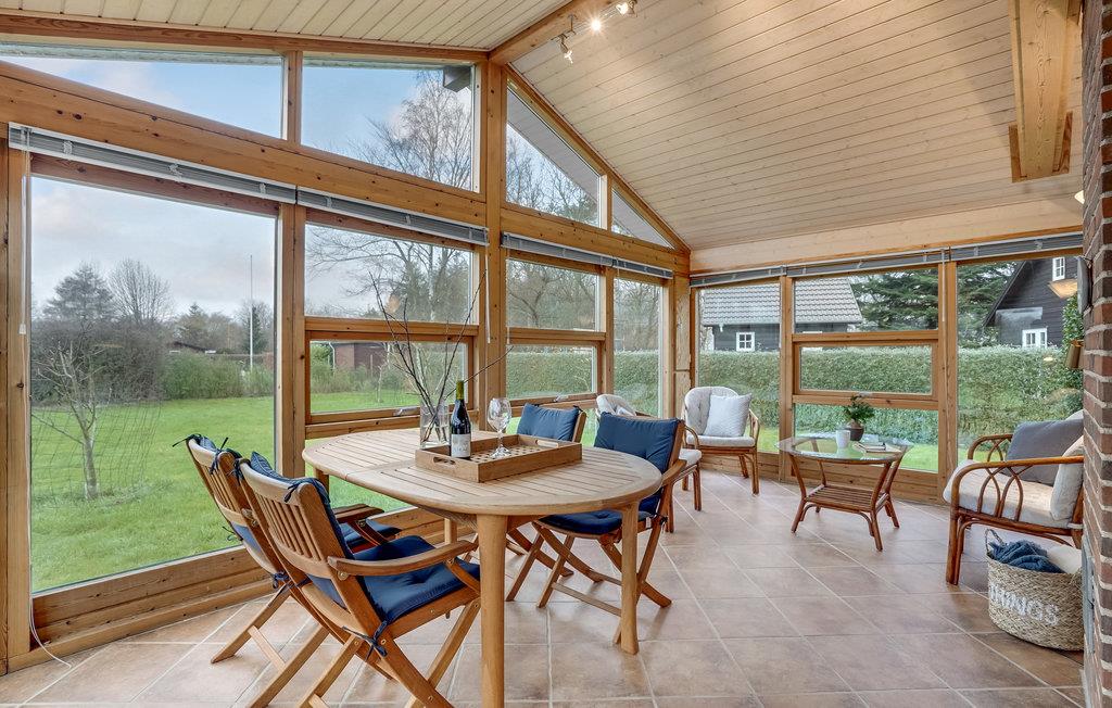 Det flotte træhus med sprossede vinduer har plads til seks personer. Tre af soveværelserne har henholdsvis dobbeltseng, to enkeltsenge og en køjeseng (den nederste del er 120 cm bred). Der er også en rummelig stue med åbent køkken, et badeværelse med varmtvandsbeholder på 110 liter og en garage til bilen. Huset får et skønt lysindfald gennem vinduerne, og I kan glæde jer til en dejlig udsigt over det omkringliggende grønne område.