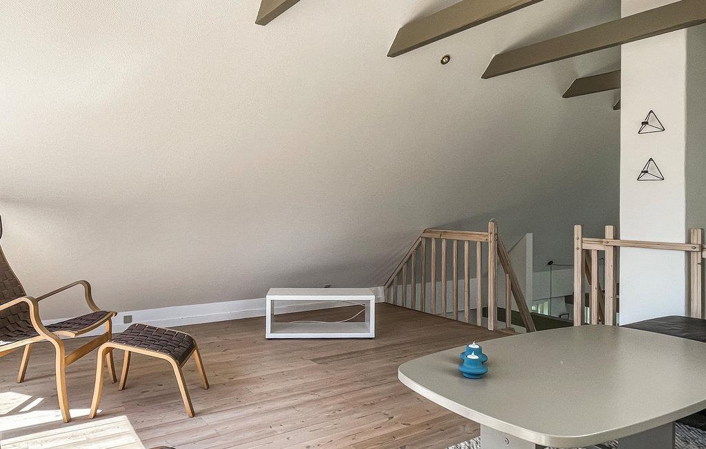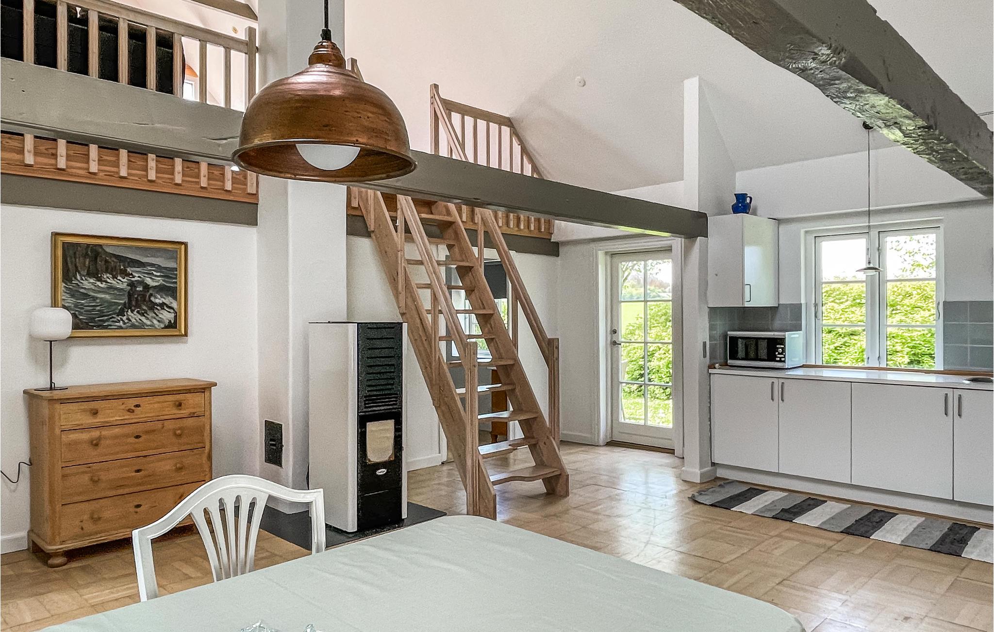 Feriehuset, som er i to plan, har åbent til kip og synlige træbjælker i loftet, hvilket gør det rummeligt og hyggeligt. I stueetagen finder I det åbne, veludstyrede køkken med spiseplads, to store soveværelser og et badeværelse med gulvvarme. Fra køkkenet er der en lidt stejl trappe op til opholdsstuen, hvor I kan se TV i komfortable møbler, og som har udgang til en dejlig terrasse med havemøbler og langt udsyn til fine, landlige omgivelser og helt til Olsker Rundkirke. I finder en vaskemaskine i husets bryggers.
