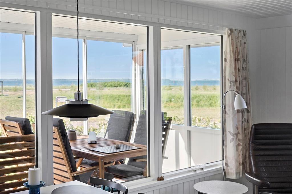 Opholdsstue med udsigt til vandet. TV med danske kanaler og ZDF, spiseplads og udgang til skøn overdækket og delvis lukket terrasse med havudsigt. Her kan måltidet nydes også på en lidt kølig aften.