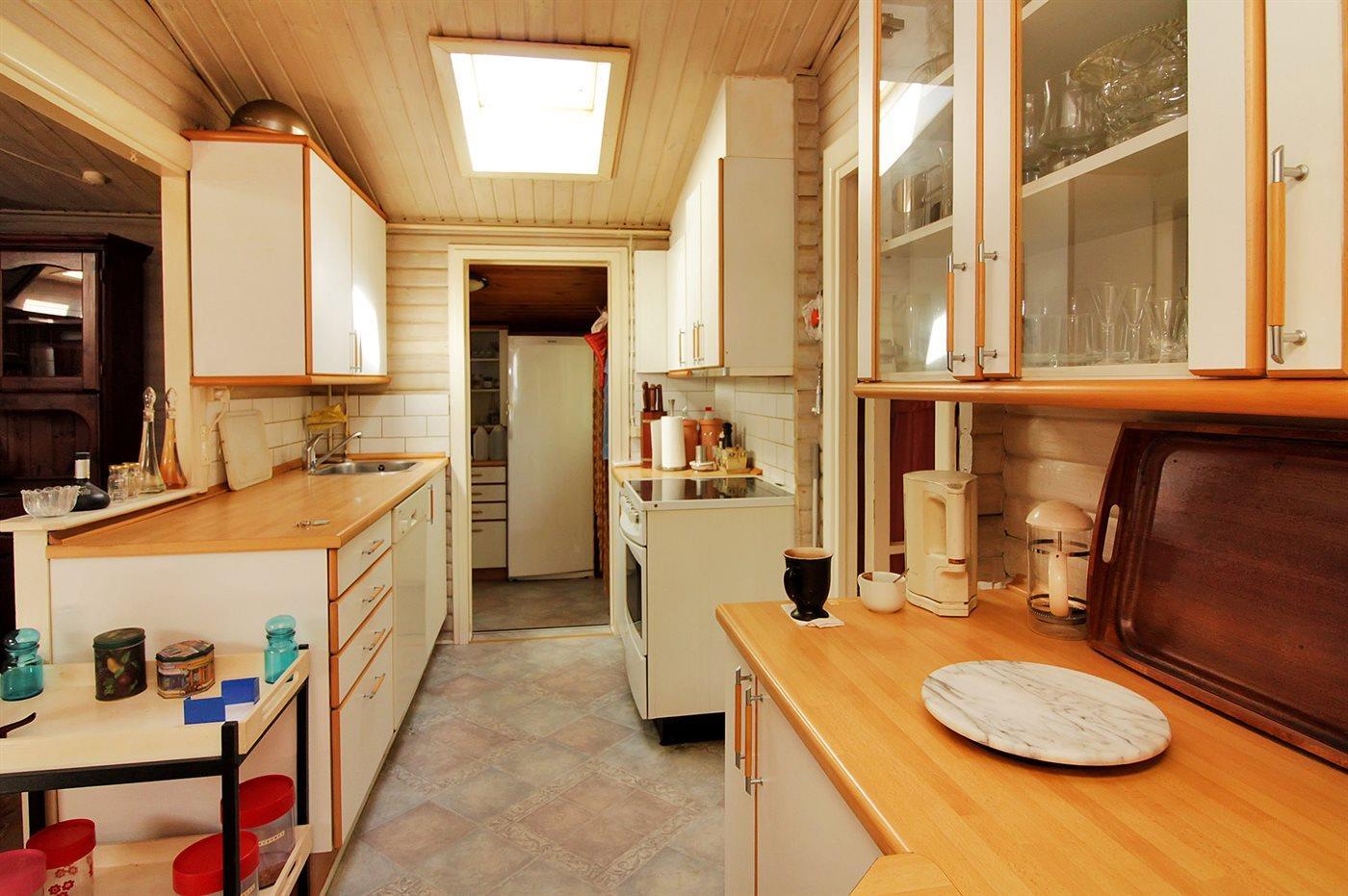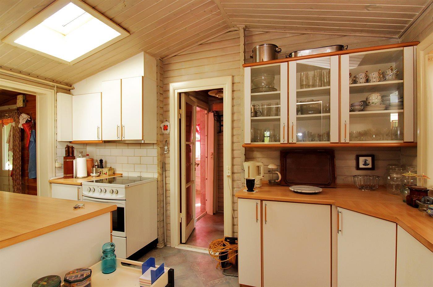 Køkkenet er udstyret med 1 køleskab. Der er 4 keramiske kogeplader, varmluftovn samt opvaskemaskine.