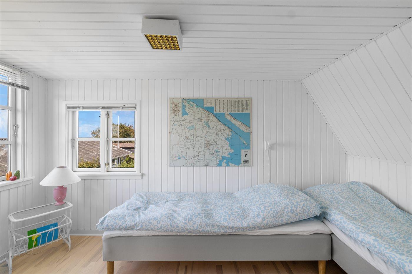 Der er i alt 2 soveværelser. Sovepladserne fordeler sig på: 2 sovepladser i dobbeltseng. 2 sovepladser i enkeltsenge.1 soveplads i køjeseng. 2 sovepladser i sovesofa (dobbelt). 2 af disse sovepladser befinder sig i stuen.