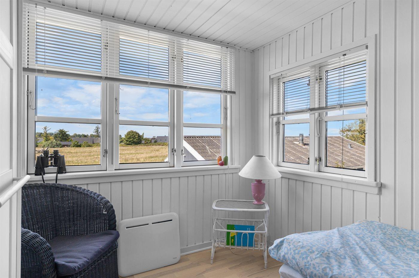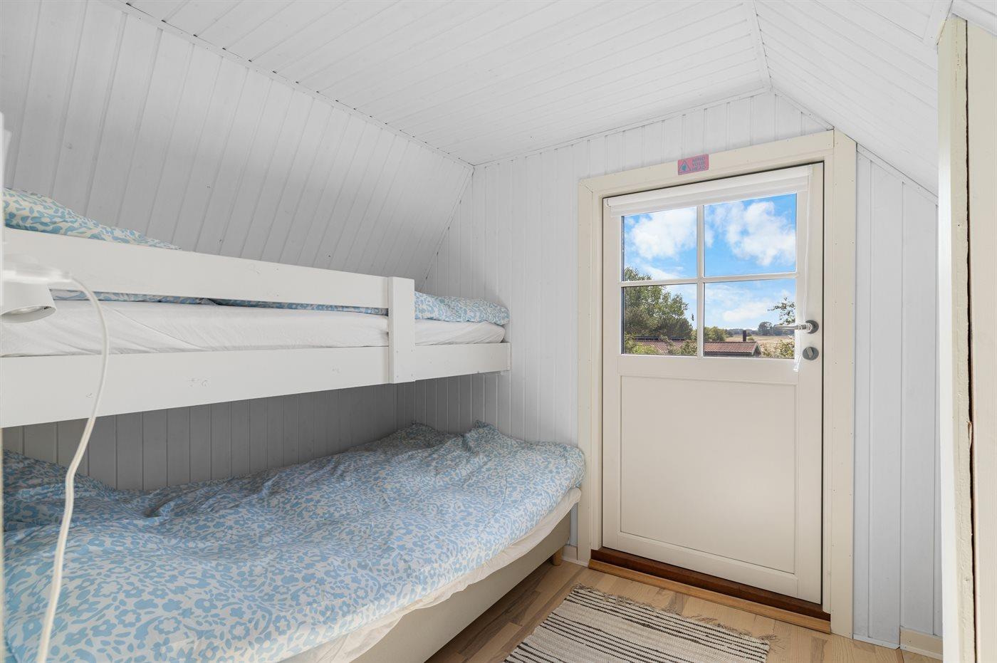 På 1.salen findes de to soveværelser, hvor det ene er med køjeseng med en ekstra bred seng i bunden, som evt. kan benyttes til 2 personer. Herfra er der også udgang til altanen.