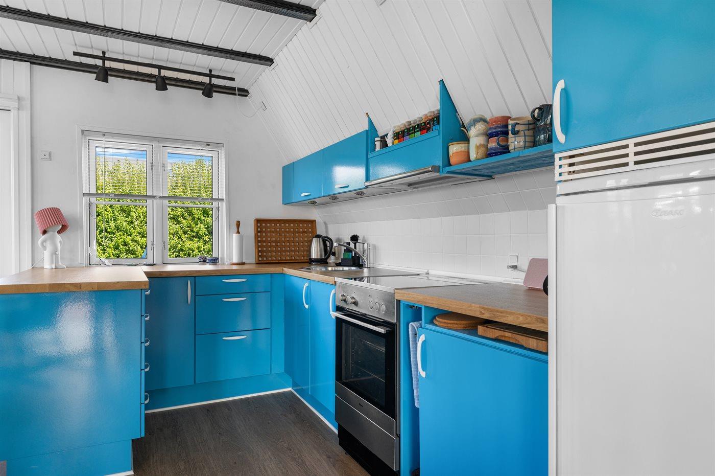 Køkkenet er udstyret med 1 køleskab. Der er 4 keramiske kogeplader, varmluftovn, mikrobølgeovn.