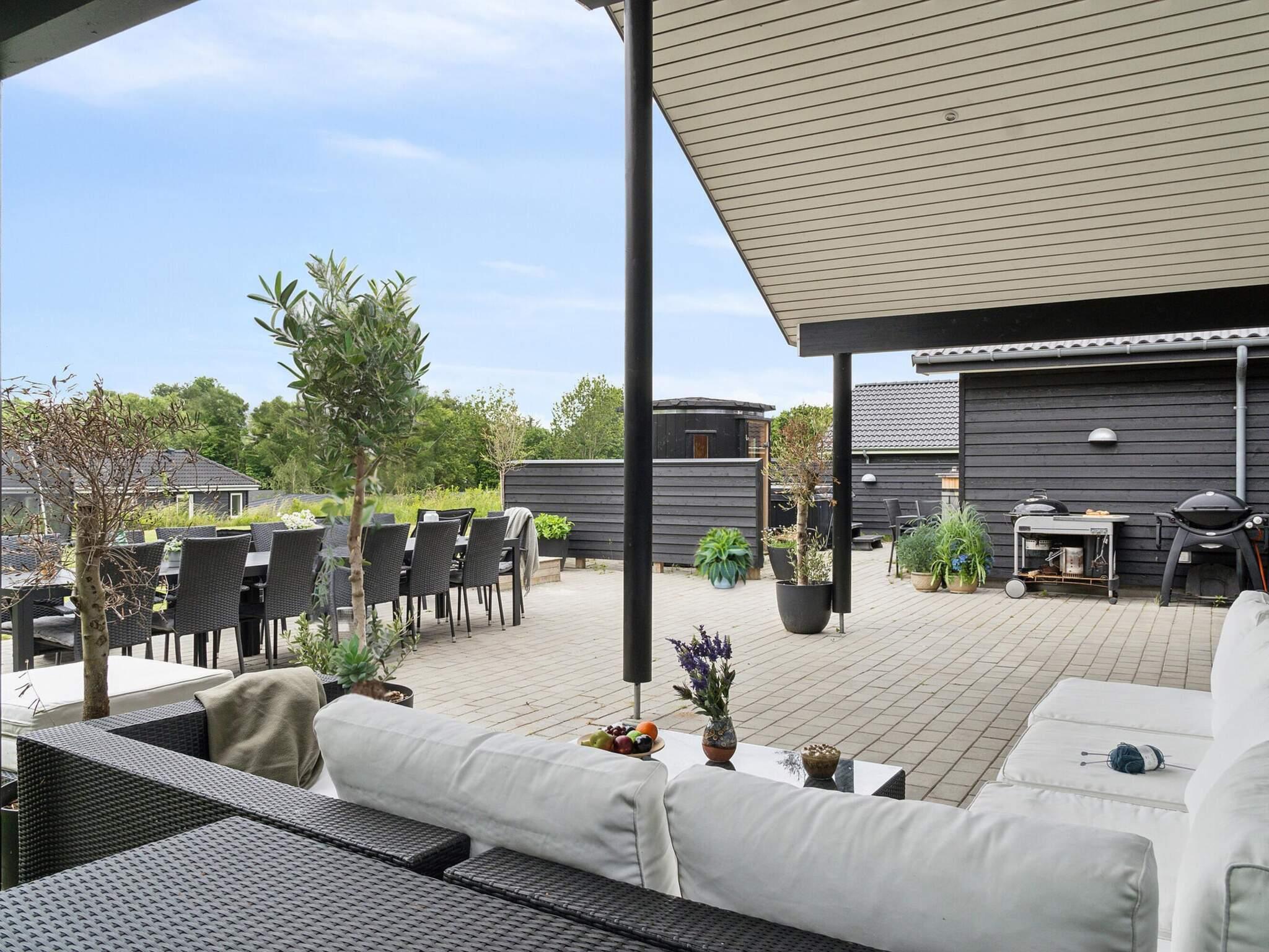 Udendørs finder du gynge, sandkasse, legetårn og trampolin til sommerhusets yngste gæster (benyttes på eget ansvar/forsikring). Den delvist overdækkede terrasse er perfekt til grill eller solbadning på varme dage.