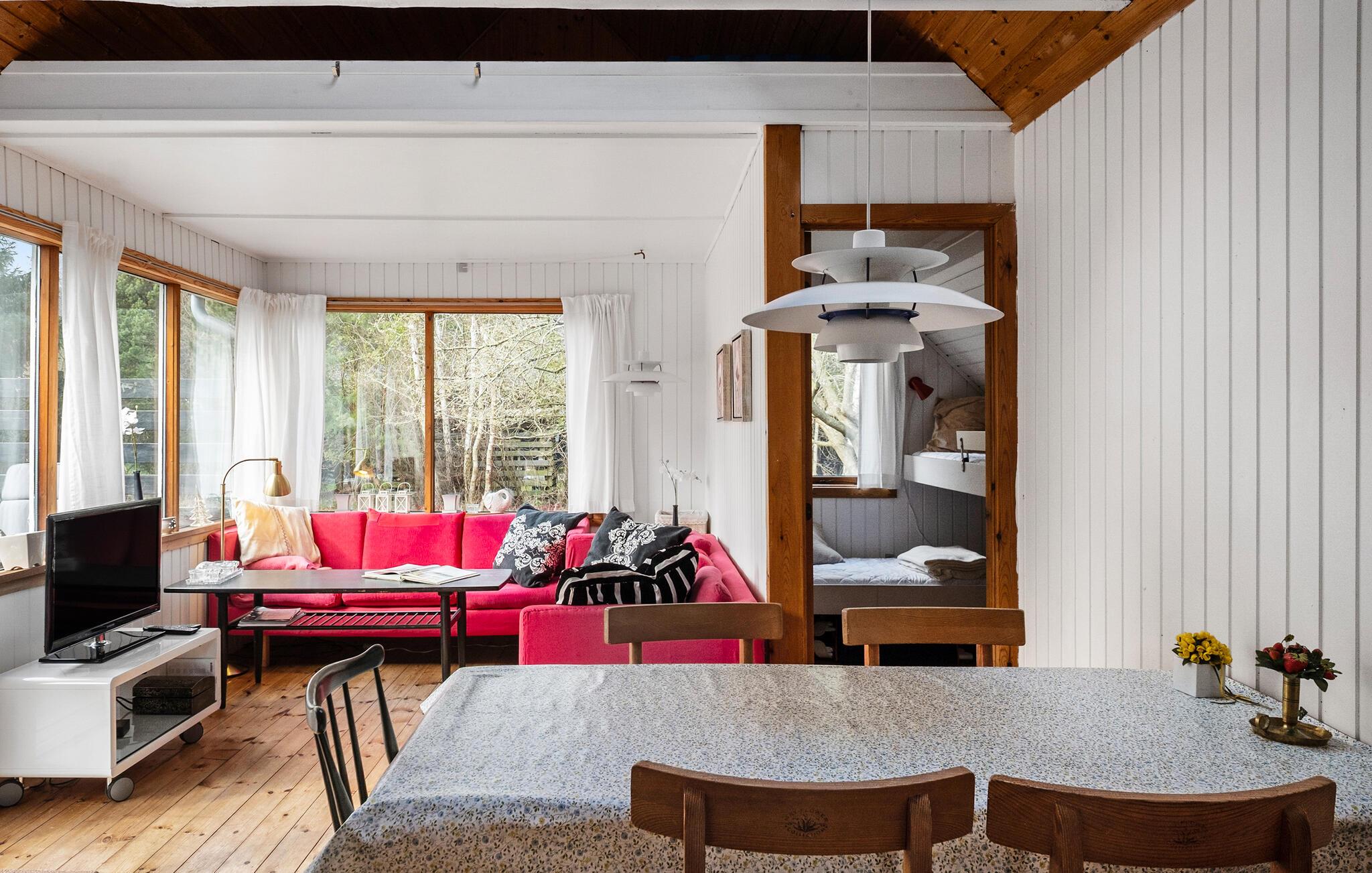 Hele familien kan se frem til et dejligt afbræk fra hverdagen i dette sommerhus, som emmer af fred, ro og ferieidyl. Huset er charmerende og klassisk med fine retrodetaljer og en fredfyldt atmosfære, som gør det nemt at sænke skuldrene og slappe af. Begynd dagene med en afslappet morgenmad i opholdsområdet, hvor de store vinduer lukker lyset ind og giver en hyggelig udsigt til haven.