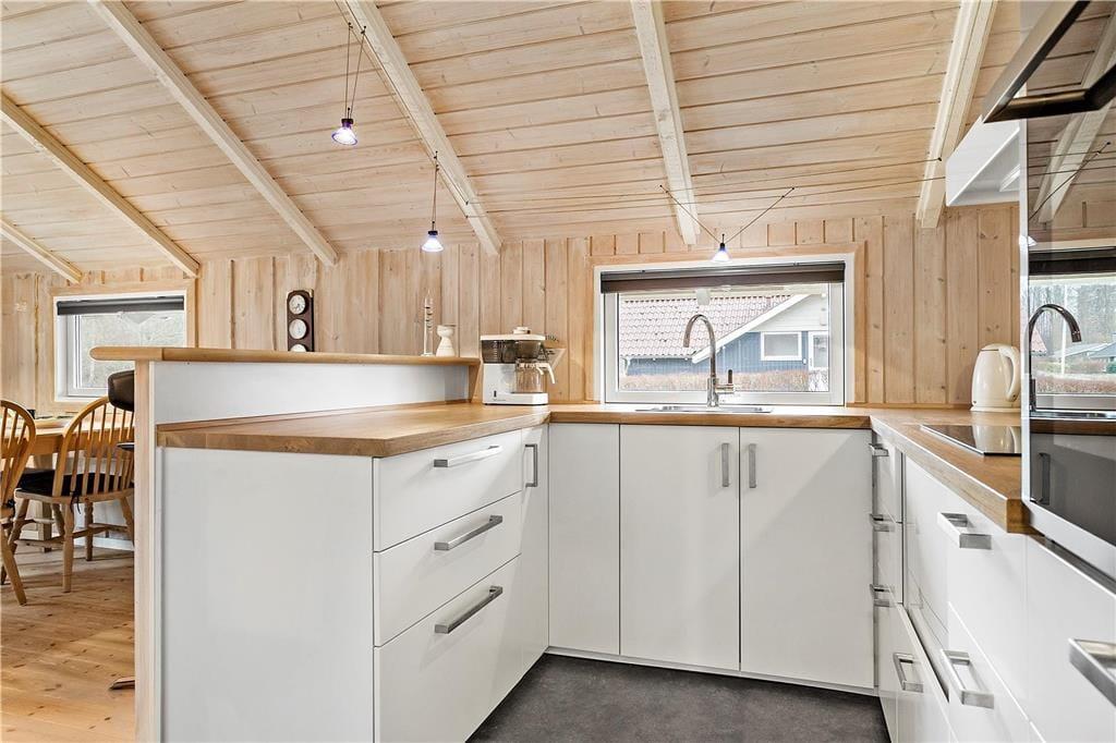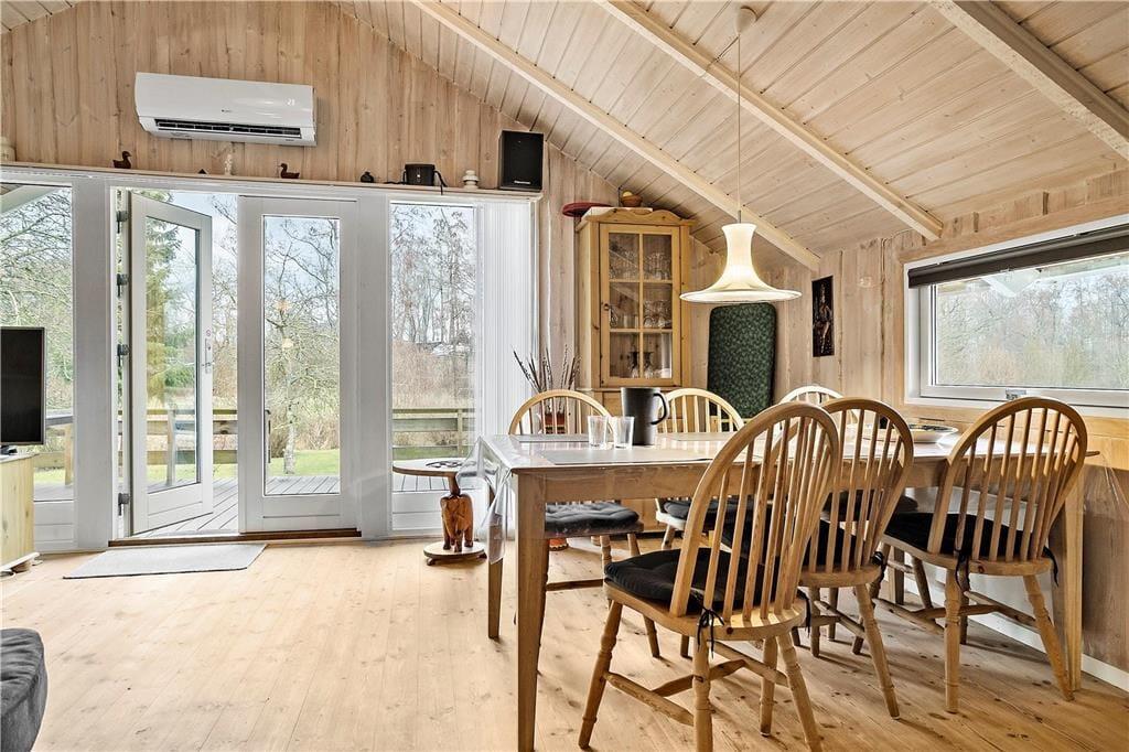 Husets flotte køkken har mini opvaskemaskine og alt, hvad I ellers skal bruge under jeres ophold. Spisepladsen ligger i åben og direkte forbindelse med køkken og stue. Her kan I samles til dagens måltider og nyde udsigten til en naturskøn have.