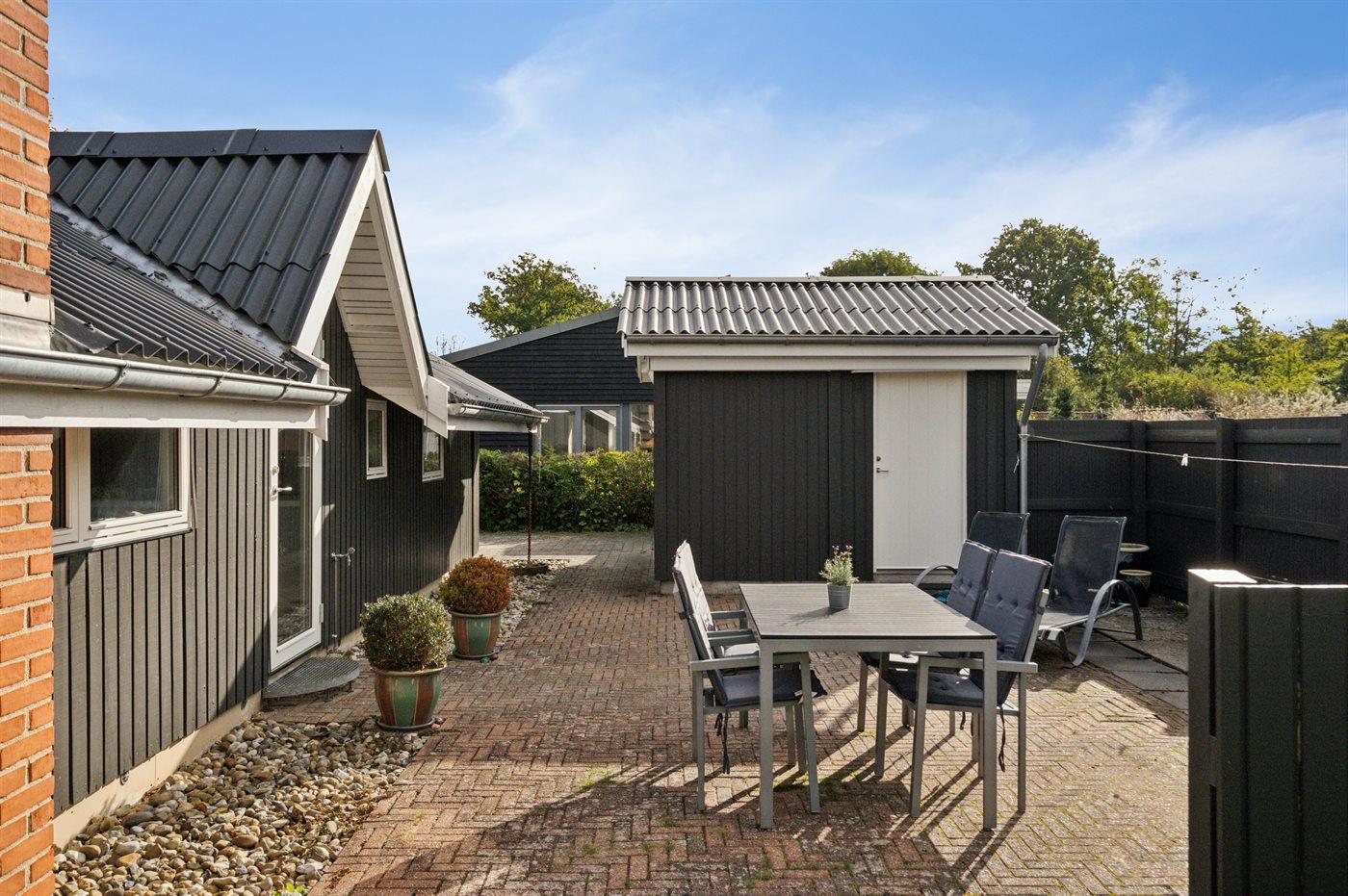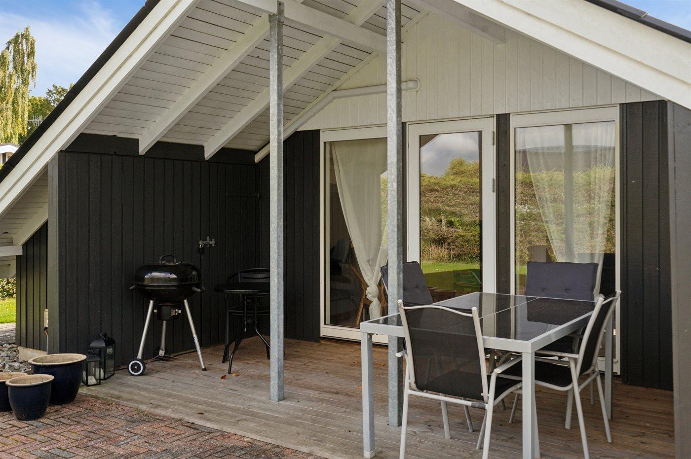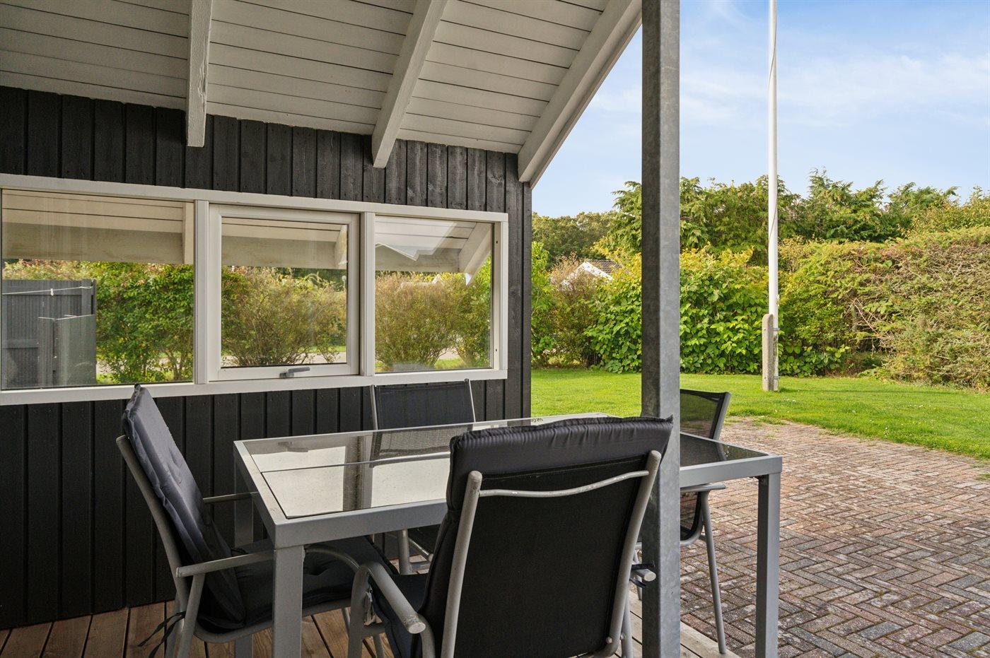 Sommerhuset er beliggende på en dejlig grund og med en overskuelig have. Der findes et dejligt, delvist overdækket terrasseareal - hvor det ofte er muligt at finde et hjørne i læ for vinden, og hvor du kan nyde solen og sidde med et glas vin eller en kop kaffe og slappe af i de fredelige og naturskønne omgivelser.
