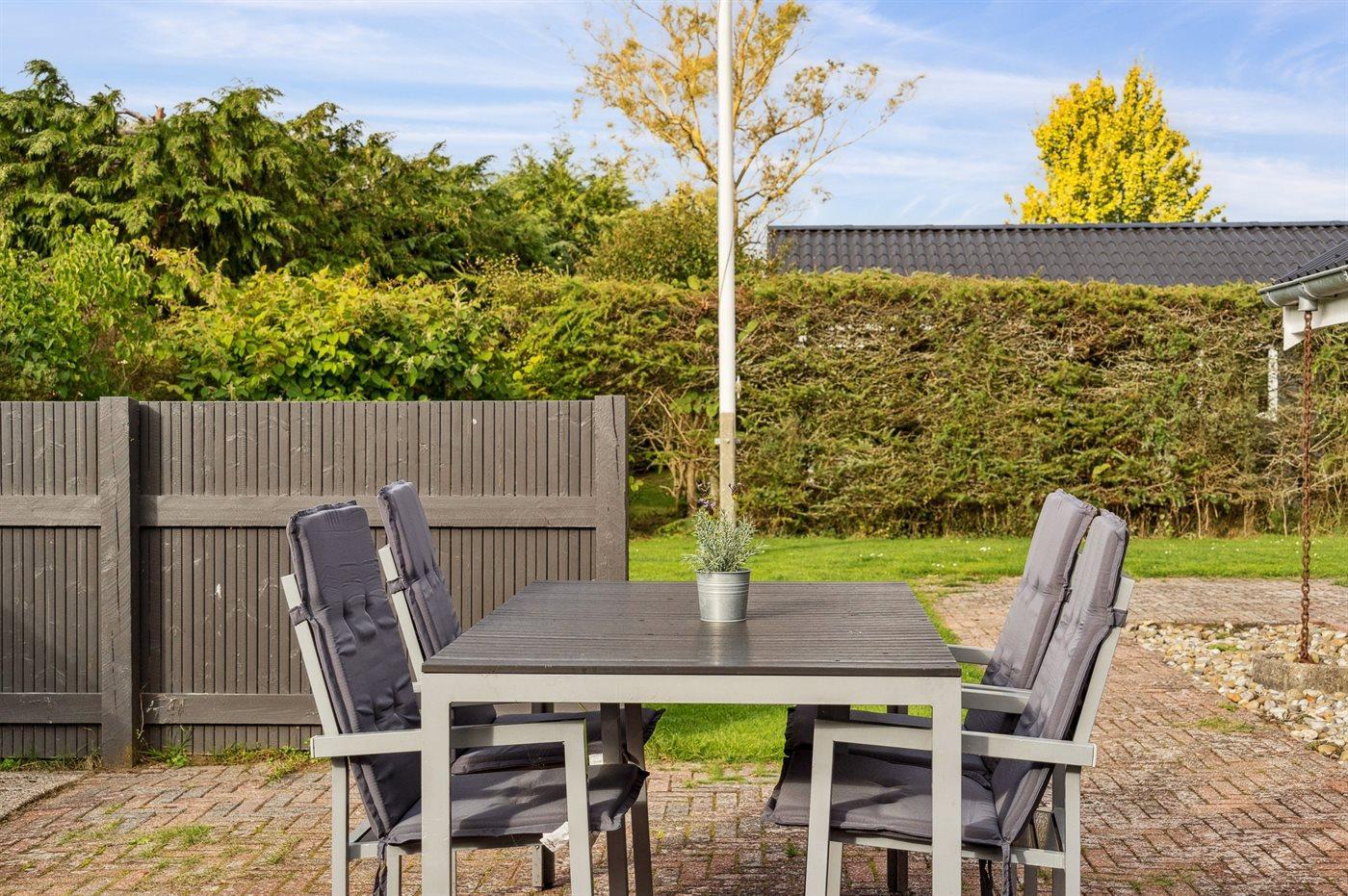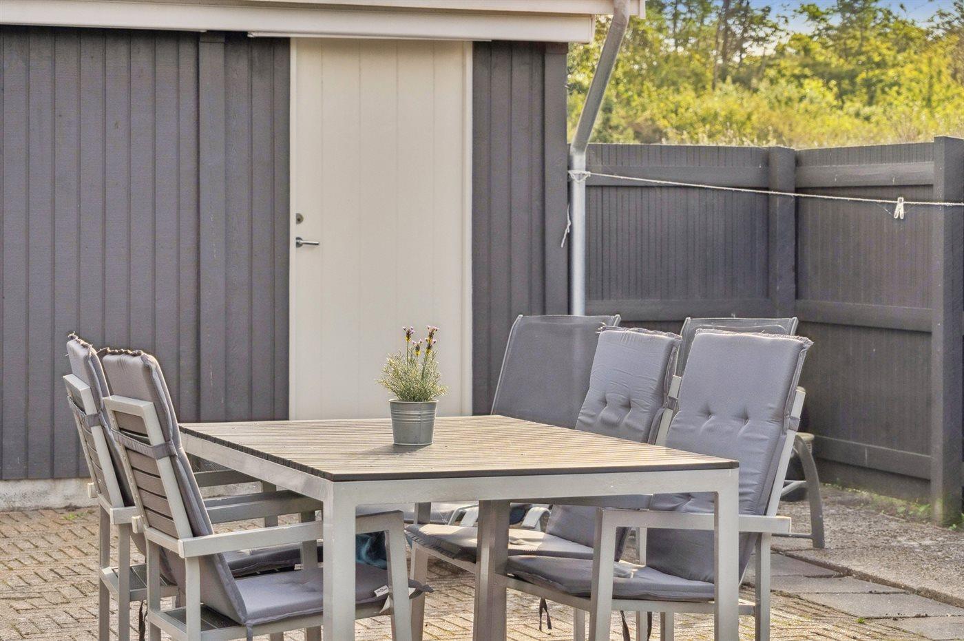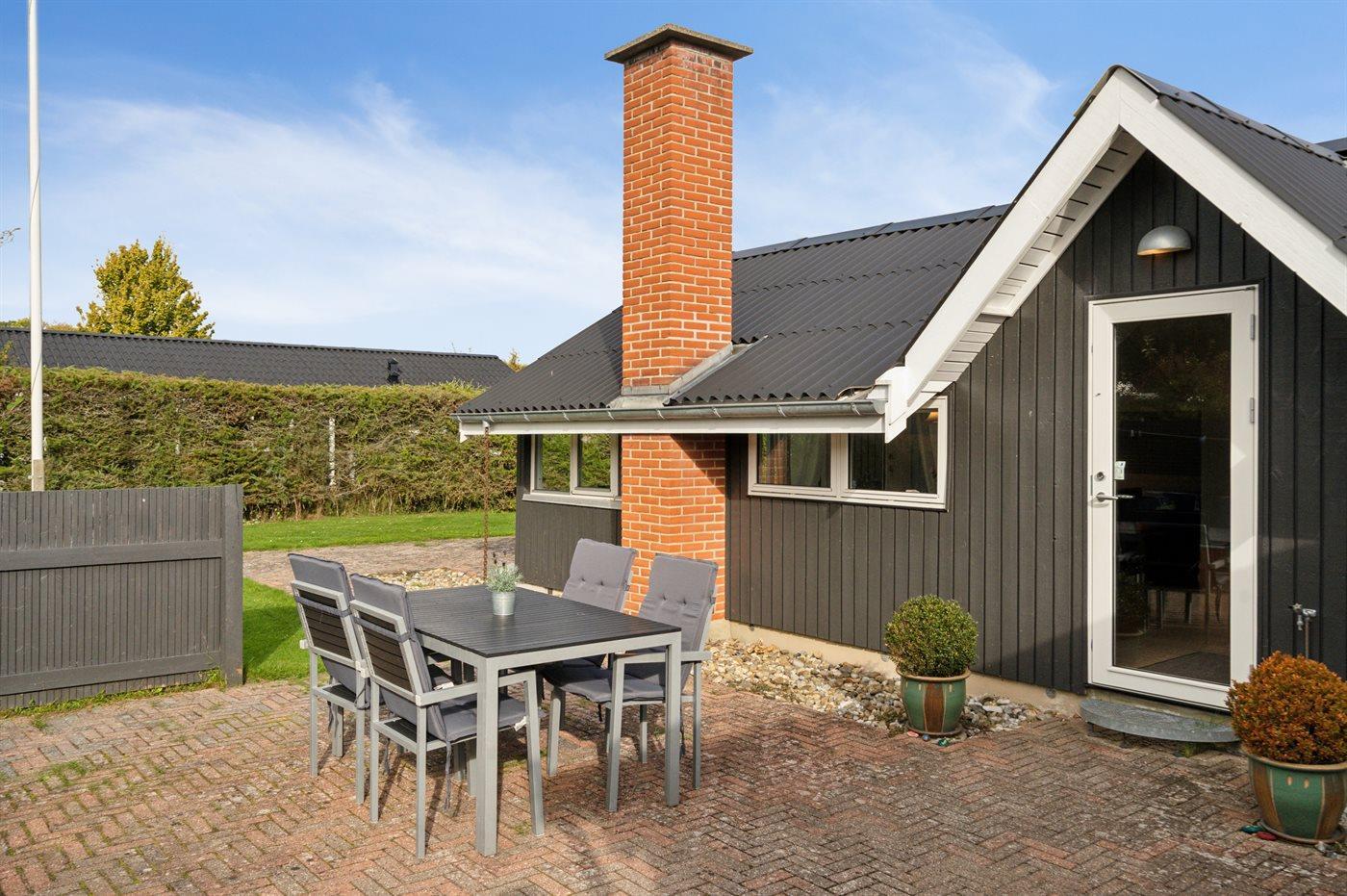 Sommerhuset er beliggende på en dejlig grund og med en overskuelig have. Der findes et dejligt, delvist overdækket terrasseareal - hvor det ofte er muligt at finde et hjørne i læ for vinden, og hvor du kan nyde solen og sidde med et glas vin eller en kop kaffe og slappe af i de fredelige og naturskønne omgivelser.