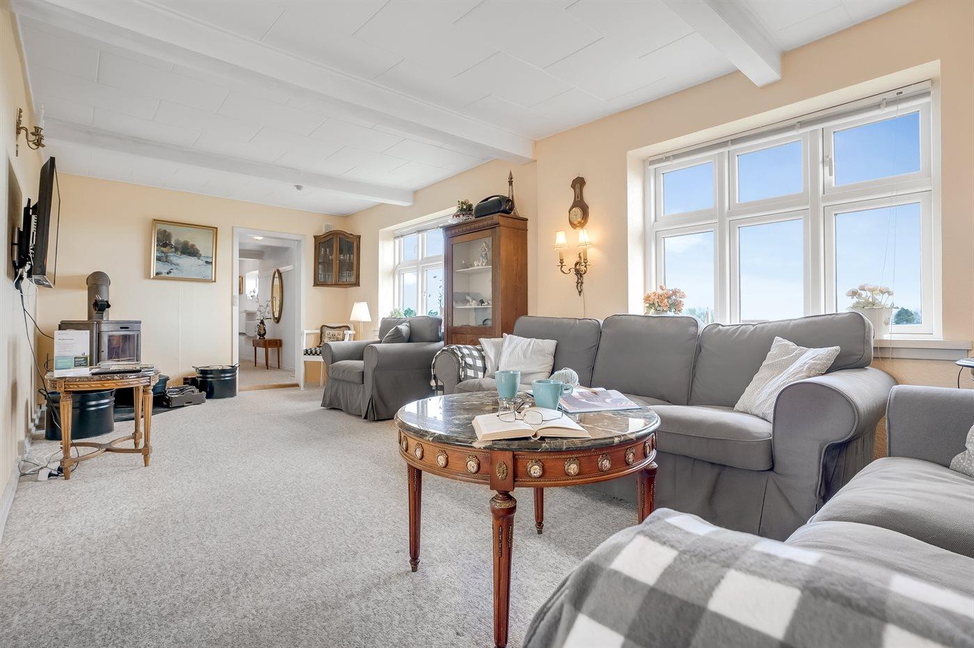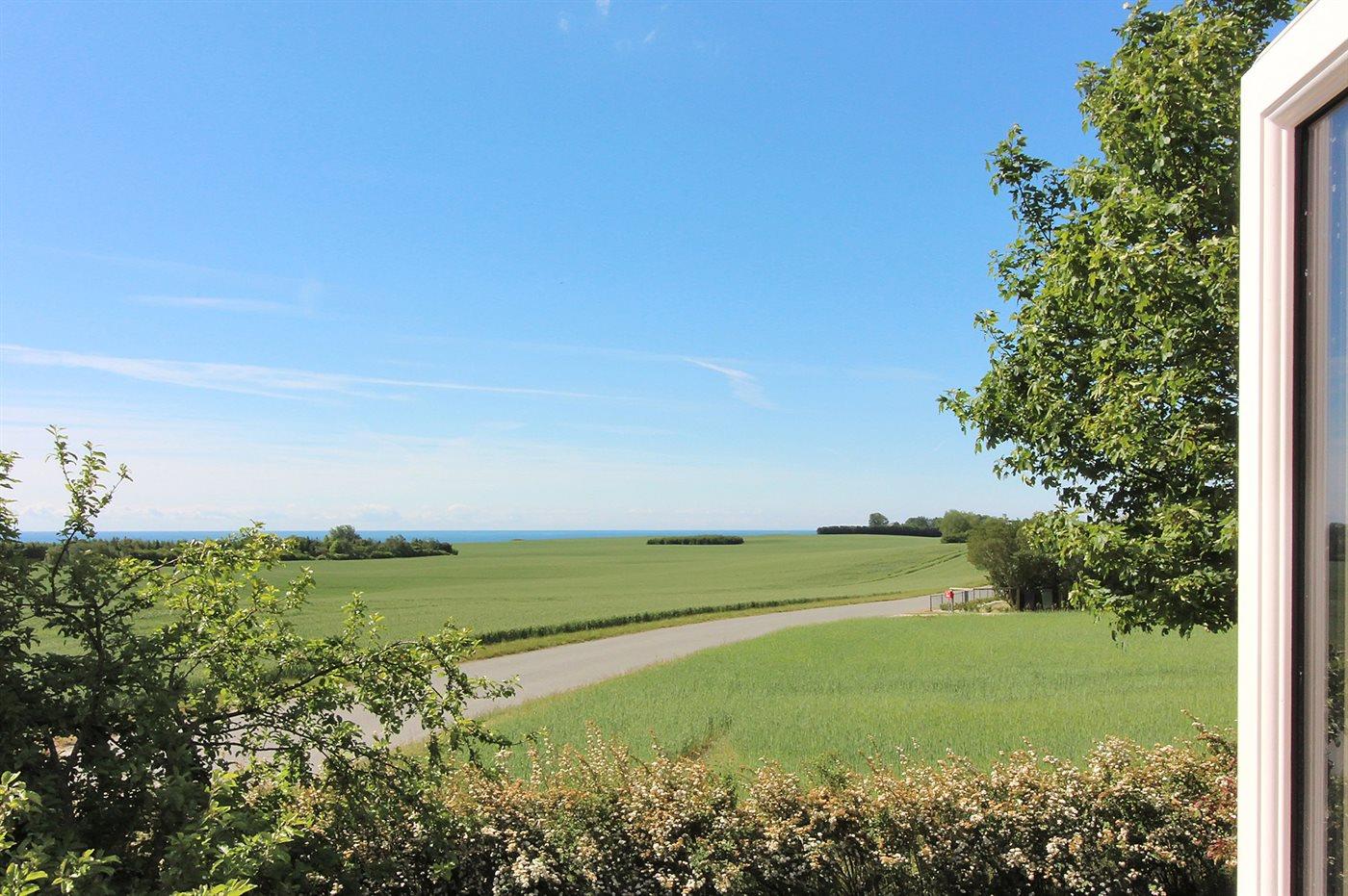 Et rummeligt sommerhus med havudsigt fra såvel hus som grund beliggende på landet omgivet af åbne marker i naturskønne omgivelser.