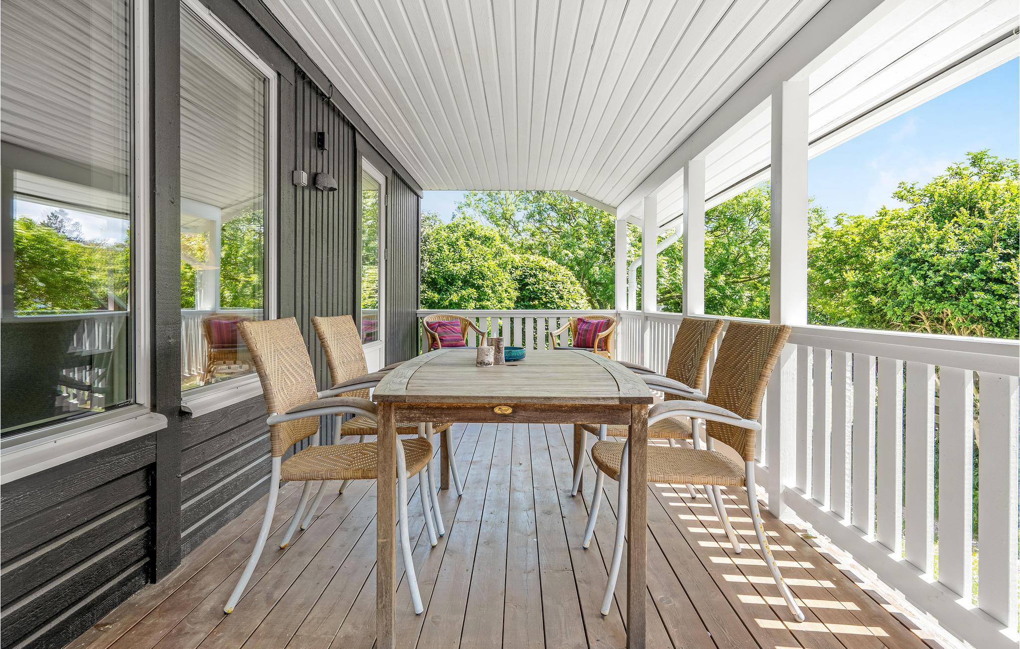 Fra stuen er der udgang til en klassisk veranda med hyggelige havemøbler. Sæt jer her med morgenkaffen og planlæg dagen i ro og mag. Når I har en ledig stund mellem oplevelserne, kan I også læne jer tilbage samme sted med en god bog eller spille en omgang petanque, mens ungerne hygger sig på græsplænen og i legehuset.