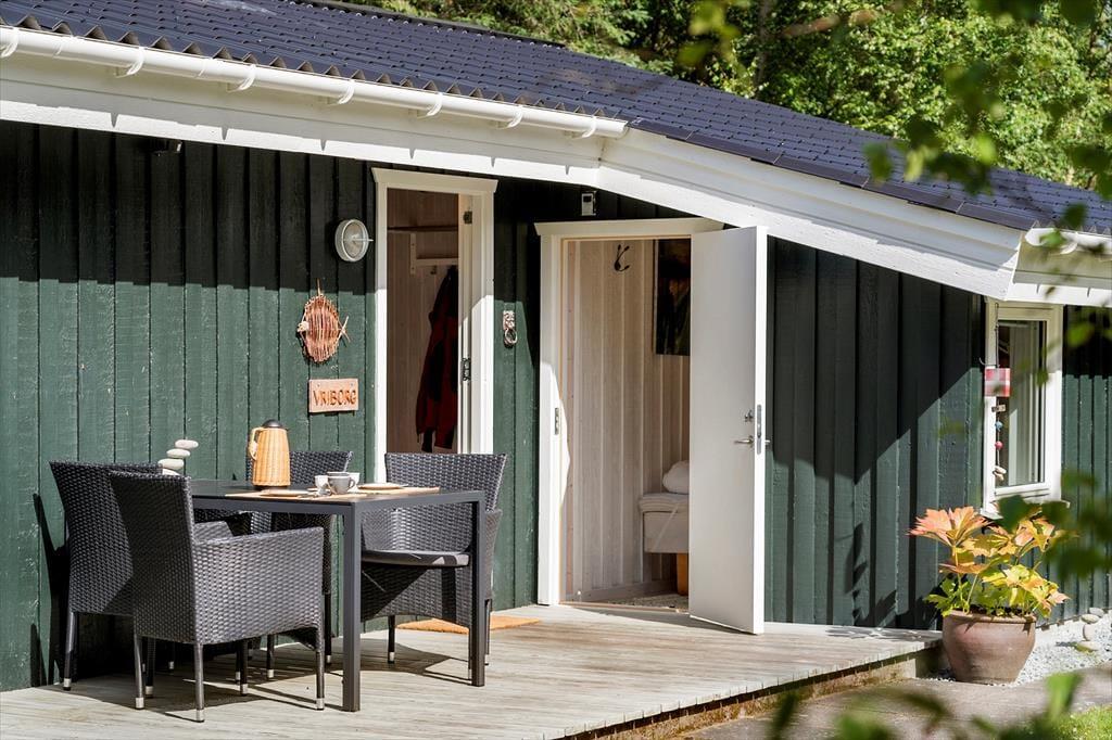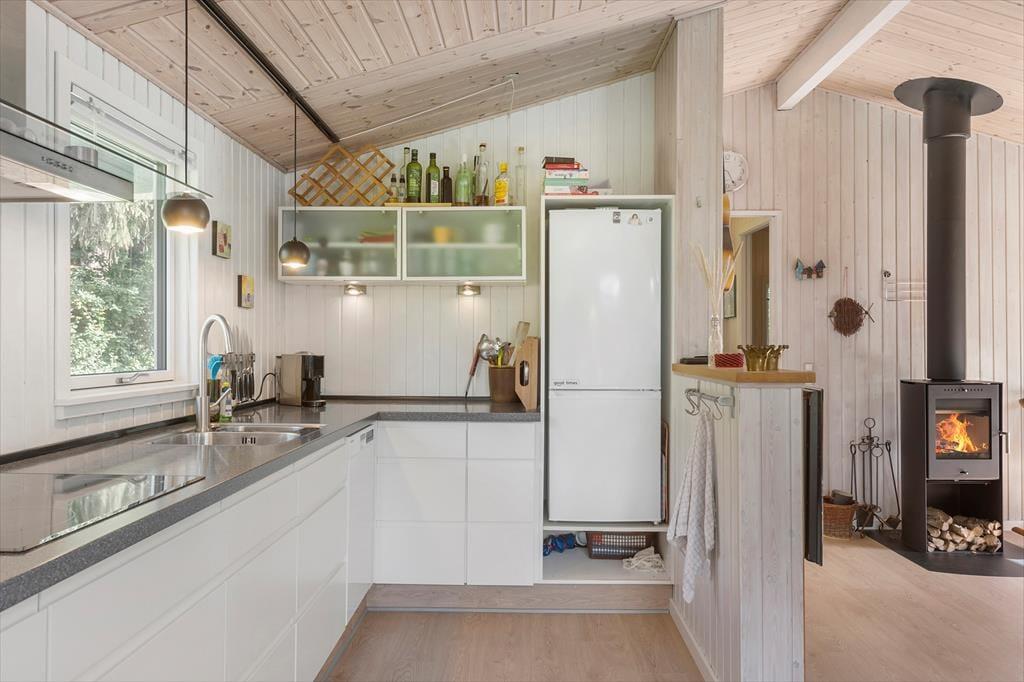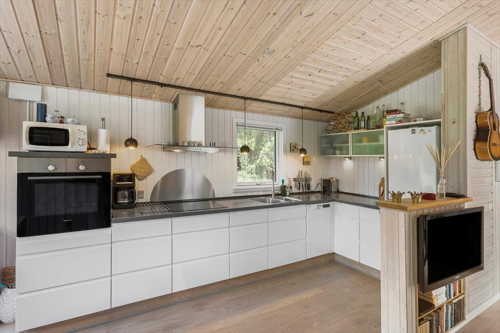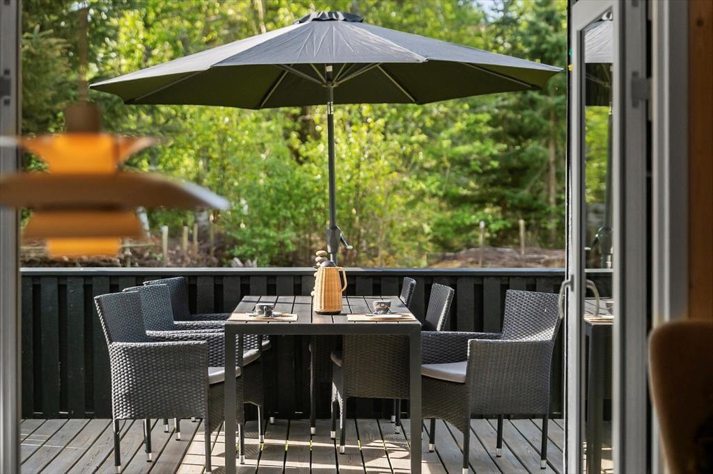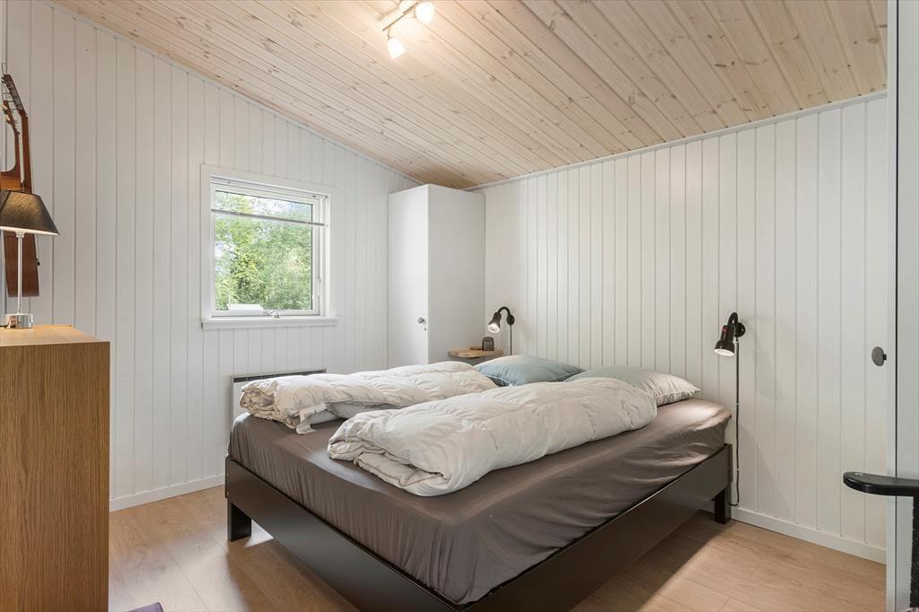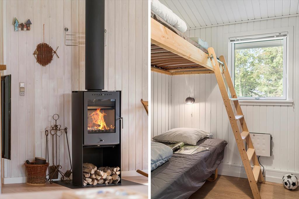 Sommerhuset passer godt til seks personer, for der er tre soveværelser at gøre godt med, hvoraf det ene ligger i annekset lige ud for entréen. Et badeværelse med bruser og vaskemaskine findes også i huset, og endelig er køkken og stue forenet, så det tilsammen fungerer som et hyggeligt opholdsrum, hvor både afslapning, madlavning og middage kan foregå. Er det køligt udenfor, kan I tage varmepumpen såvel som brændeovnen i brug, og på en solrig sommerdag er det måske mere oplagt at åbne havedøren på vid gab, så I har fri passage ud til den dejlige træterrasse.