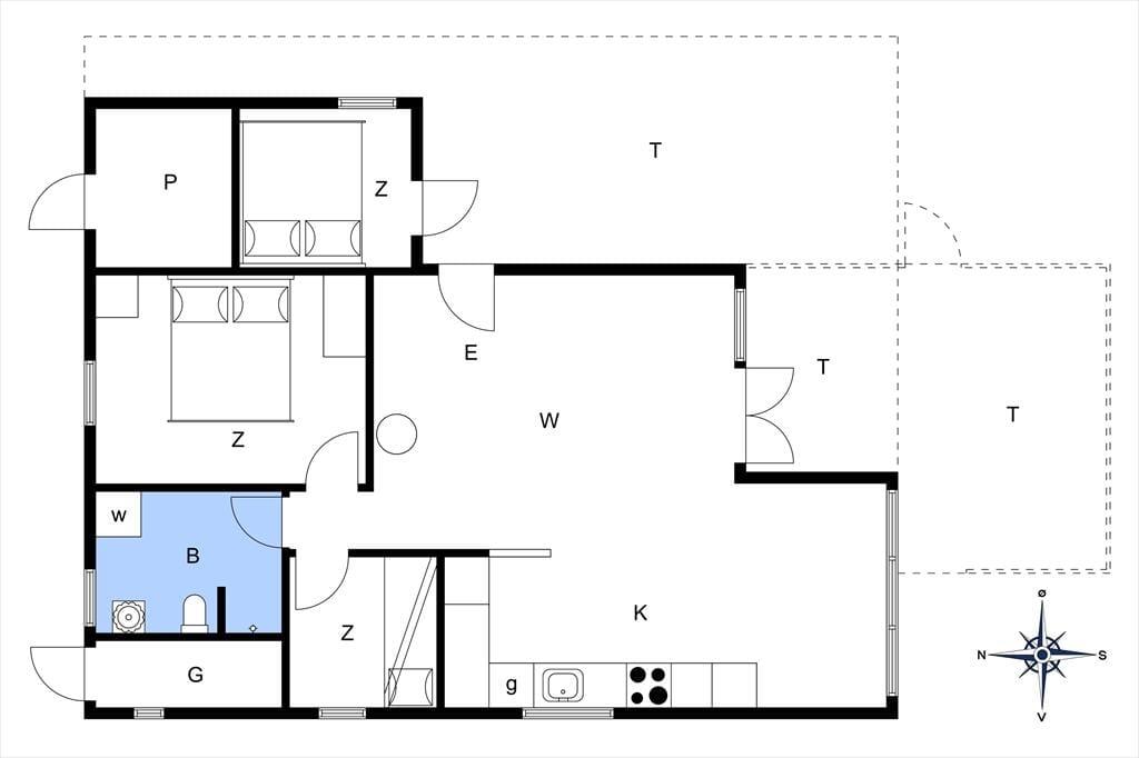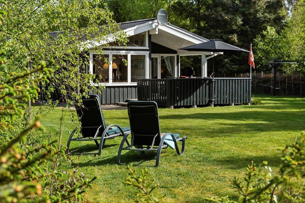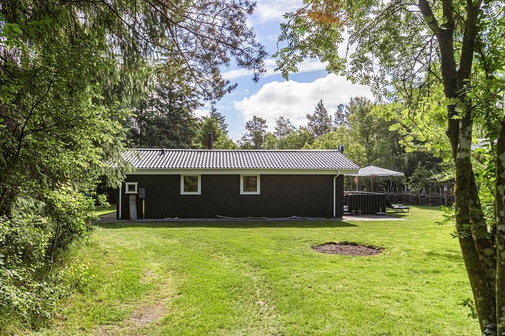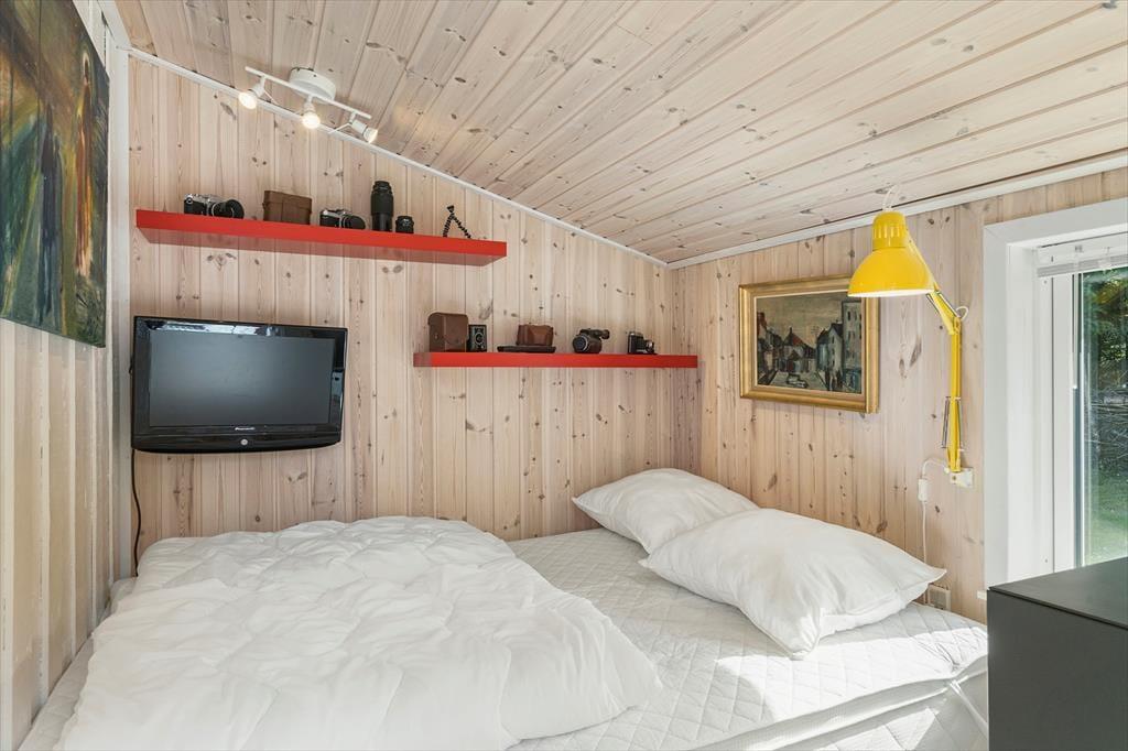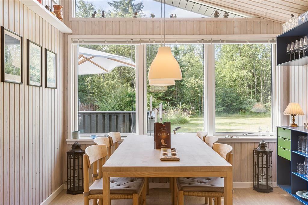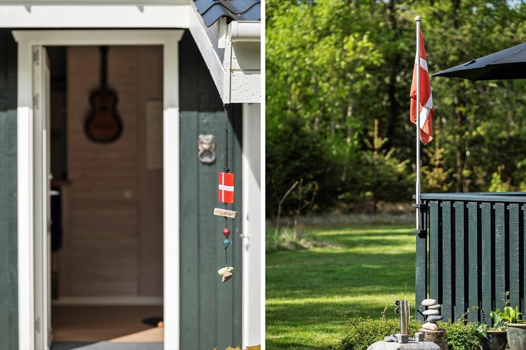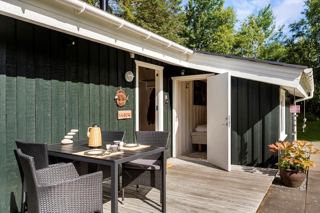 Sommerhuset passer godt til seks personer, for der er tre soveværelser at gøre godt med, hvoraf det ene ligger i annekset lige ud for entréen. Et badeværelse med bruser og vaskemaskine findes også i huset, og endelig er køkken og stue forenet, så det tilsammen fungerer som et hyggeligt opholdsrum, hvor både afslapning, madlavning og middage kan foregå. Er det køligt udenfor, kan I tage varmepumpen såvel som brændeovnen i brug, og på en solrig sommerdag er det måske mere oplagt at åbne havedøren på vid gab, så I har fri passage ud til den dejlige træterrasse.