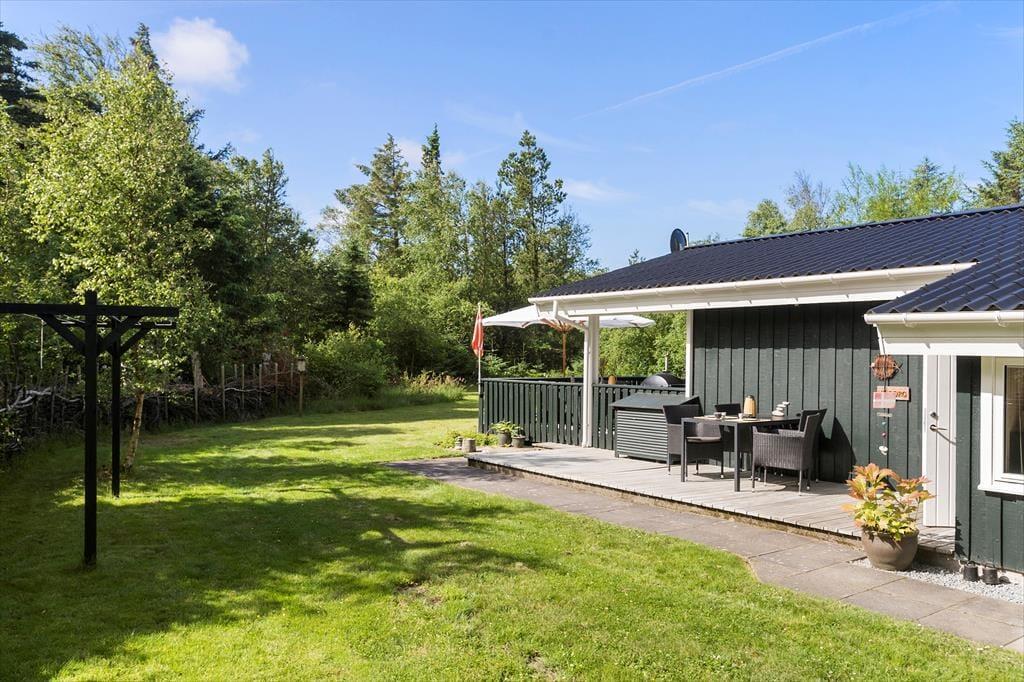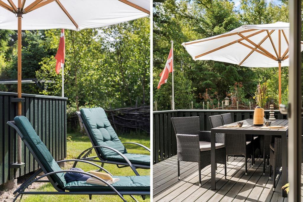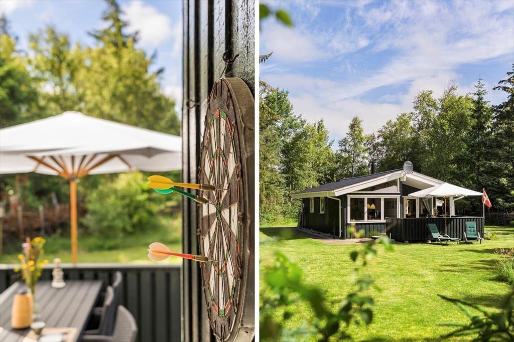 Nærmest stuen er terrassen overdækket, og ellers er det udendørs opholdsareal åbent, så det er muligt at finde både solrige og skyggefulde siddepladser. Græsplænen indbyder til havespil, og der er også dart, hvis I får lyst til at skyde til måls. Og uanset om det er tid til leg eller en tilbagelænet pause i havestolene, kan I nyde at bo dejligt ugeneret mellem naturgrundens mange træer.