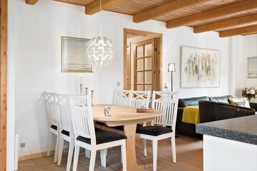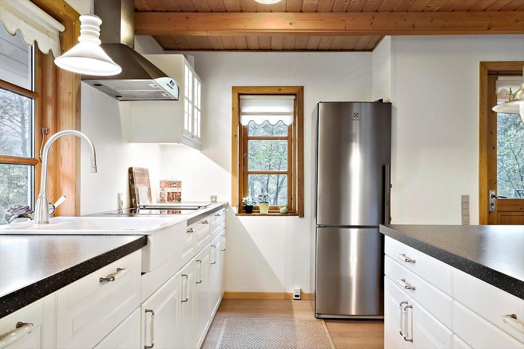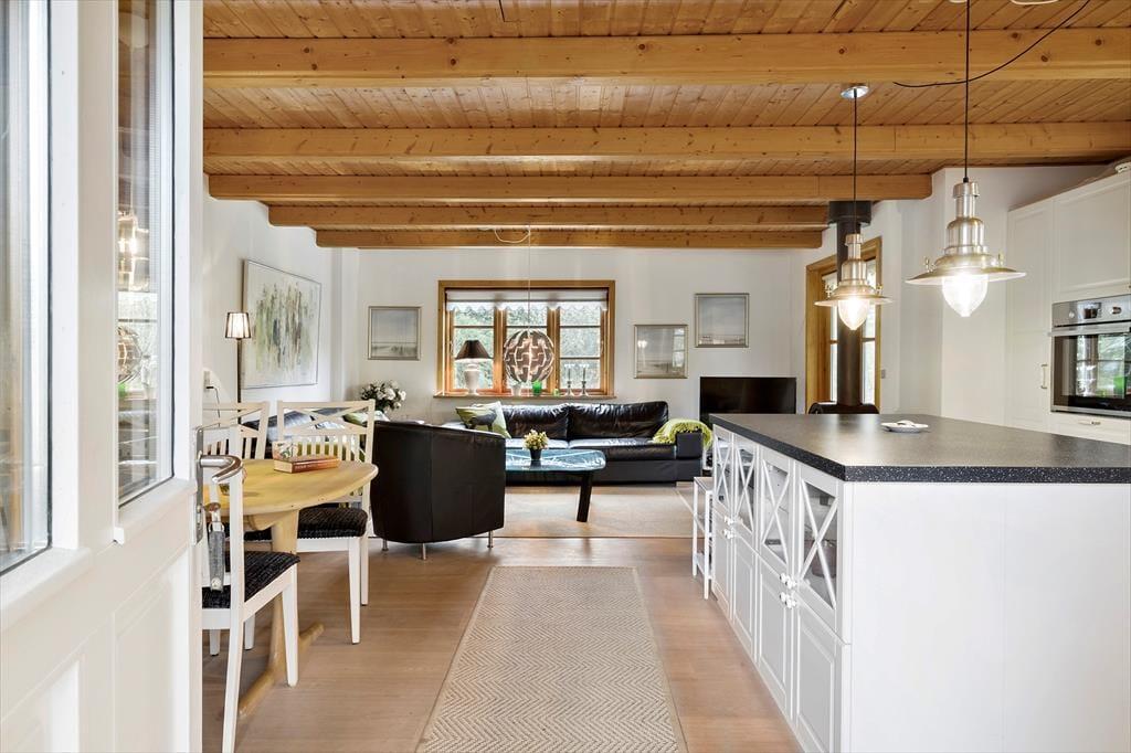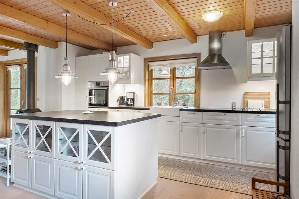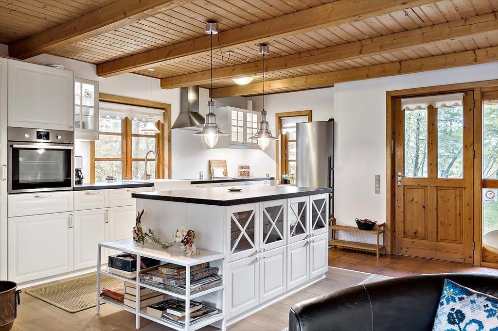 Sommerhuset er opført i 2001, måler 84 m2 og har en glimrende planløsning til seks personer. To soveværelser er begge indrettet med dobbeltseng, mens det tredje har køjeseng, og på badeværelset er der ikke bare gulvvarme og bruser, men også spabad og sauna. Er målet med ferien at komme helt ned i tempo, kan I med andre ord forkæle jer selv med en wellness-stund i ny og næ. Det er også ren velvære at slappe af i stuen, som er udstyret med brændeovn, komfortable møbler og tv med parabol – og hvis I kan lide at lave mad, kan I glæde jer til at kokkerere i det åbne køkken, som er indrettet med ovn i arbejdshøjde, opvaskemaskine og mange andre gode detaljer.