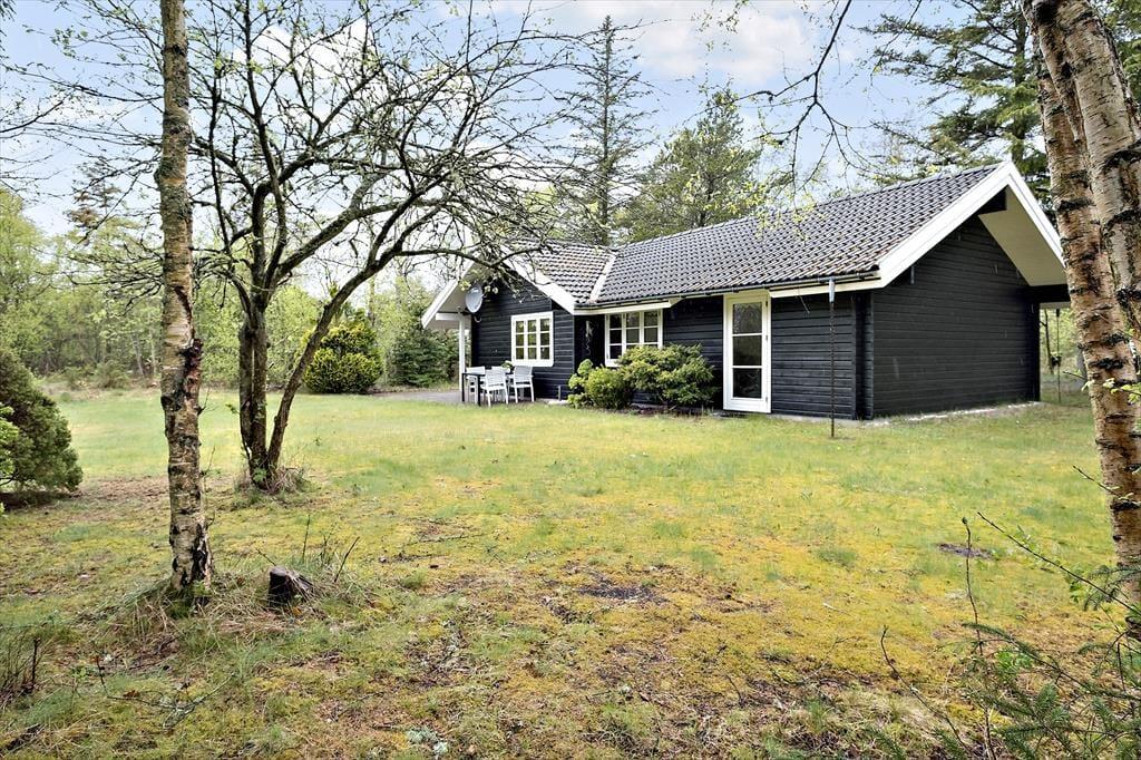 Fra sommerhuset har I udsigt til naturgrunden, og når vejret er godt, vil det smukke syn sikkert vække lysten til at rykke helt ud i det grønne. En delvist overdækket terrasse ligger lige ved huset, og derudover er der græsplæne, buske og høje, flotte træer på den 2212 m2 store og fredeligt beliggende grund.