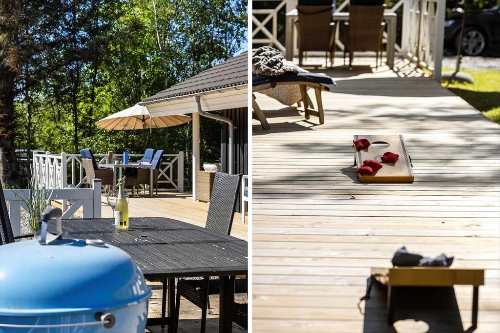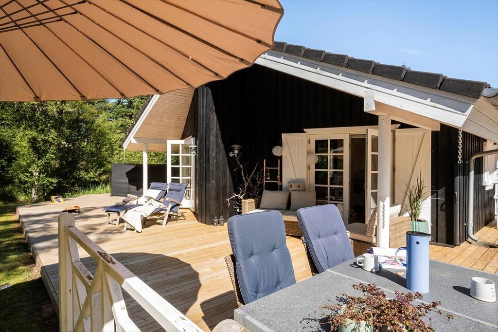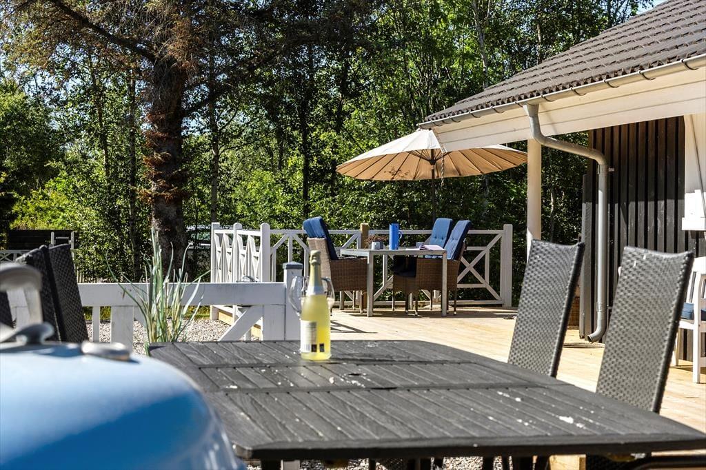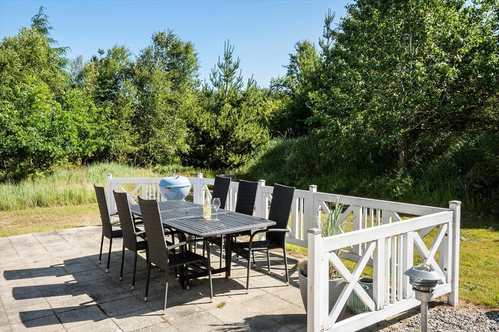 Huset er beliggende på fantastisk naturgrund. Omgivet af hegn og høje træer. Her er der virkelig base for fred og ro. Eller boldspil på den tilhørende plæne. Huset har terrasser på de tre af siderne, hvoraf en del er overdækket. Her kan man sidde og nyde vestenvindens brise i trætoppene eller lytter til fuglene. Her er der virkelig mulighed for at sidde ude og nyde de lange lyse sommeraftener med grillmad og et godt glas vin.