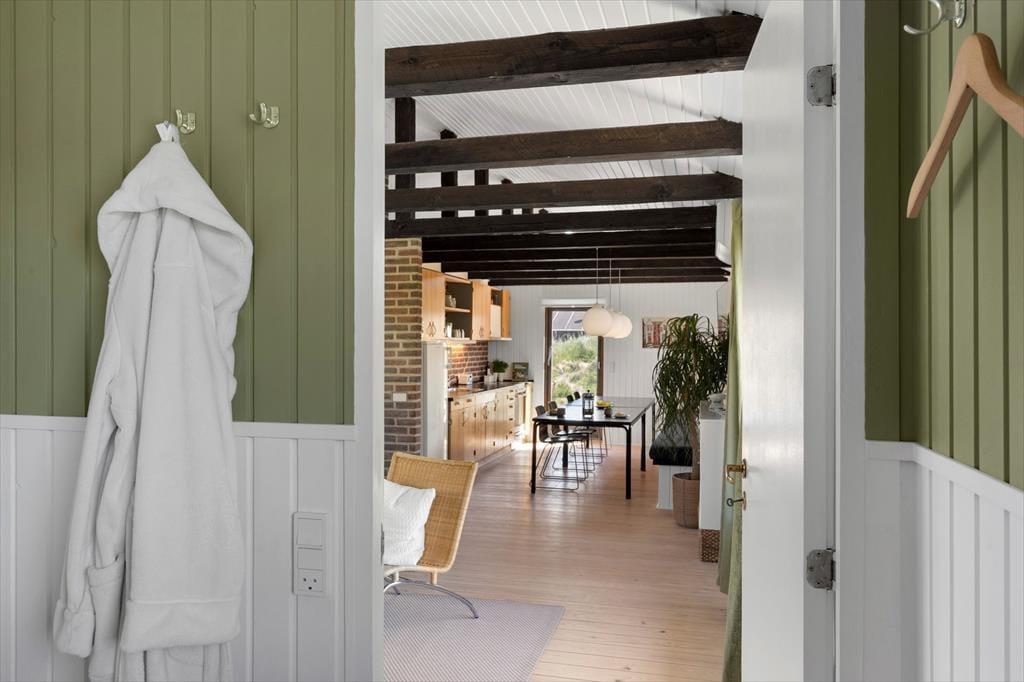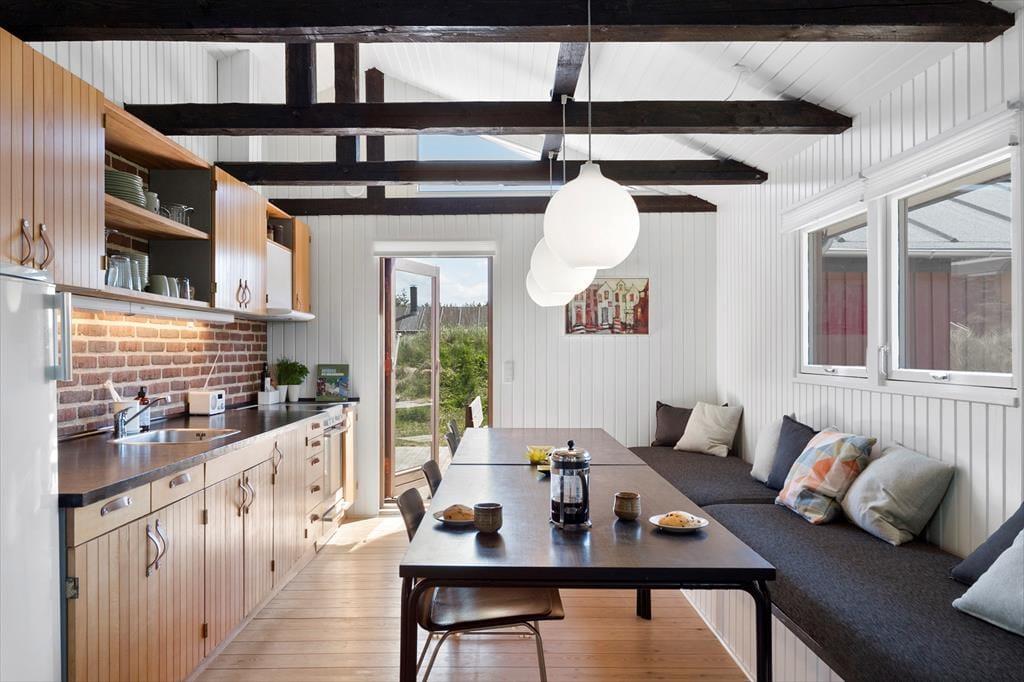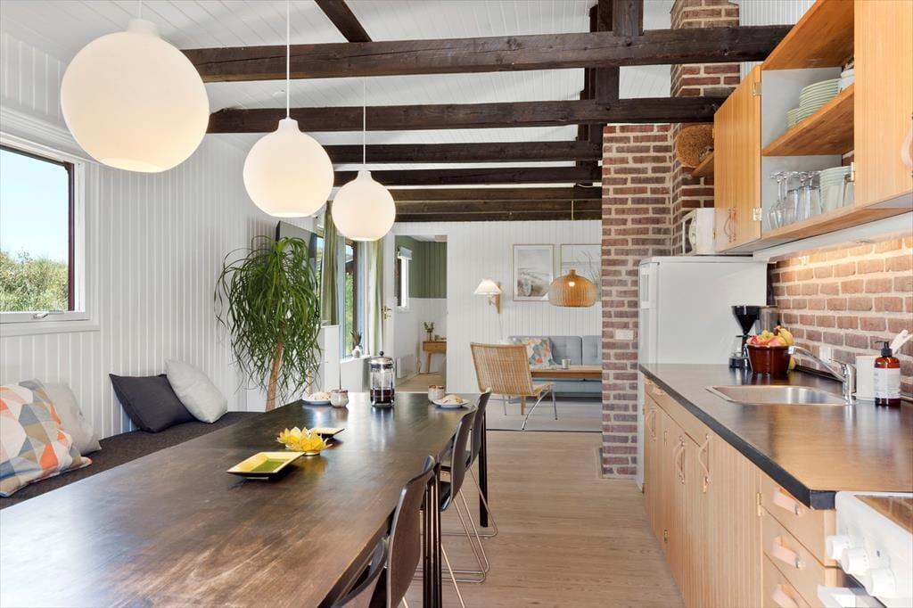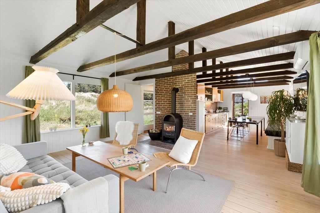 Det hyggelige sommerhus er indrettet med varme farver, fine detaljer og komfortable rammer, der gør det nemt at føle sig hjemme fra første øjeblik. I stuen kan I samles til brætspil, film eller en god snak, mens brændeovnen knitrer i baggrunden og kaster et varmt skær over rummet. Køkkenet ligger i åben forbindelse med stuen, så der er god kontakt, uanset om du dækker bord, læser avis eller smører frokost. Huset rummer to gode soveværelser – og har I brug for ekstra plads eller mulighed for at dele jer op, er annekset et oplagt sted at indrette sig med ro og privatliv. Alt i alt en rigtig god base til både små og store feriedrømme.