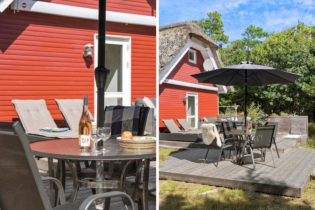 Flot rødt-hvidt stråtækt sommerhus på idyllisk og helt ugeneret beliggenhed i natursmukke Rødhus.