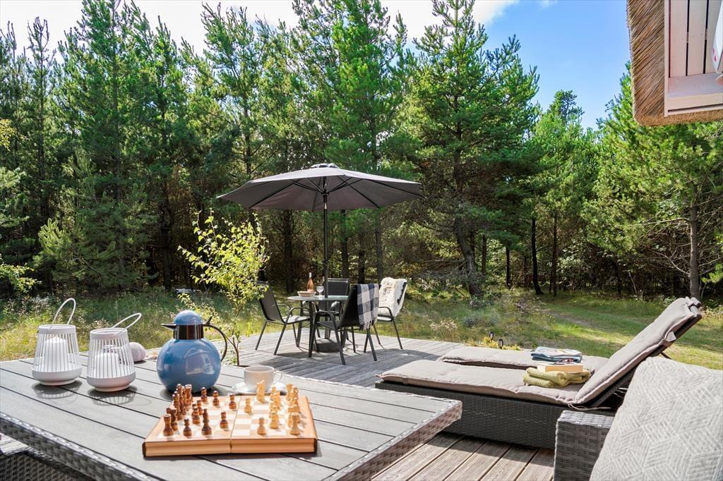 På den store naturgrund er der rigelig plads til afslapning og solbadning, og hvis I har børn med, kan de lege i sandkassen og spille bold på græsplænen. De høje træer, som omgiver grunden giver både god læ for vinden og ro og fred for naboer og forbipasserende; I kan færdes helt ugeneret her. Der er adgang til haven fra både stuen og køkkenet, og fra soveværelset kan I træde ud på en dejlig og delvist indhegnet træterrasse. Alle muligheder for mange skønne udetimer er til stede her!