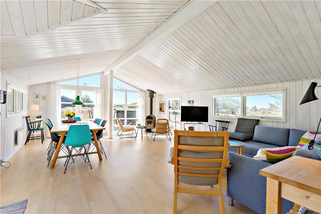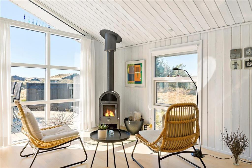 Når du træder indenfor i sommerhuset, mødes du af en lys og indbydende stue med højt til loftet, som skaber en åben og rummelig følelse. Brændeovnen tilføjer varme og hygge på de kølige aftener, og det store vinduesparti sørger for masser af naturligt lys og en smuk udsigt over naturgrunden. Køkkenet og alrummet er åbent og indbydende, så det er nemt at samles omkring madlavningen eller spille brætspil med familien. De hyggelige opholdsområder giver mulighed for både afslapning og samvær i dejlige rammer, mens du kan nyde den enkle og stilfulde indretning.
