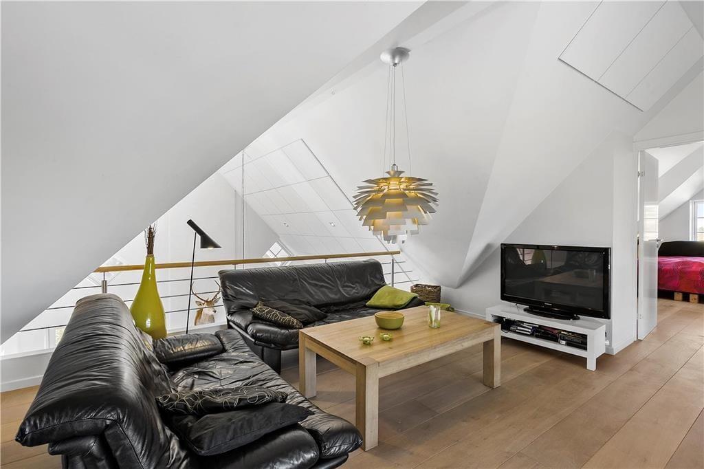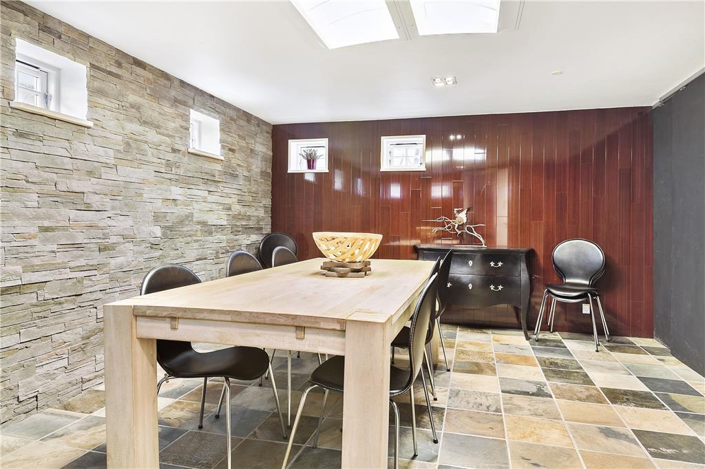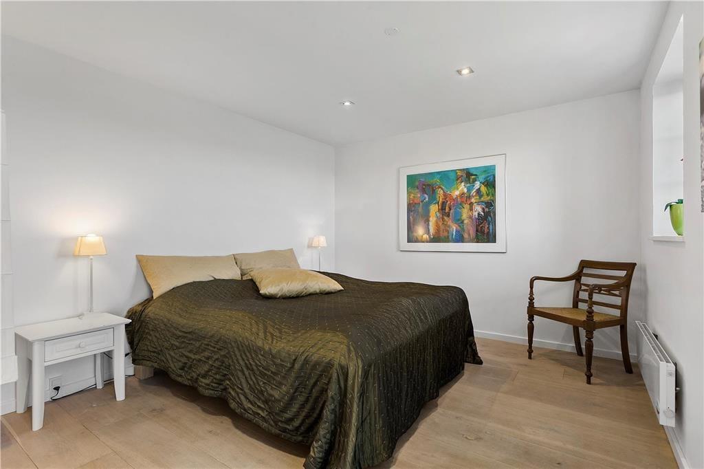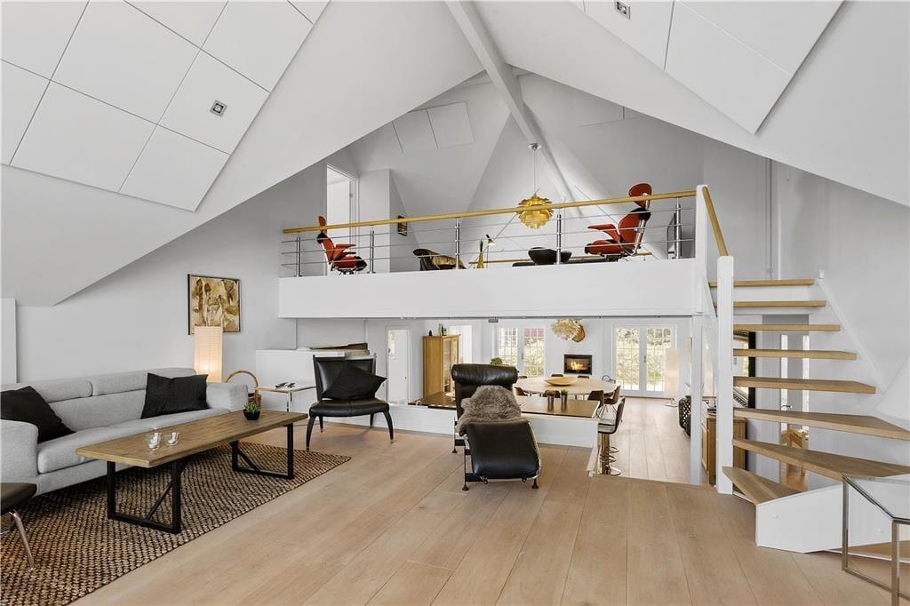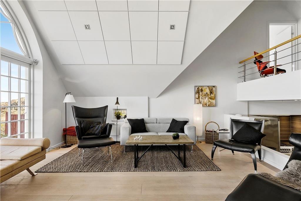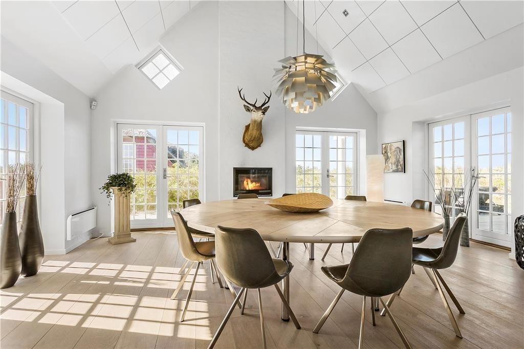 Når du træder indenfor i dette indbydende sommerhus, vil du blive mødt af lyse og åbne rum, der strækker sig over flere etager. Store vinduespartier i stuen giver et vidunderligt lysindfald og en betagende udsigt over havet. Stuen, der er opdelt i flere niveauer, indbyder til både samvær og afslapning. Her er det perfekte sted at samles med familien eller vennerne, enten omkring det store spisebord, der giver plads til festlige måltider, eller i den hyggelige sofagruppe foran brændeovnen. De åbne forbindelser mellem opholdsrum og køkken gør det muligt at dele både hyggelige stunder og madlavning – alt imens havets brusen kan høres i baggrunden.