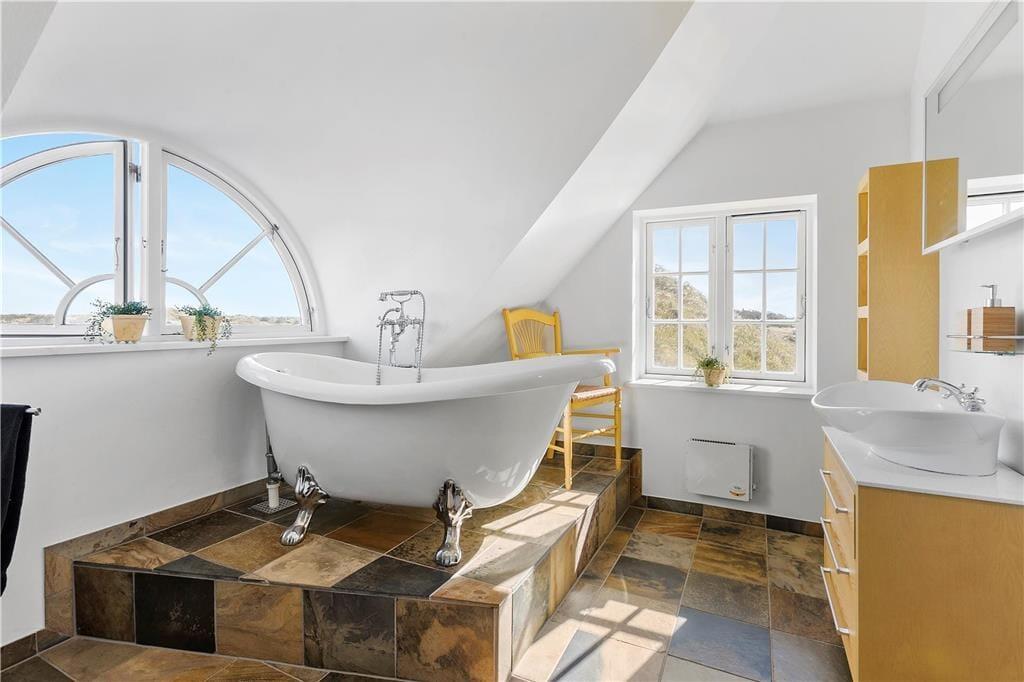 Beliggenheden af dette sommerhus er virkelig noget særligt. Lige ved foden af de smukke klitter og tæt på stranden er det nemt at tage en dukkert i Vesterhavet eller gå en lang tur langs kysten. Omgivelserne tilbyder ikke kun ro og natur, men også oplevelser for hele familien. Blokhus by er blot en kort køretur væk, og der er masser af muligheder for at spise ude, shoppe eller besøge attraktioner som Fårup Sommerland, der ligger lige i nærheden. Med husets nærhed til både natur og byliv får du det bedste af begge verdener.