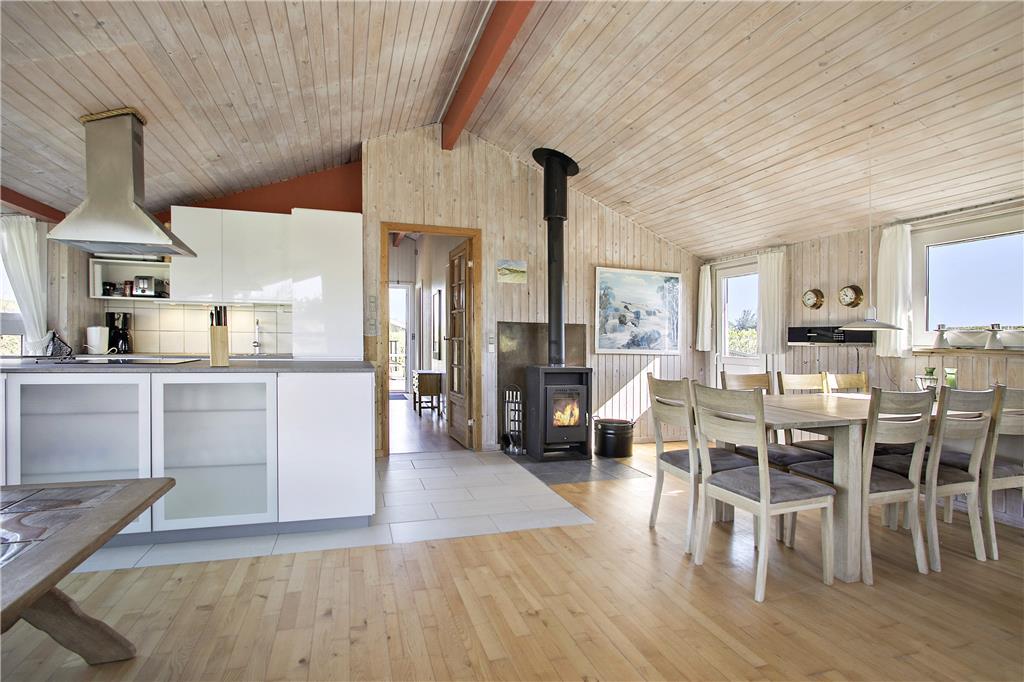 Indenfor venter et lyst og rummeligt sommerhus, der har alt, hvad du behøver for at skabe en afslappende ferie. De store vinduespartier i stuen gør det muligt at nyde lyset og udsigten til naturen omkring huset. I den åbne stue og køkken-alrum kan du tilbringe hyggelige timer sammen med familie og venner, og brændeovnen er perfekt til at skabe en hyggelig stemning, når det er tid til at slappe af efter en aktiv dag. Den hyggelige alkove giver dig et ekstra privat hjørne til ro og fordybelse. Sommerhuset byder på et funktionelt og velindrettet køkken, så du nemt kan forberede måltider til dine nærmeste, mens du stadig er tæt på fællesskabet i stuen.