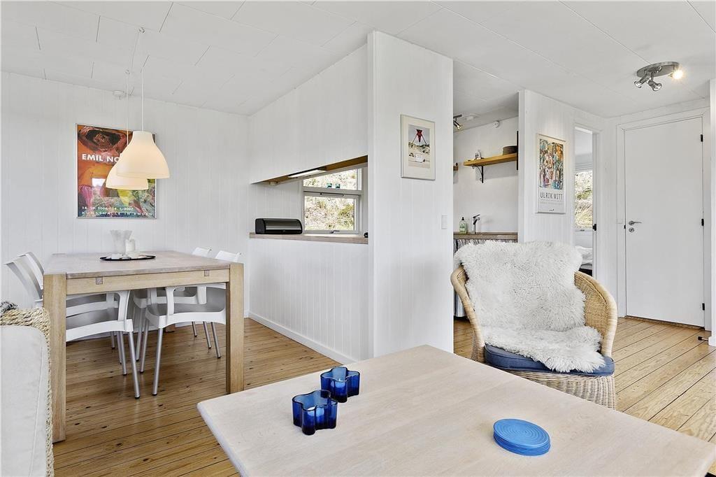 Indenfor får du en følelse af hjemlig hygge, når du træder ind i de lyse og indbydende rum. Sommerhuset er perfekt indrettet til par, og den åbne opholdsstue skaber en behagelig atmosfære, hvor I kan slappe af sammen efter en dag ude i naturen. Der er masser af naturligt lys, som strømmer ind gennem de store vinduer, og den afslappede indretning gør det nemt at skabe de bedste rammer for en afslappende ferie. Det åbne køkken er ideelt til at tilberede simple måltider og hygge sig over en god middag sammen.